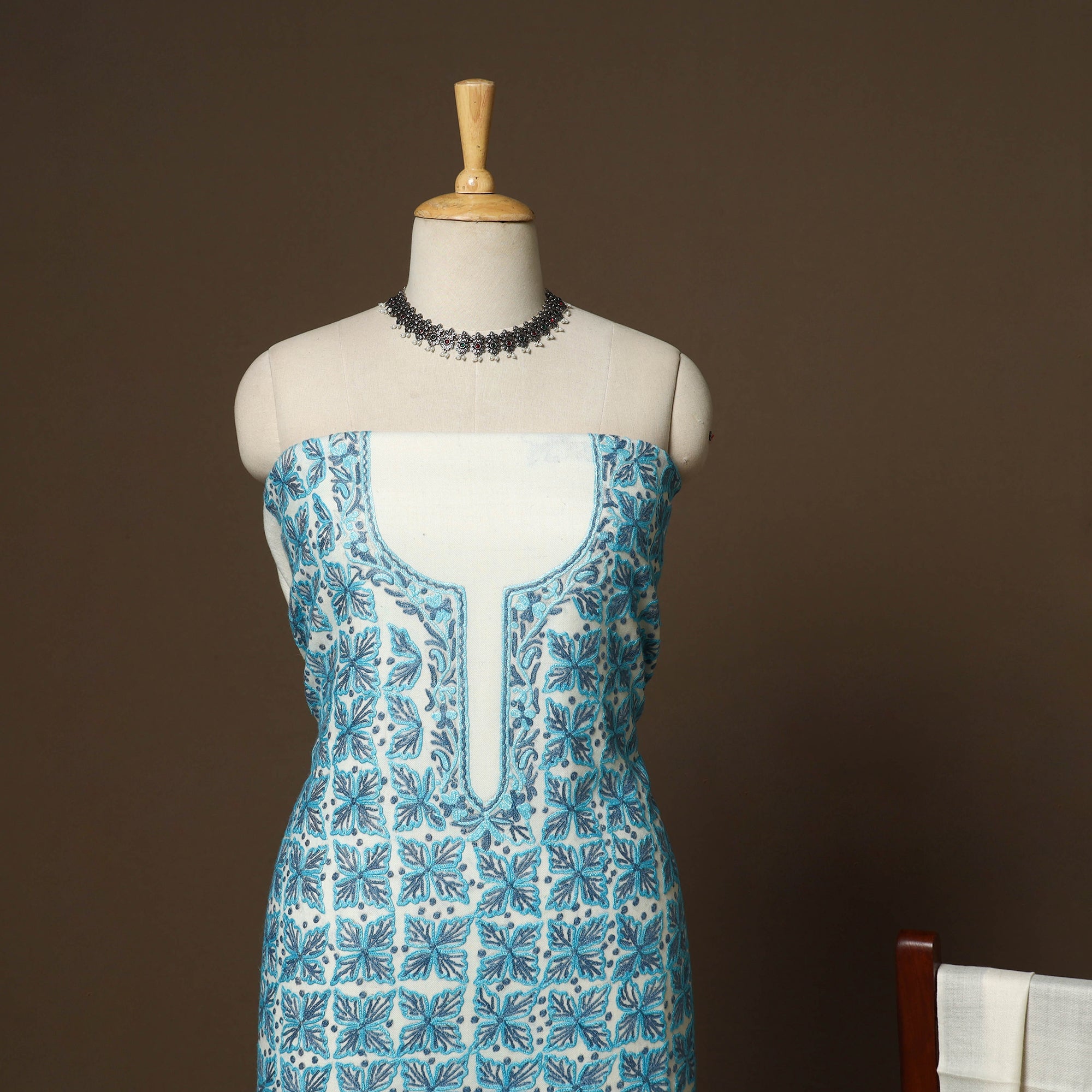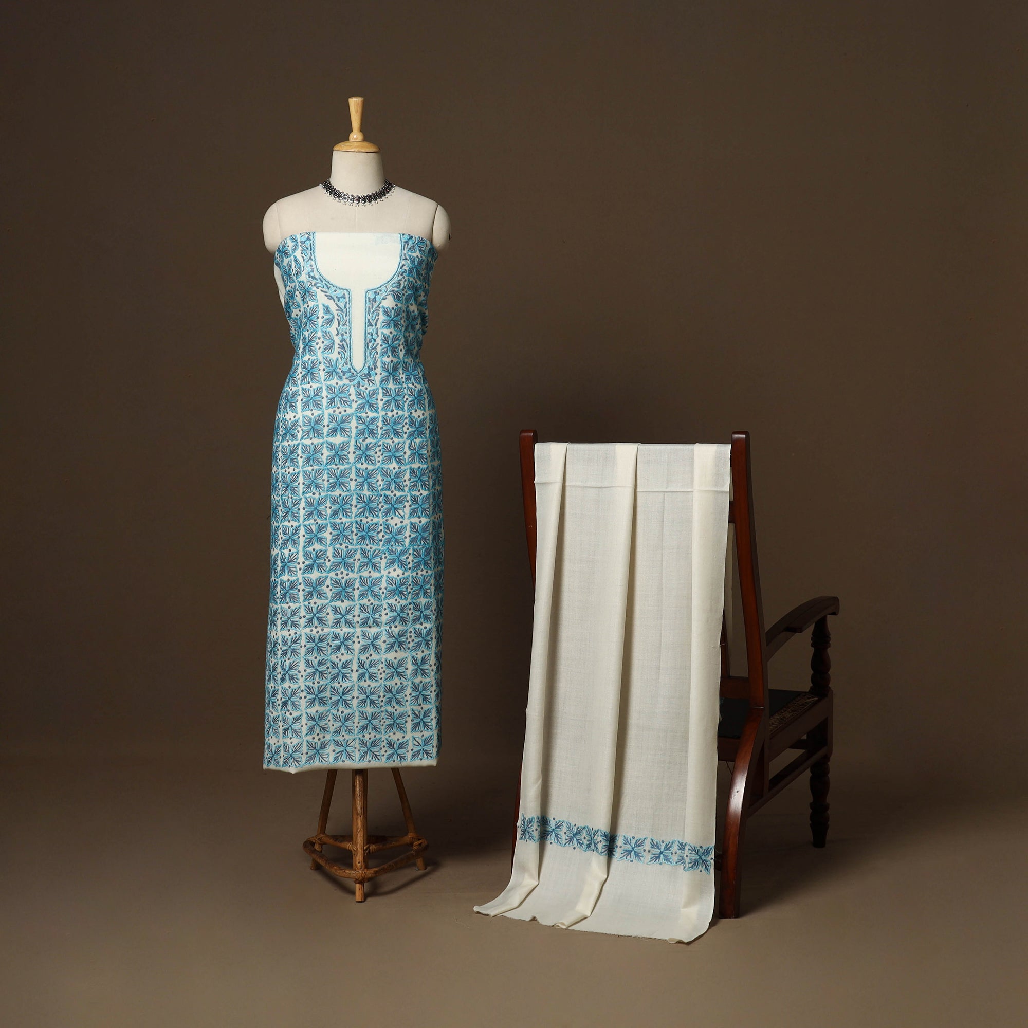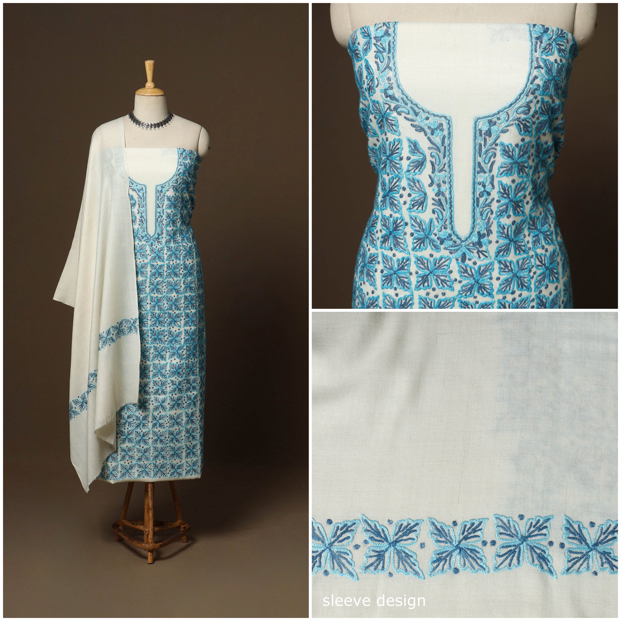 This blue kashmiri handwoven dress material set is crafted from merino wool and beautifully embellished with delicate heavy sozni hand embroidery. The process begins with sketching fine motifs on the fabric, followed by careful thread selection and traditional stitches like satin, chain, and the signature Sozni style. Each piece takes months of patient work by skilled artisans, making it a true representation of Kashmiri artistry. The 3pc unstitched set includes a kurta fabric, bottom fabric, and a dupatta, giving you the freedom to style it your way. Soft, warm, and versatile, it is perfect for festive occasions, elegant daily wear, or gifting as a piece of Kashmiri tradition.