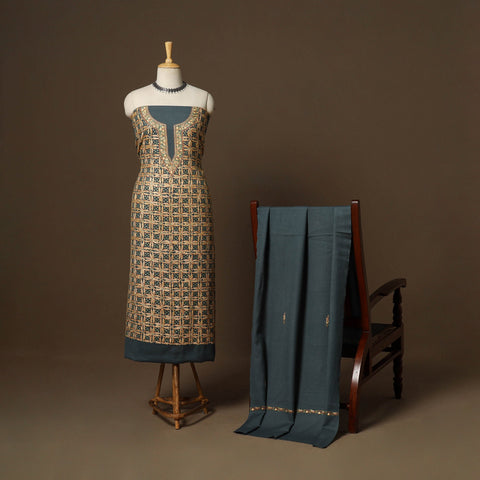 This beige kashmiri handwoven dress material set is crafted from merino wool and beautifully embellished with delicate heavy sozni hand embroidery. The process begins with sketching fine motifs on the fabric, followed by careful thread selection and traditional stitches like satin, chain, and the signature Sozni style. Each piece takes months of patient work by skilled artisans, making it a true representation of Kashmiri artistry. The 3pc unstitched set includes a kurta fabric, bottom fabric, and a dupatta, giving you the freedom to style it your way. Soft, warm, and versatile, it is perfect for festive occasions, elegant daily wear, or gifting as a piece of Kashmiri tradition.