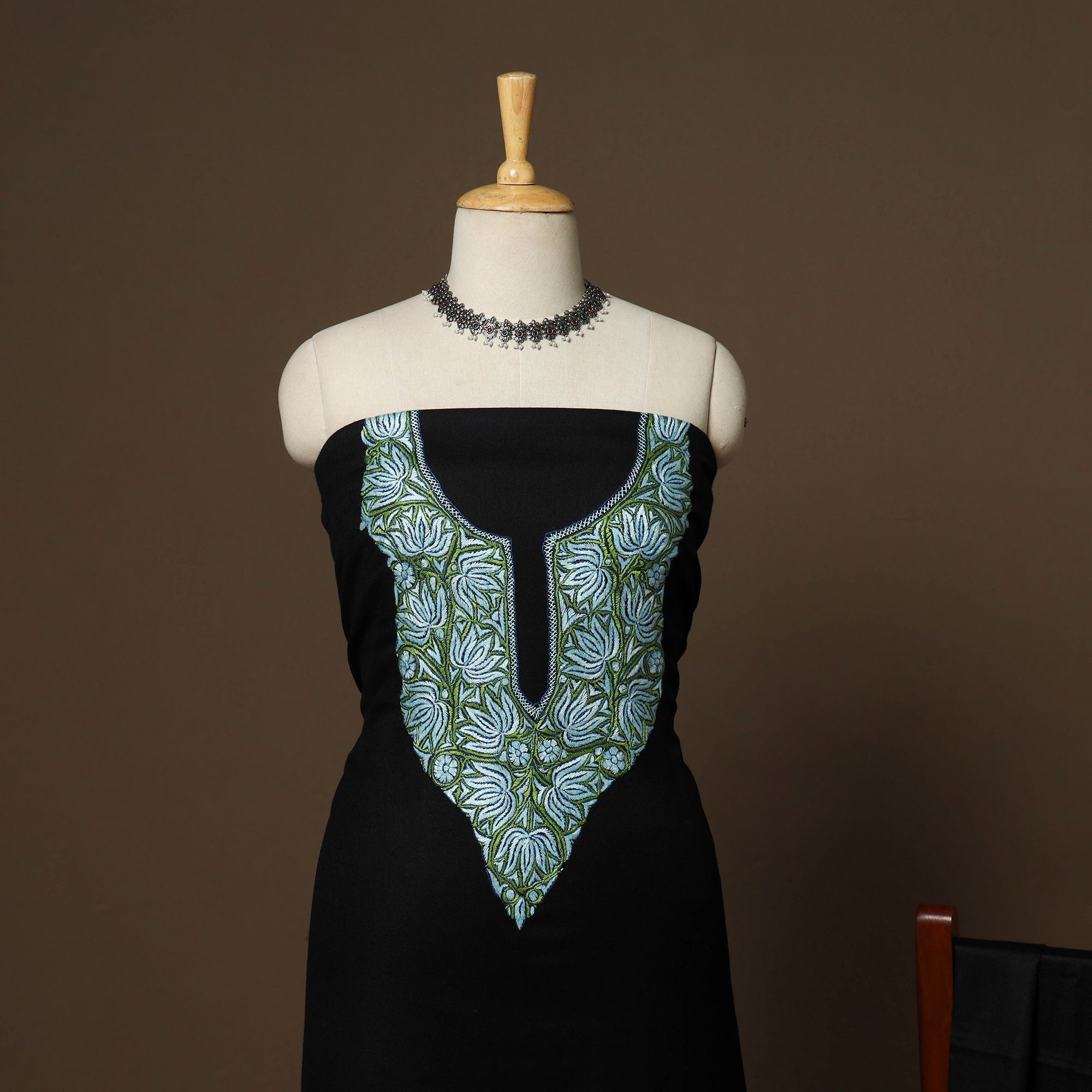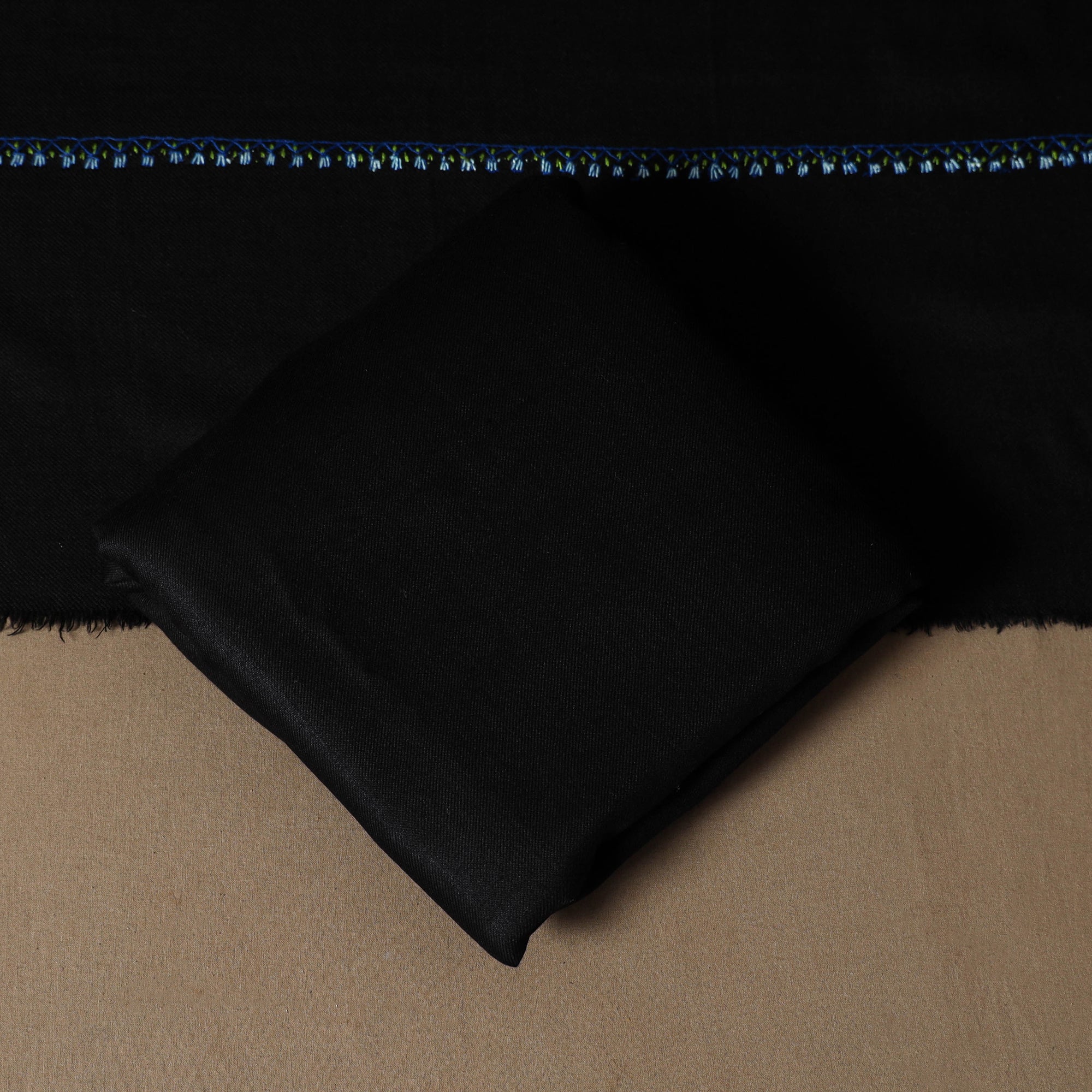 This black kashmiri handwoven dress material set is crafted from merino wool and beautifully embellished with delicate sozni hand embroidery. The process begins with sketching fine motifs on the fabric, followed by careful thread selection and traditional stitches like satin, chain, and the signature sozni style. Each piece takes months of patient work by skilled artisans, making it a true representation of kashmiri artistry. The 3pc unstitched set includes a kurta fabric, bottom fabric, and a dupatta, giving you the freedom to style it your way. Soft, warm, and versatile, it is perfect for festive occasions, elegant daily wear, or gifting as a piece of kashmiri tradition.