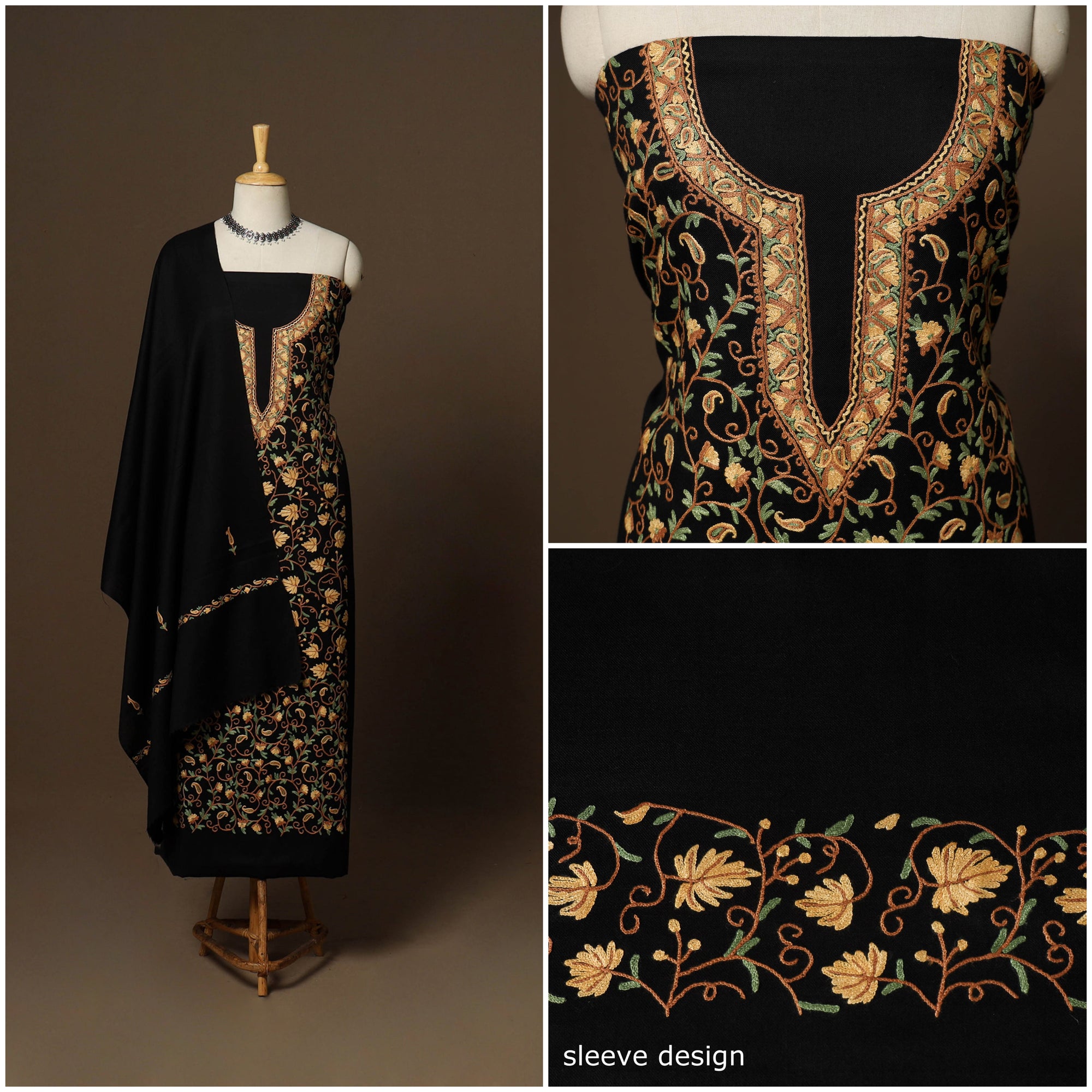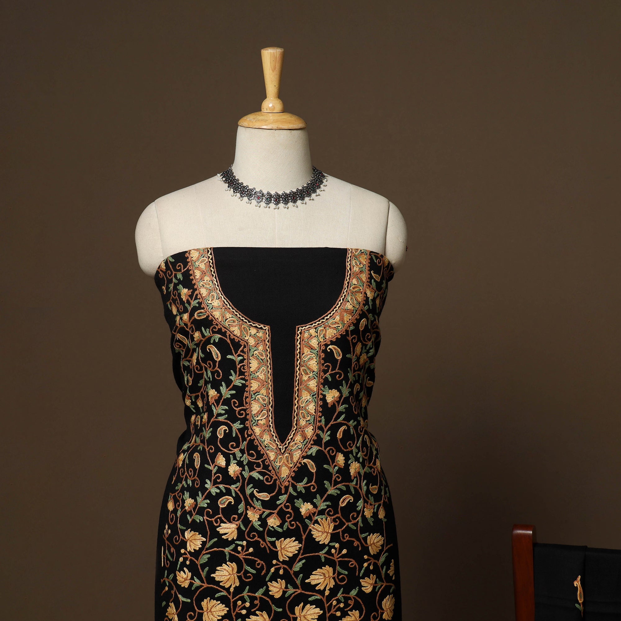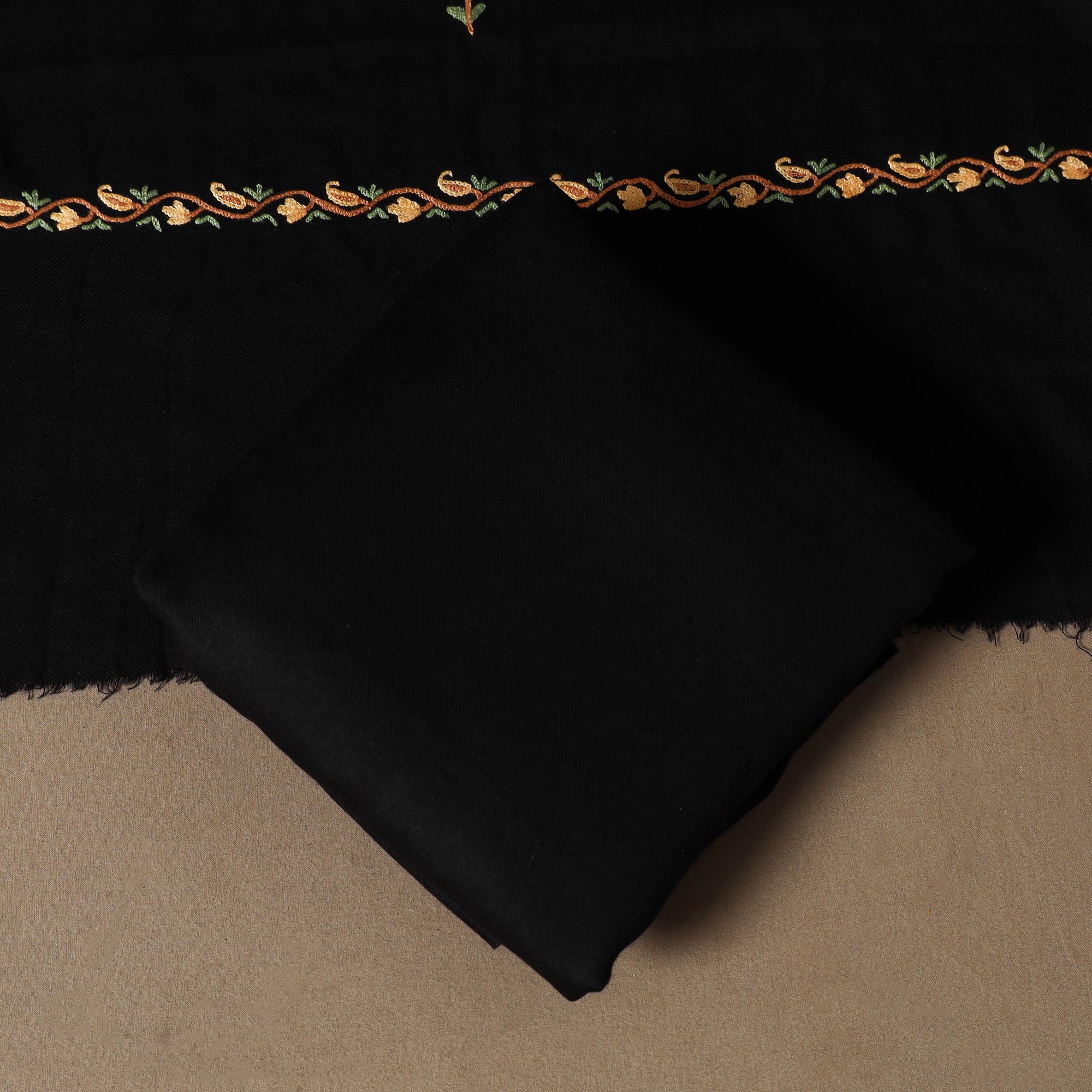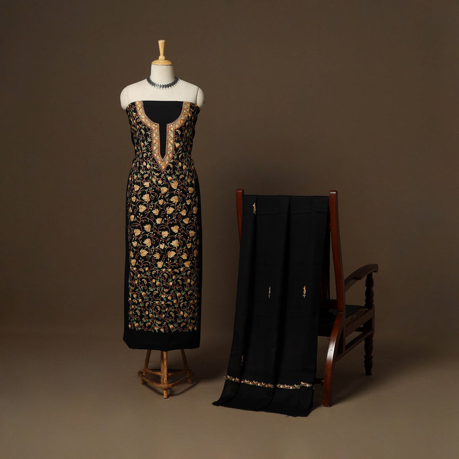 This black kashmiri handwoven dress material set is crafted from merino wool and beautifully embellished with delicate sozni hand embroidery. The process begins with sketching fine motifs on the fabric, followed by careful thread selection and traditional stitches like satin, chain, and the signature sozni style. Each piece takes months of patient work by skilled artisans, making it a true representation of kashmiri artistry. The 3pc unstitched set includes a kurta fabric, bottom fabric, and a dupatta, giving you the freedom to style it your way. Soft, warm, and versatile, it is perfect for festive occasions, elegant daily wear, or gifting as a piece of kashmiri tradition.