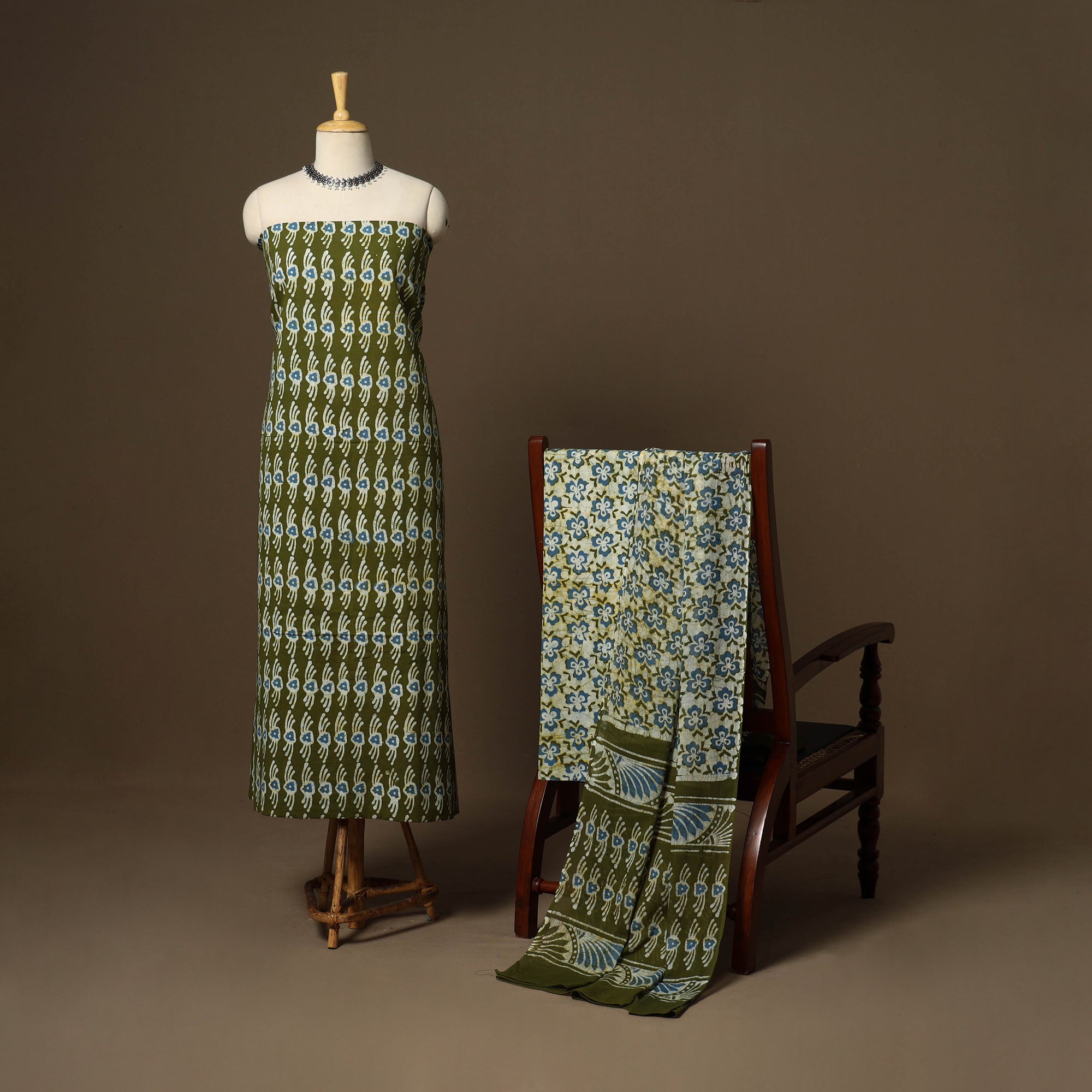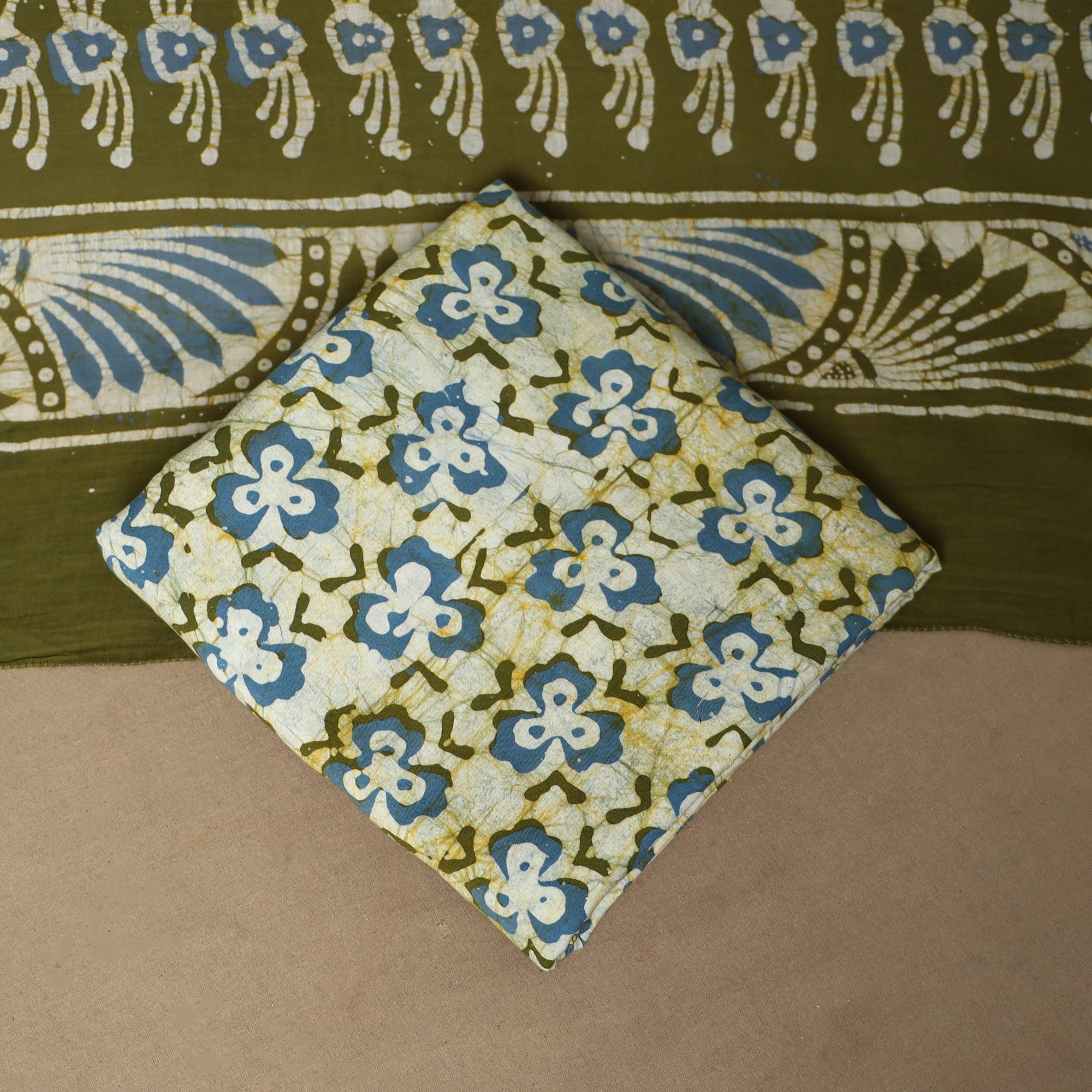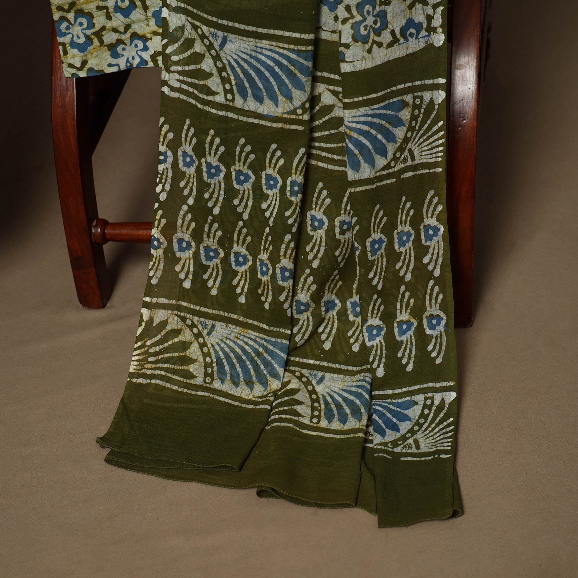This 3pc cotton kutch green batik print dress material, crafted in Kutch using traditional wax-resist dyeing techniques. Batik offers both durability and comfort, making it a perfect choice for everyday or festive wear. The vibrant colors and intricate designs make this set a statement piece.