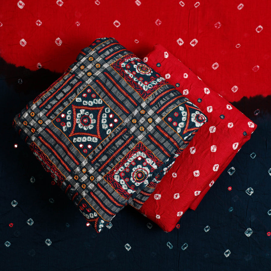 Experience the charm of this 3pc blue Kutch cotton bandhani dress material, beautifully adorned with intricate sequin work and detailed hand embroidery. Crafted using the traditional tie-dye technique, each piece showcases unique and artistic patterns, skillfully created by expert artisans. This set includes a satin cotton kurta, bottom fabric, and a matching dupatta, offering a perfect balance of elegance and comfort. Ideal for festive occasions, cultural gatherings, or casual outings, this ensemble effortlessly blends tradition with modern sophistication.