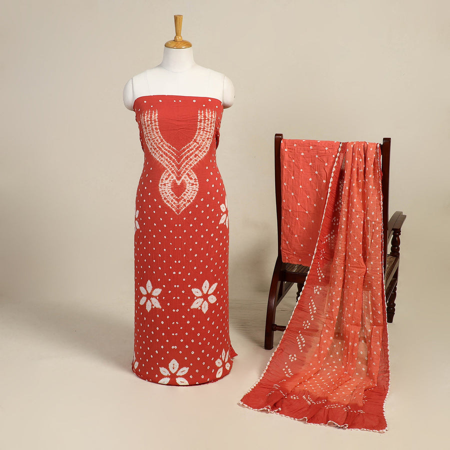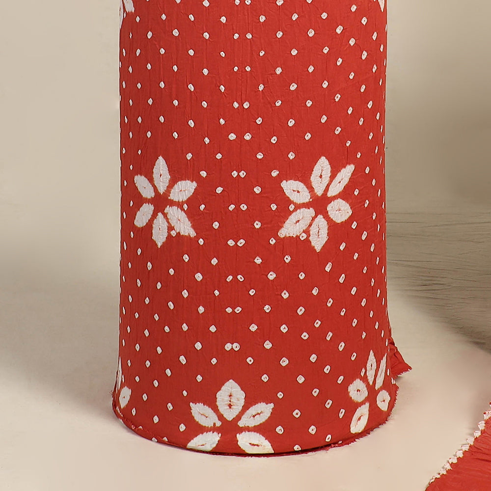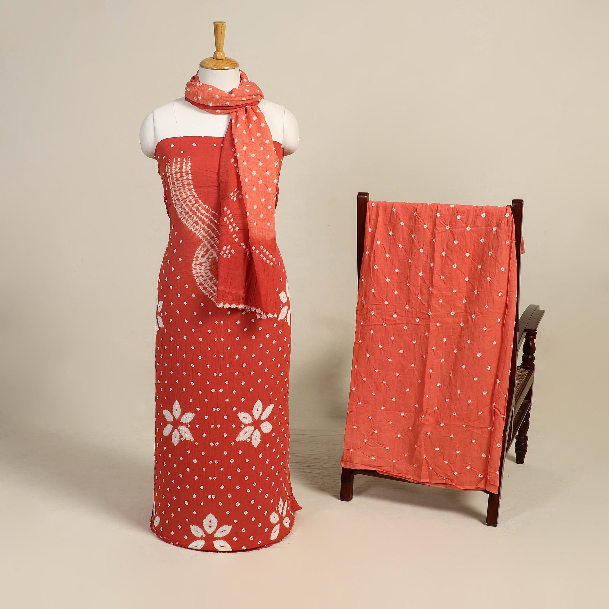 Infuse your wardrobe with a timeless charm through this orange 3pc satin cotton bandhani dress material, crafted by master artisans from Kutch. Using traditional tie-dye methods, the fabric is hand-tied and dyed to form mesmerizing patterns. This set comes with material for a kurta, coordinating bottom, and a flowing dupatta. Style it with ease for festive occasions, daily comfort, or to create a look that’s uniquely yours.