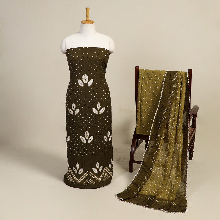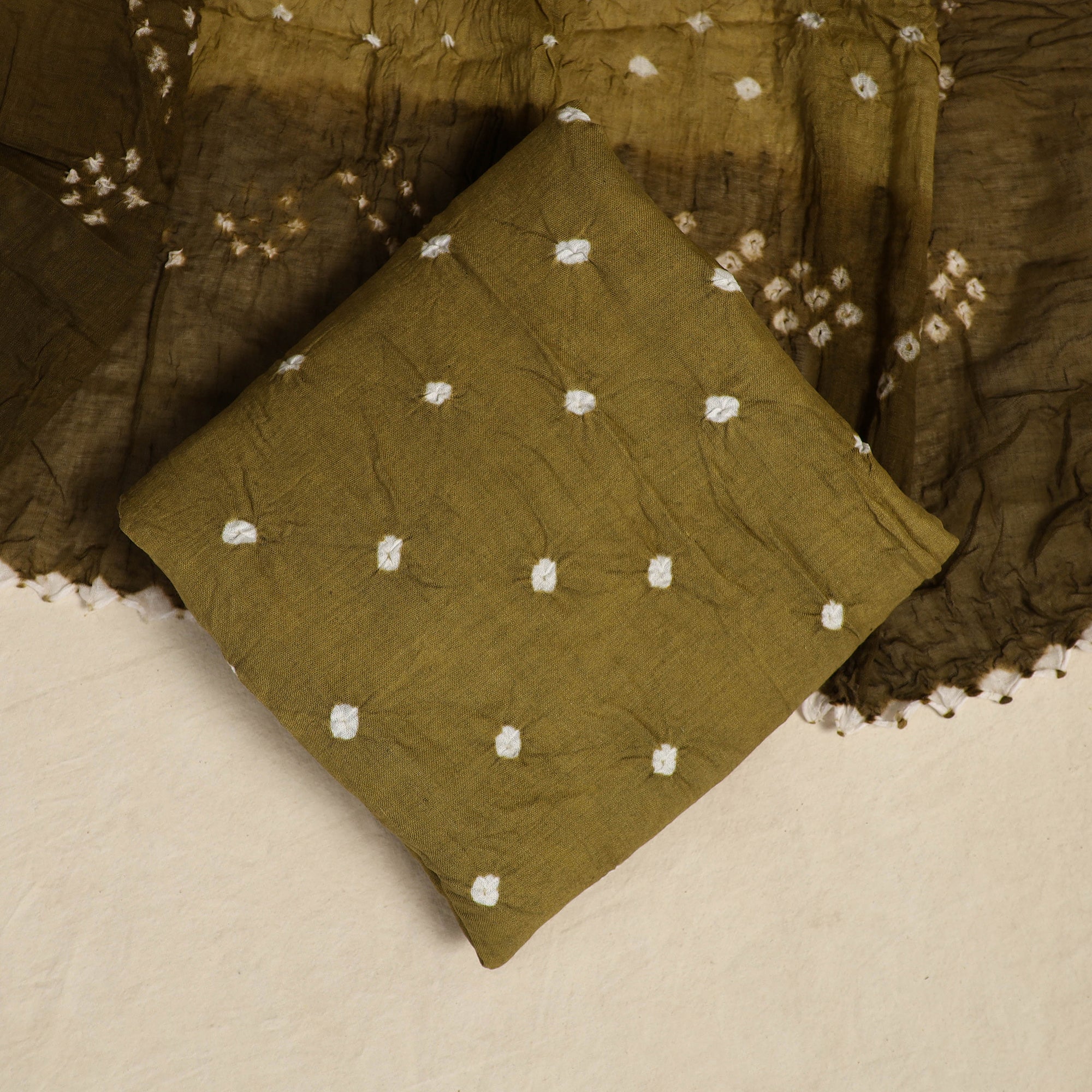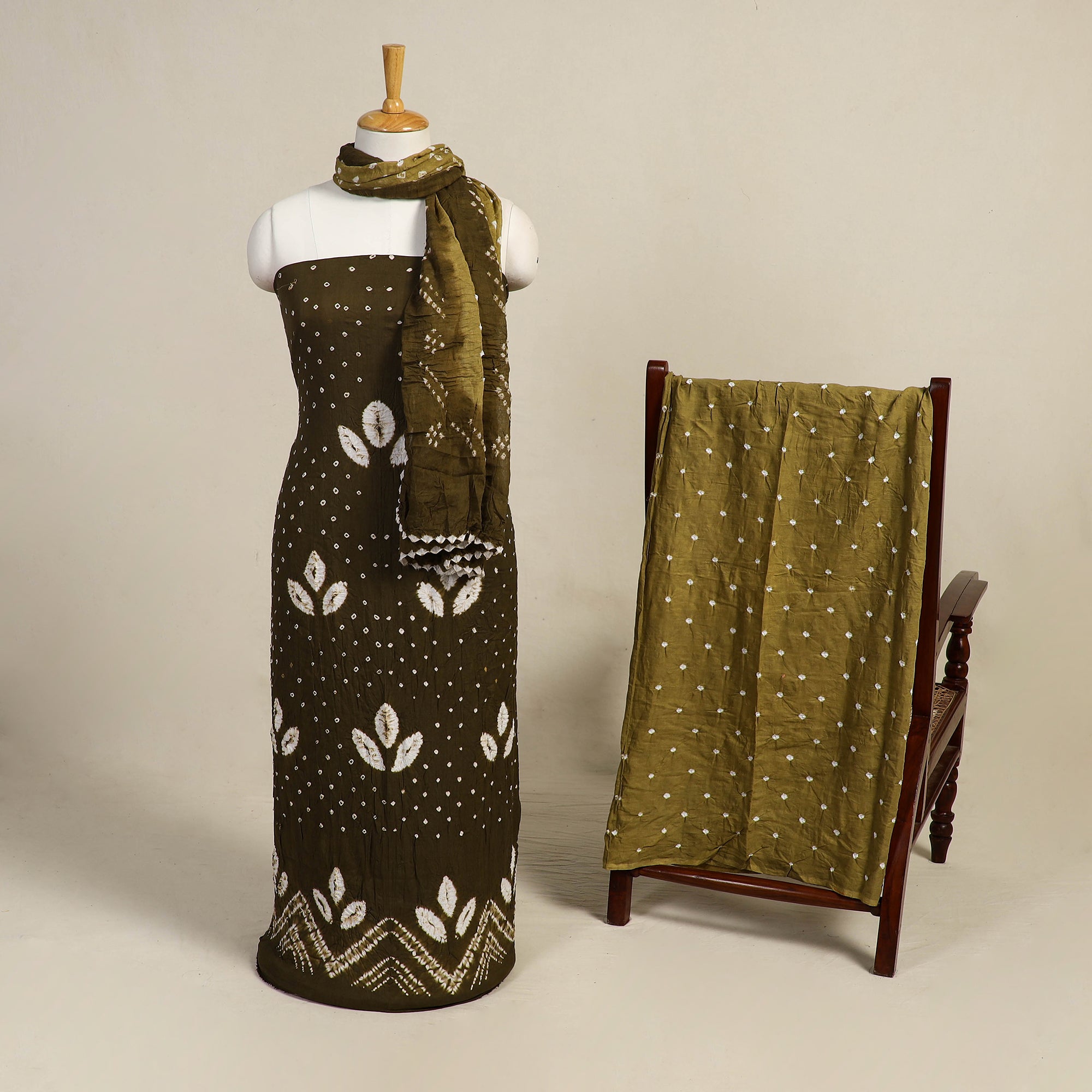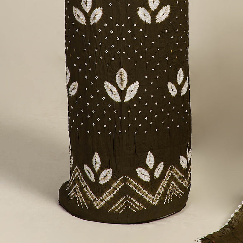 Infuse your wardrobe with a timeless charm through this green 3pc satin cotton bandhani dress material, crafted by master artisans from Kutch. Using traditional tie-dye methods, the fabric is hand-tied and dyed to form mesmerizing patterns. This set comes with material for a kurta, coordinating bottom, and a flowing dupatta. Style it with ease for festive occasions, daily comfort, or to create a look that’s uniquely yours.