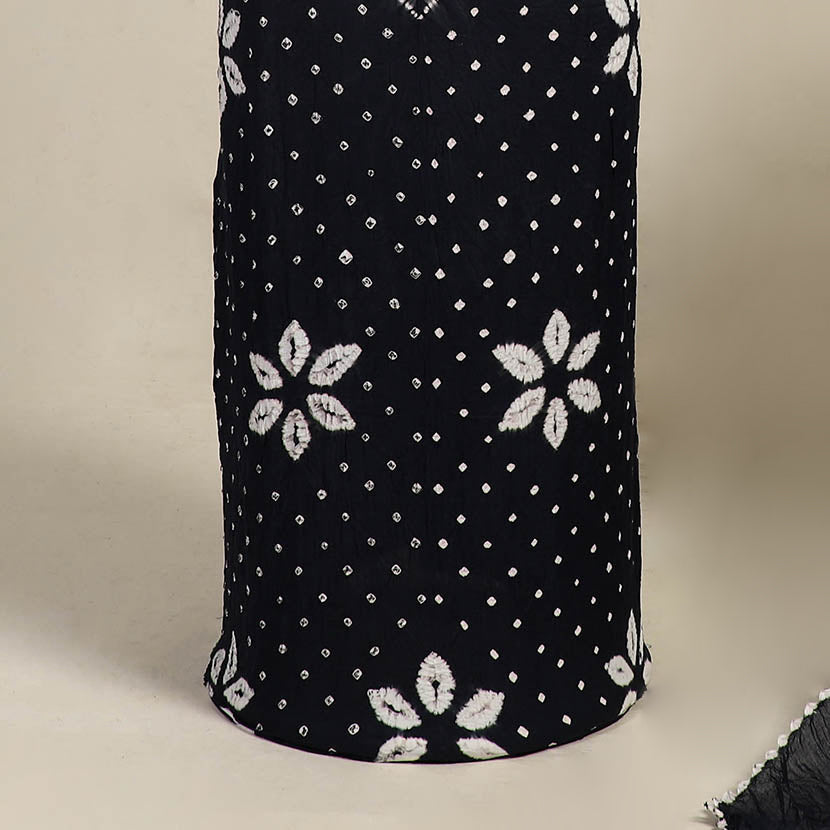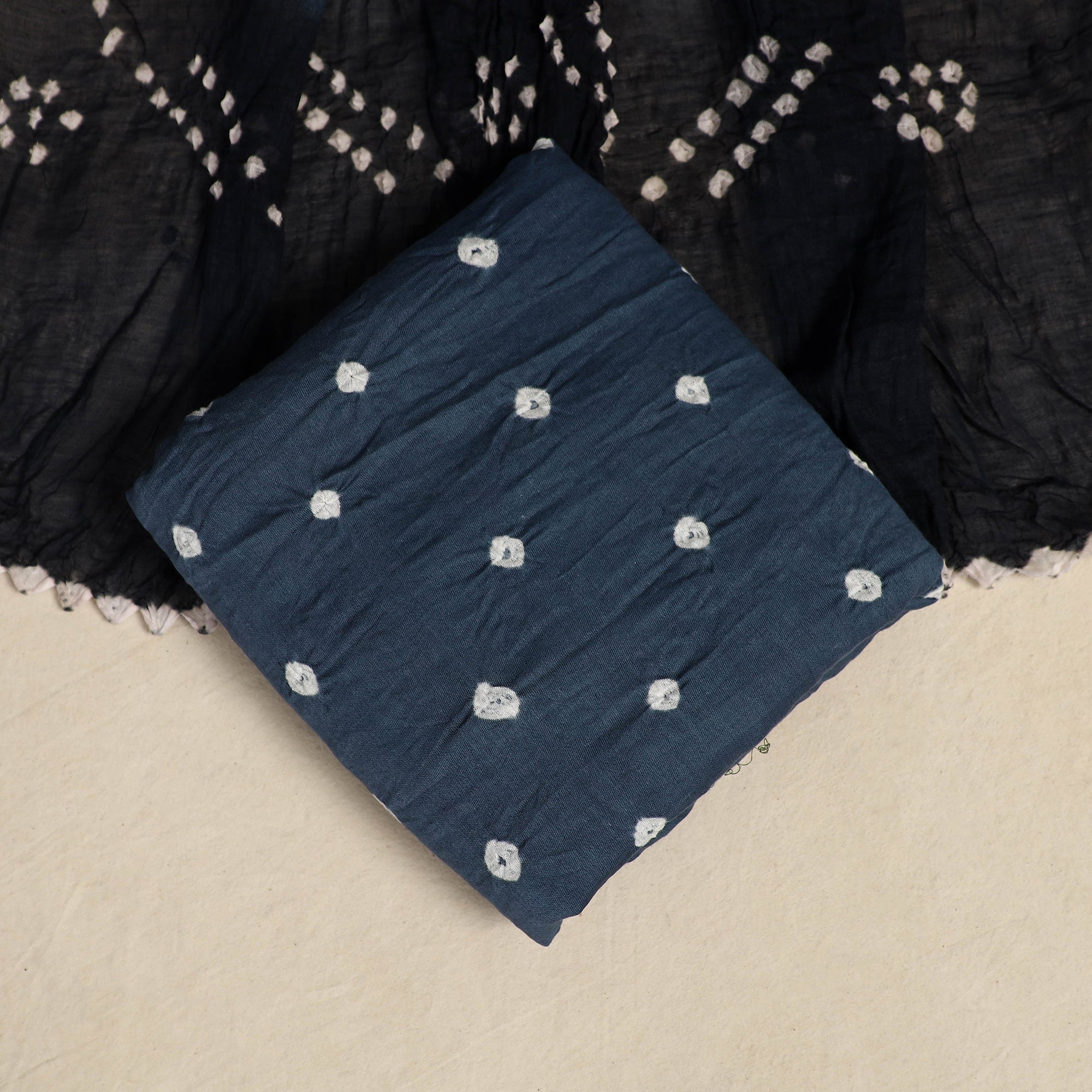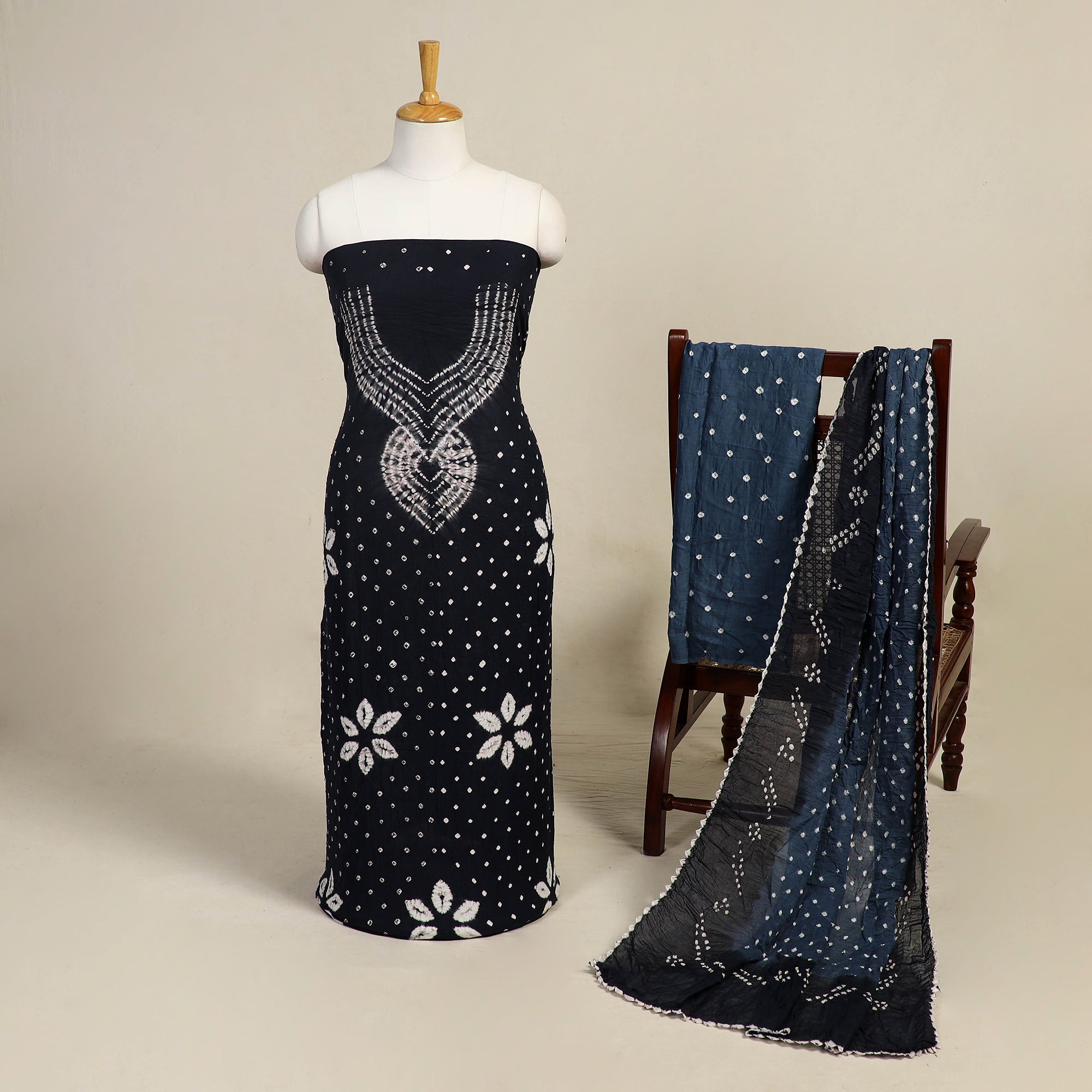Infuse your wardrobe with a timeless charm through this blue 3pc satin cotton bandhani dress material, crafted by master artisans from Kutch. Using traditional tie-dye methods, the fabric is hand-tied and dyed to form mesmerizing patterns. This set comes with material for a kurta, coordinating bottom, and a flowing dupatta. Style it with ease for festive occasions, daily comfort, or to create a look that’s uniquely yours.