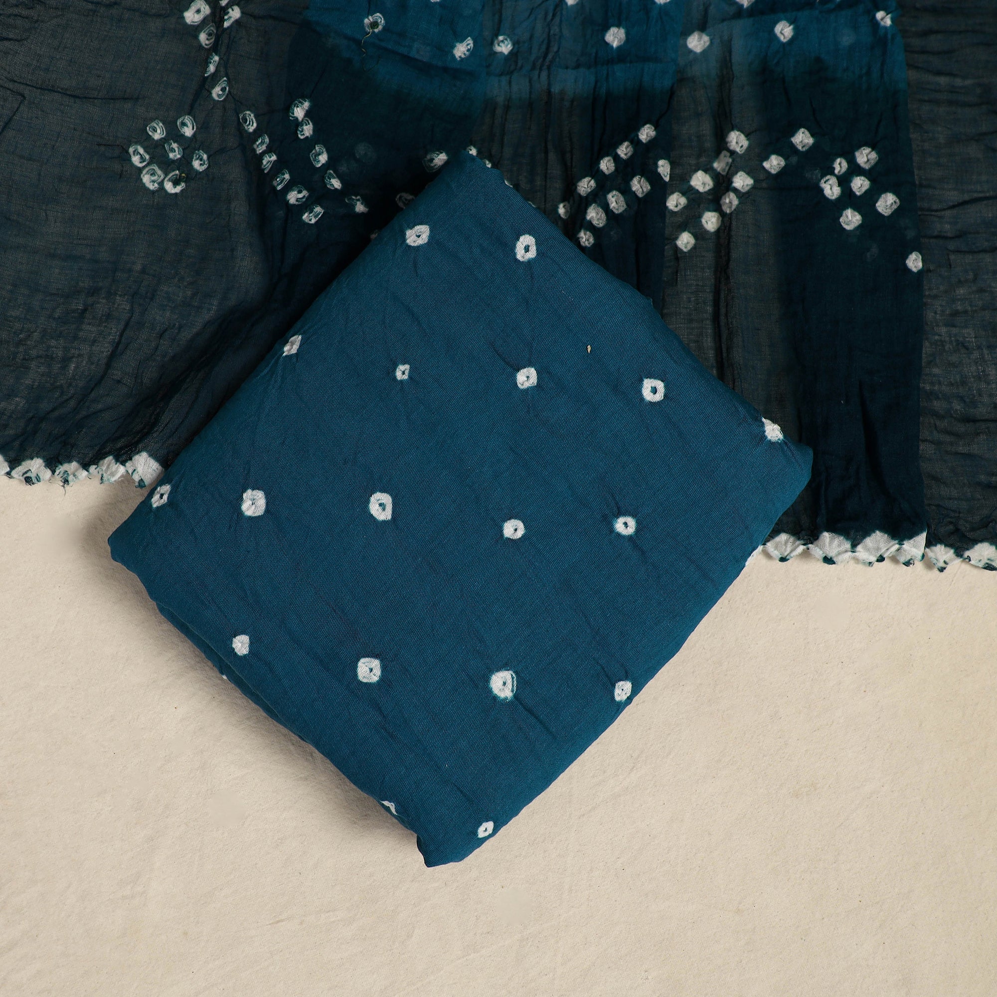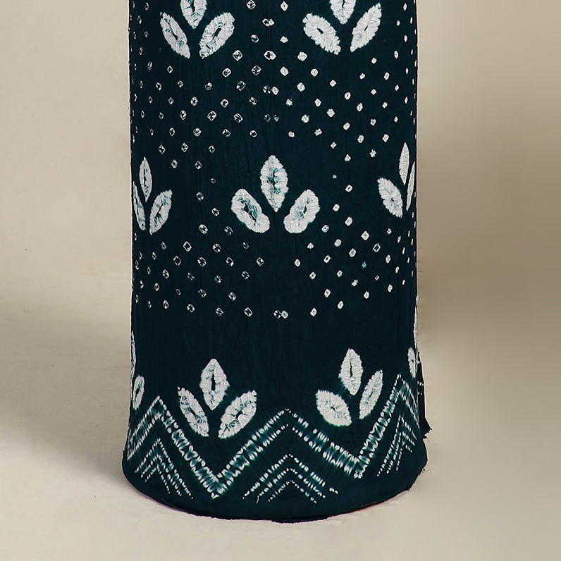 Infuse your wardrobe with a timeless charm through this blue 3pc satin cotton bandhani dress material, crafted by master artisans from Kutch. Using traditional tie-dye methods, the fabric is hand-tied and dyed to form mesmerizing patterns. This set comes with material for a kurta, coordinating bottom, and a flowing dupatta. Style it with ease for festive occasions, daily comfort, or to create a look that’s uniquely yours.