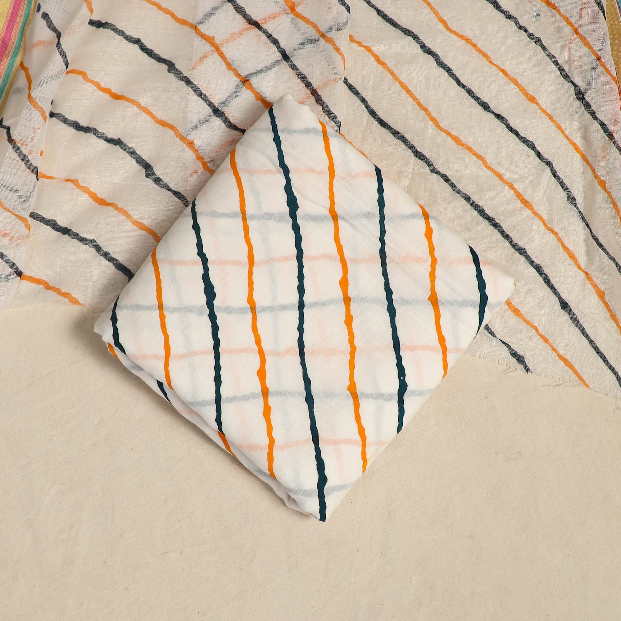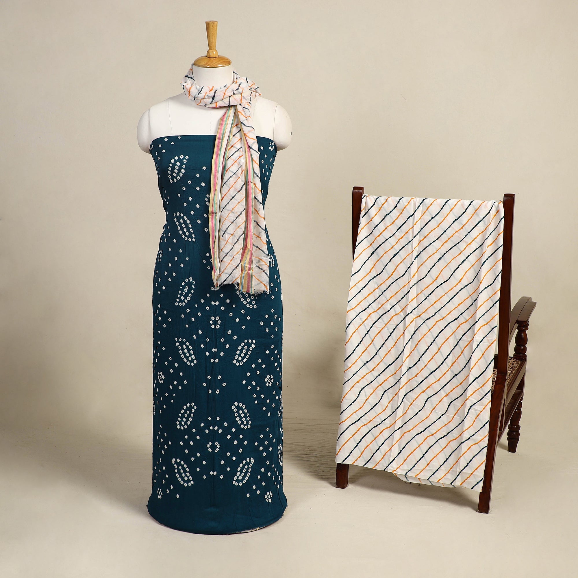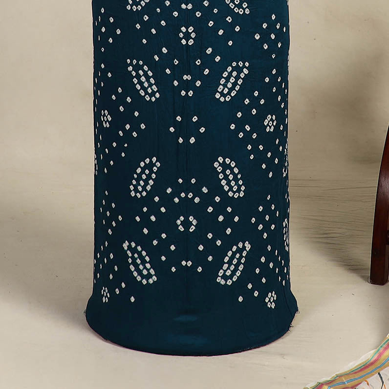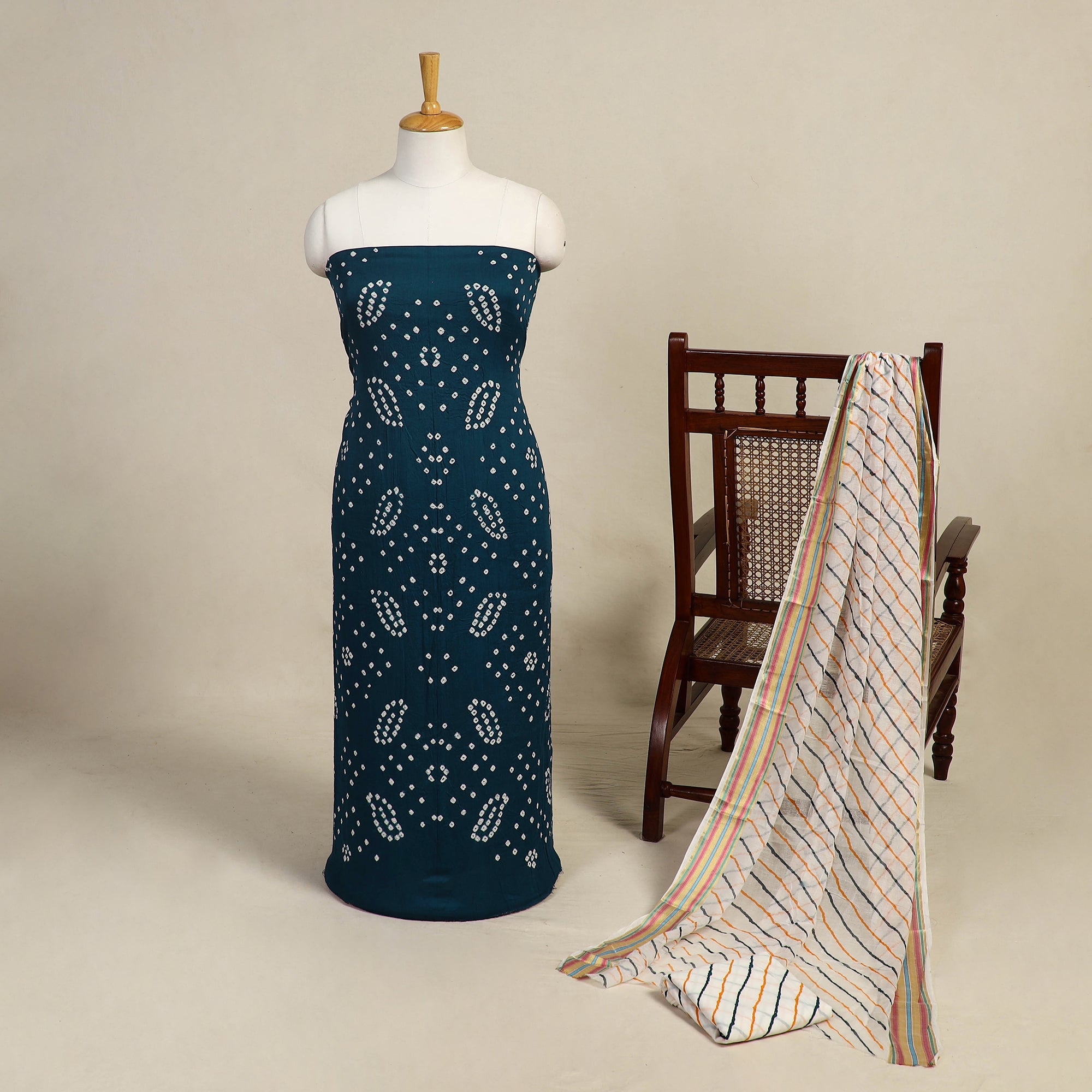 Wrap yourself in timeless artistry with this green 3pc satin cotton bandhani dress material, featuring masterful tie-dye work by Kutch artisans. Each piece is tied and dyed to form unique, detailed motifs. The set includes a bandhani kurta fabric, a complementary leheriya-style bottom fabric, and a lightweight mul cotton dupatta. Let your creativity shine. Style it your way for everyday comfort, festive celebrations, or something uniquely yours.