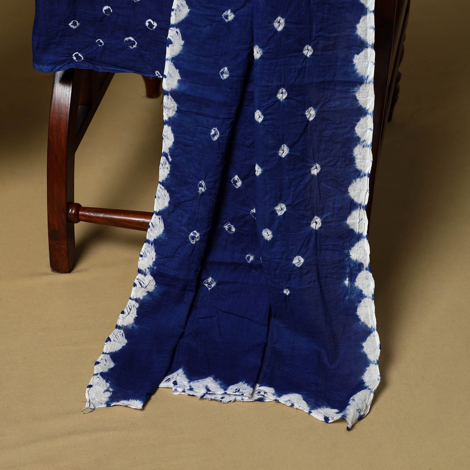 This blue 3pc cotton bandhani dress material is crafted by artisan Shabana Khatri from Kutch. Made using the traditional tie-and-dye technique, each fabric piece shows beautiful Bandhani patterns. The set includes a embroidered kurta, matching bottom fabric, and a dupatta, giving you the freedom to design your own outfit. Ideal for festive occasions or everyday wear, it adds a vibrant and traditional touch to your wardrobe.