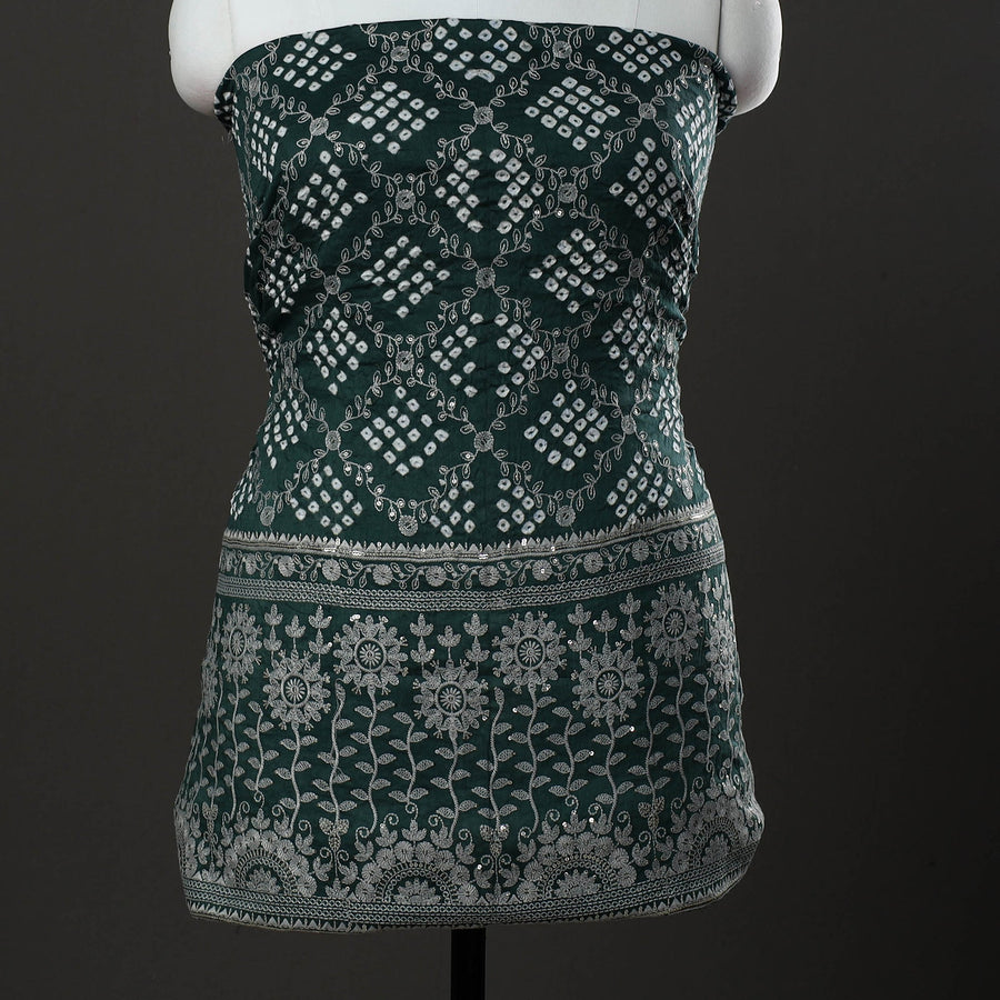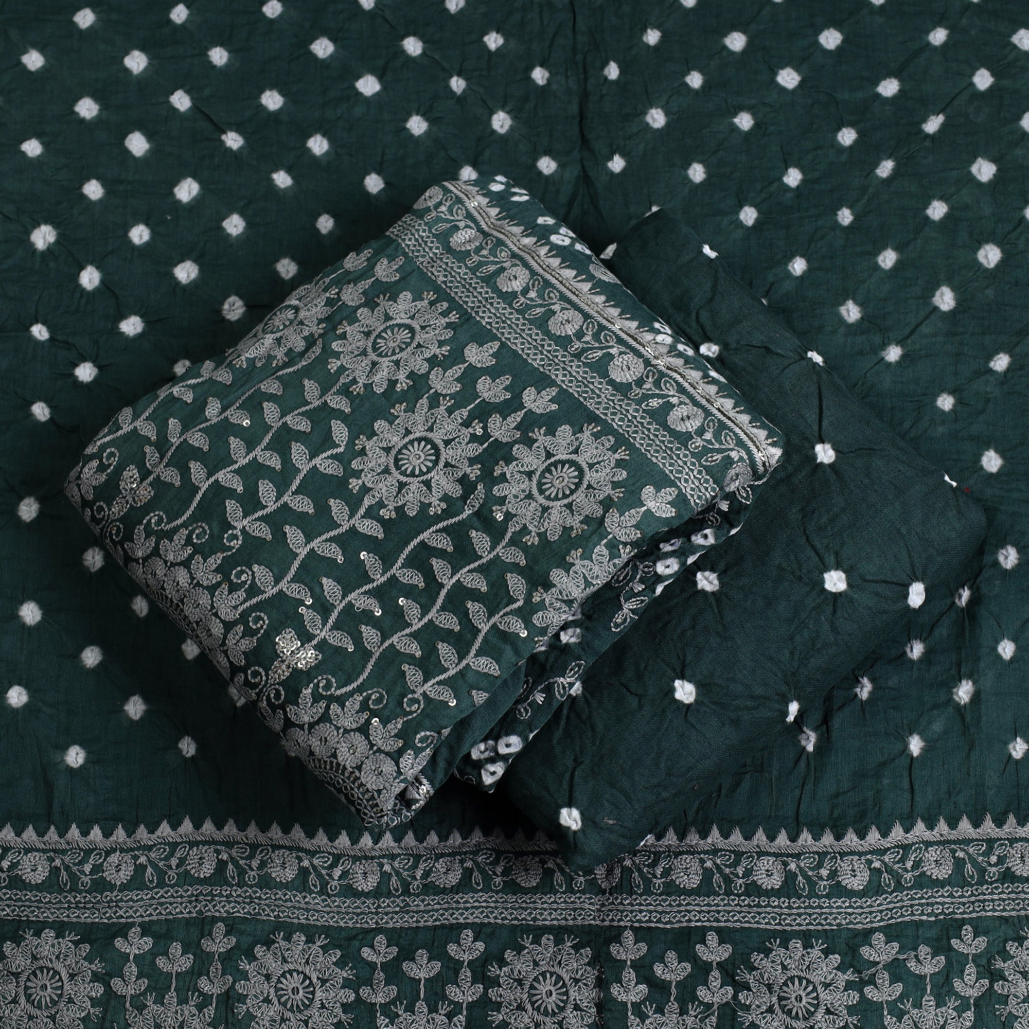 Green 3pc kutch tie-dye satin cotton bandhani dress material. Showcases the Bandhani patterns beautifully but also ensures comfort and breathability. It comes with embroidered dupatta and kurta, making it perfect for a variety of occasions.