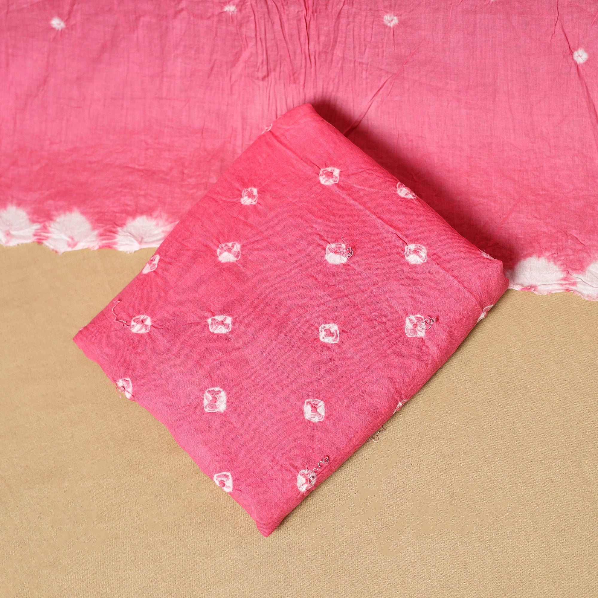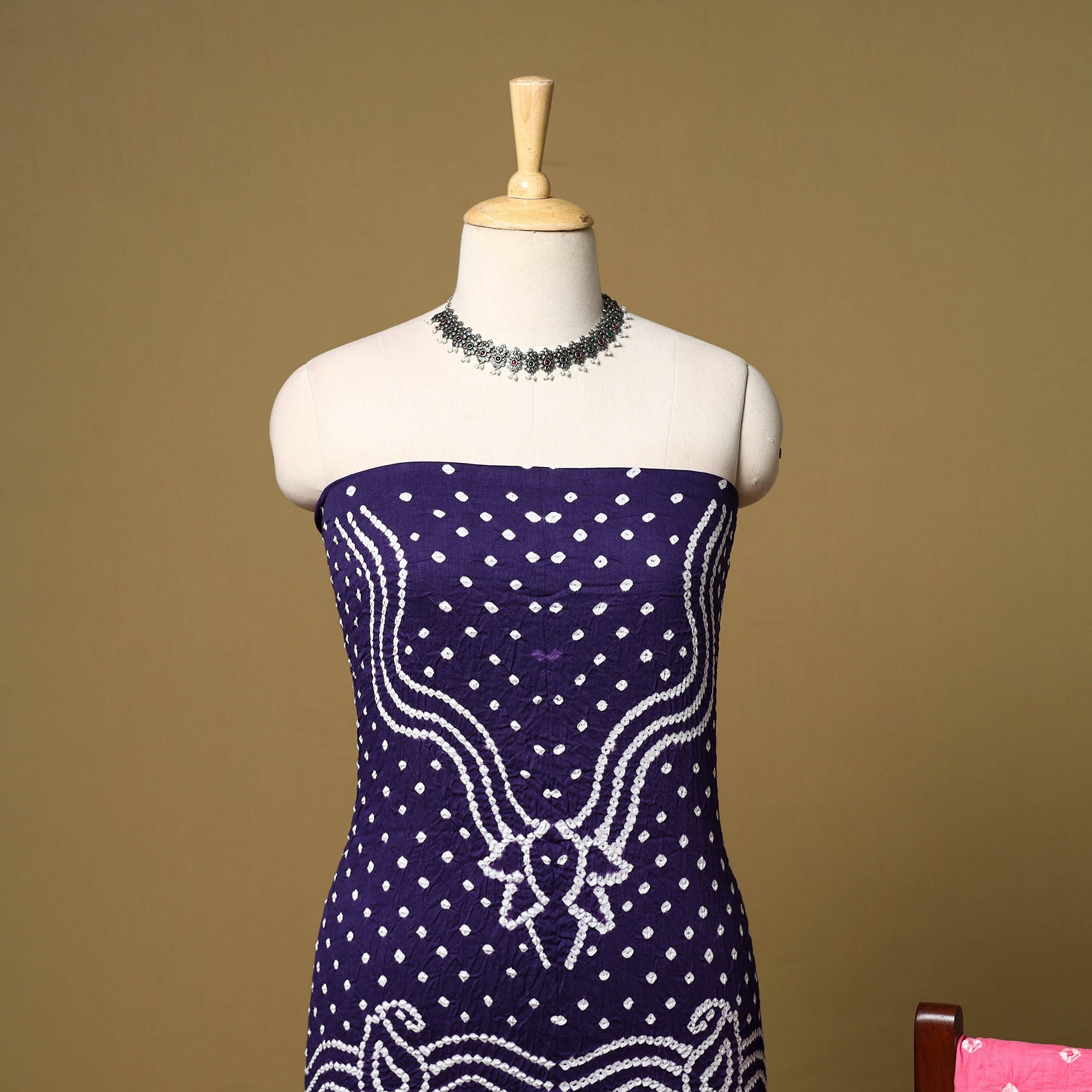 Purple 3pc satin cotton bandhani dress material is crafted by artisan Shabana Khatri from Kutch. Made using the traditional tie & dye technique, each fabric piece shows beautiful bandhani patterns. The set includes fabric for a kurta, bottom and dupatta, giving you the freedom to design your own outfit. Ideal for festive occasions or everyday wear, it adds a vibrant and traditional touch to your wardrobe.