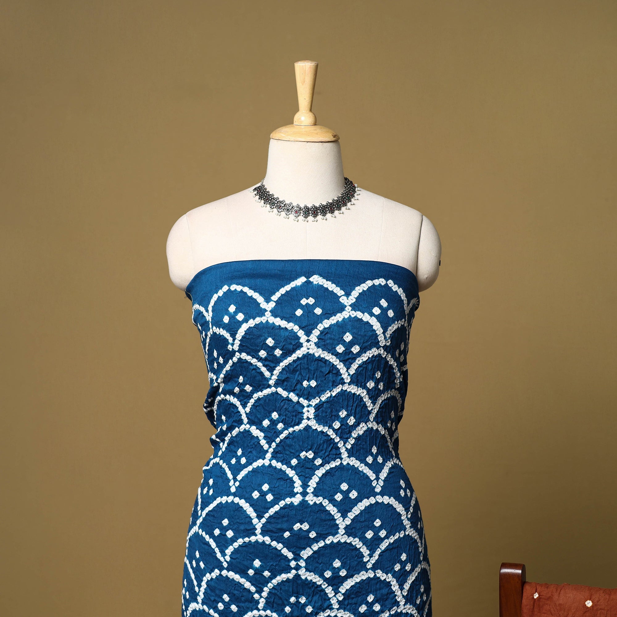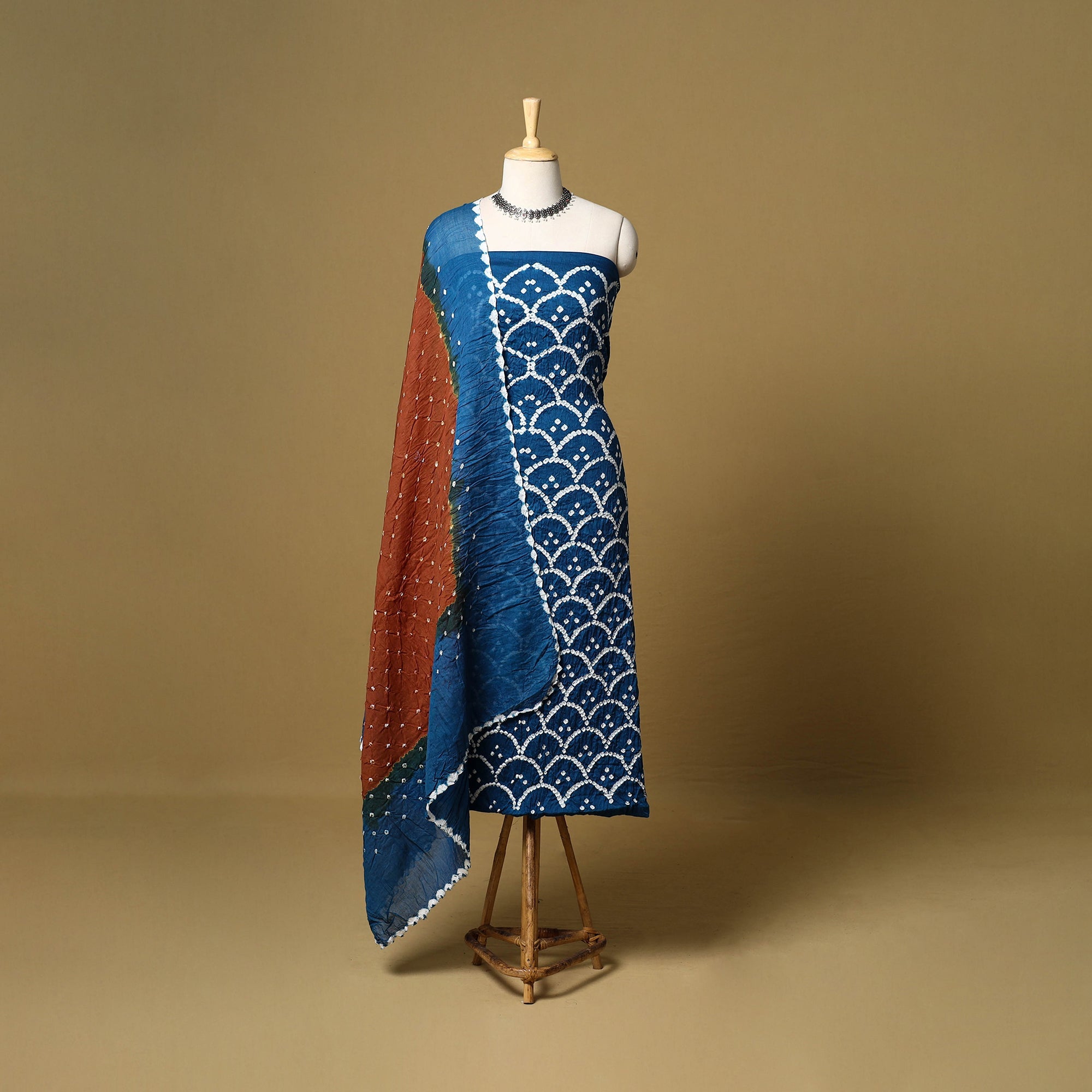 Blue 3pc satin cotton bandhani dress material is crafted by artisan Shabana Khatri from Kutch. Made using the traditional tie & dye technique, each fabric piece shows beautiful bandhani patterns. The set includes fabric for a kurta, bottom and dupatta, giving you the freedom to design your own outfit. Ideal for festive occasions or everyday wear, it adds a vibrant and traditional touch to your wardrobe.