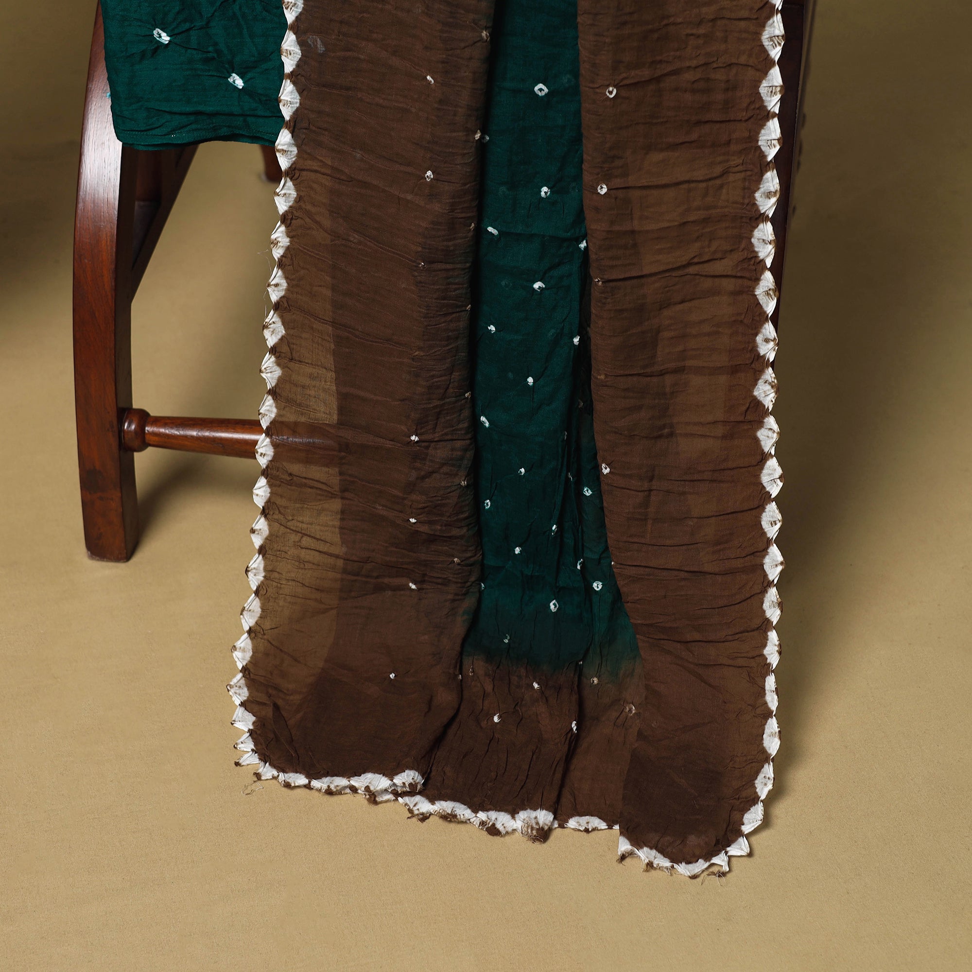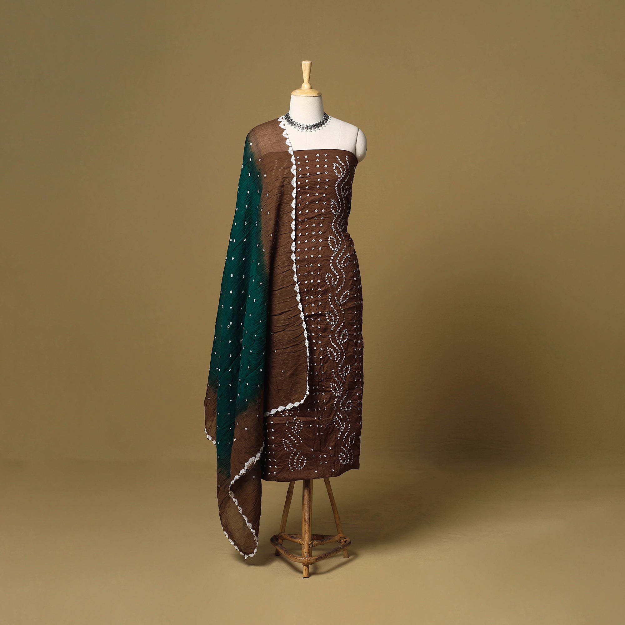 Brown 3pc satin cotton bandhani dress material is crafted by artisan Shabana Khatri from Kutch. Made using the traditional tie & dye technique, each fabric piece shows beautiful bandhani patterns. The set includes fabric for a kurta, bottom and dupatta, giving you the freedom to design your own outfit. Ideal for festive occasions or everyday wear, it adds a vibrant and traditional touch to your wardrobe.