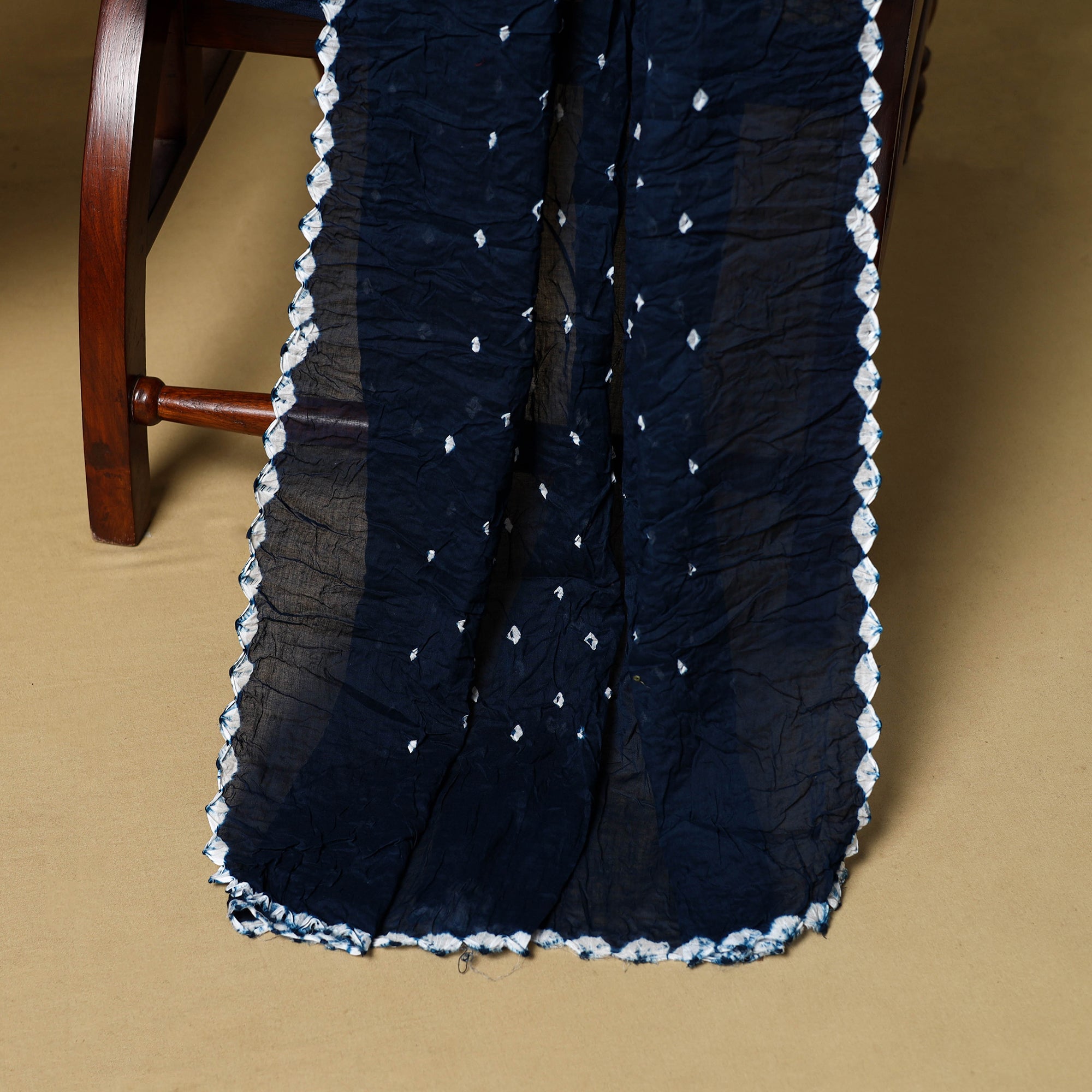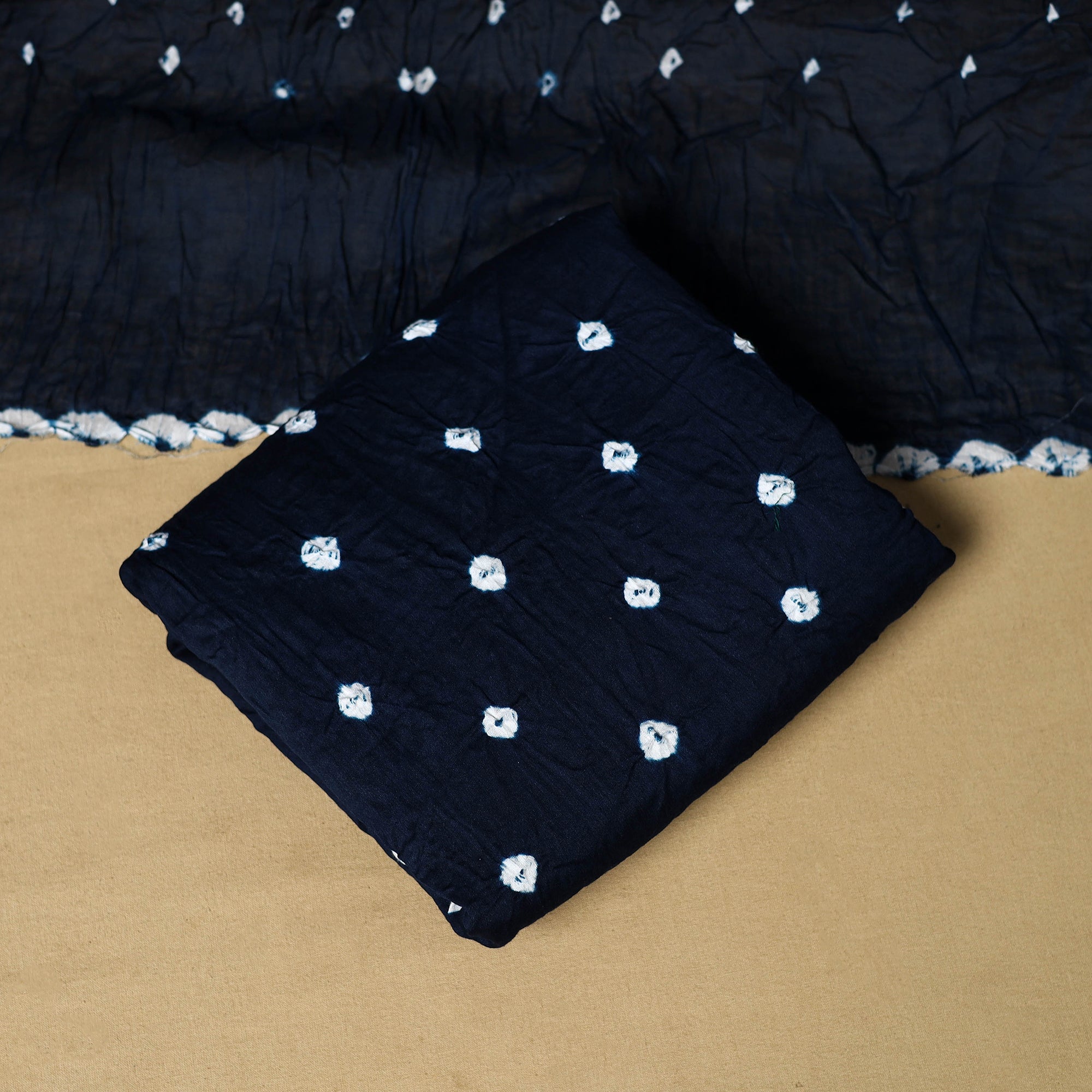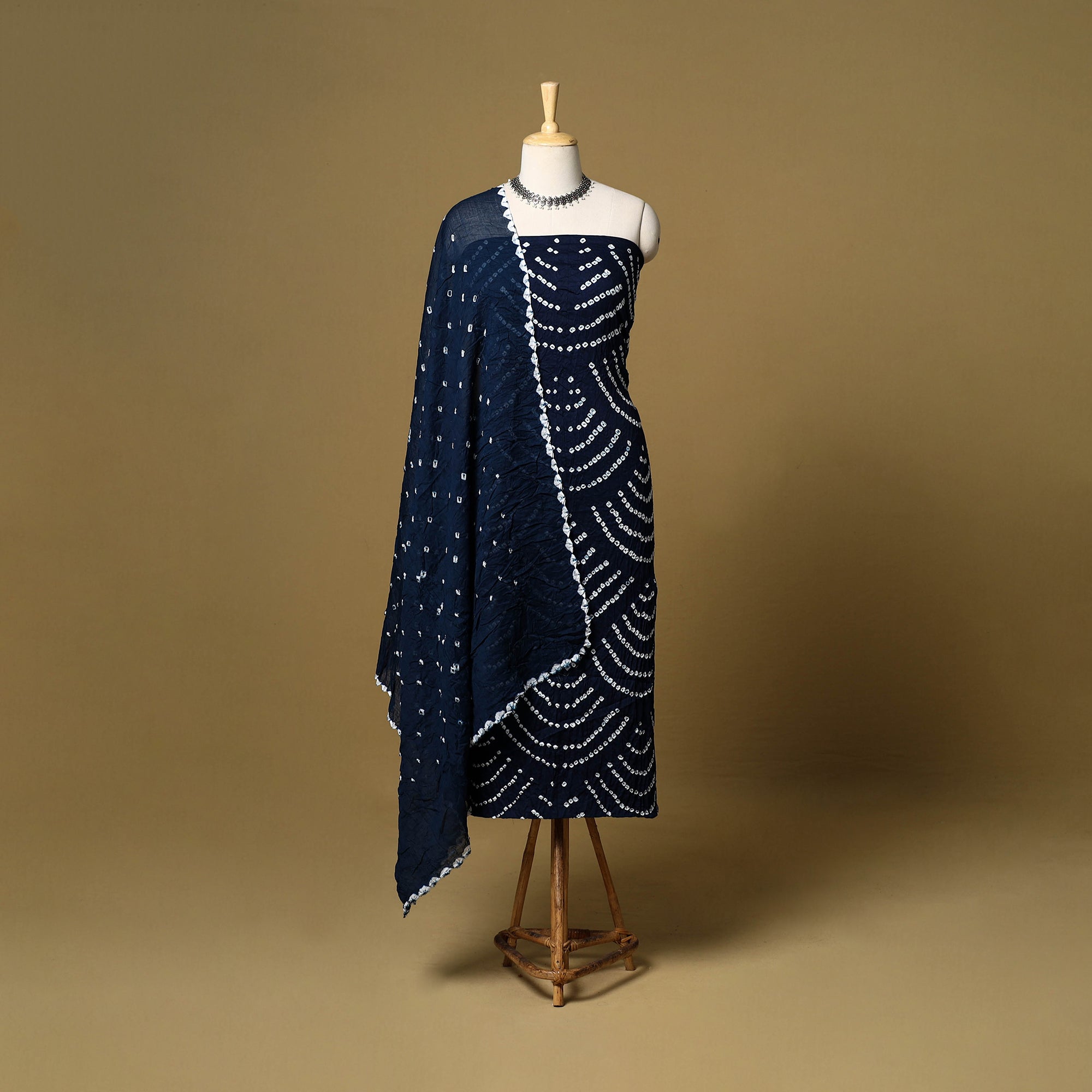 Blue 3pc satin cotton bandhani dress material is crafted by artisan Shabana Khatri from Kutch. Made using the traditional tie & dye technique, each fabric piece shows beautiful bandhani patterns. The set includes fabric for a kurta, bottom and dupatta, giving you the freedom to design your own outfit. Ideal for festive occasions or everyday wear, it adds a vibrant and traditional touch to your wardrobe.