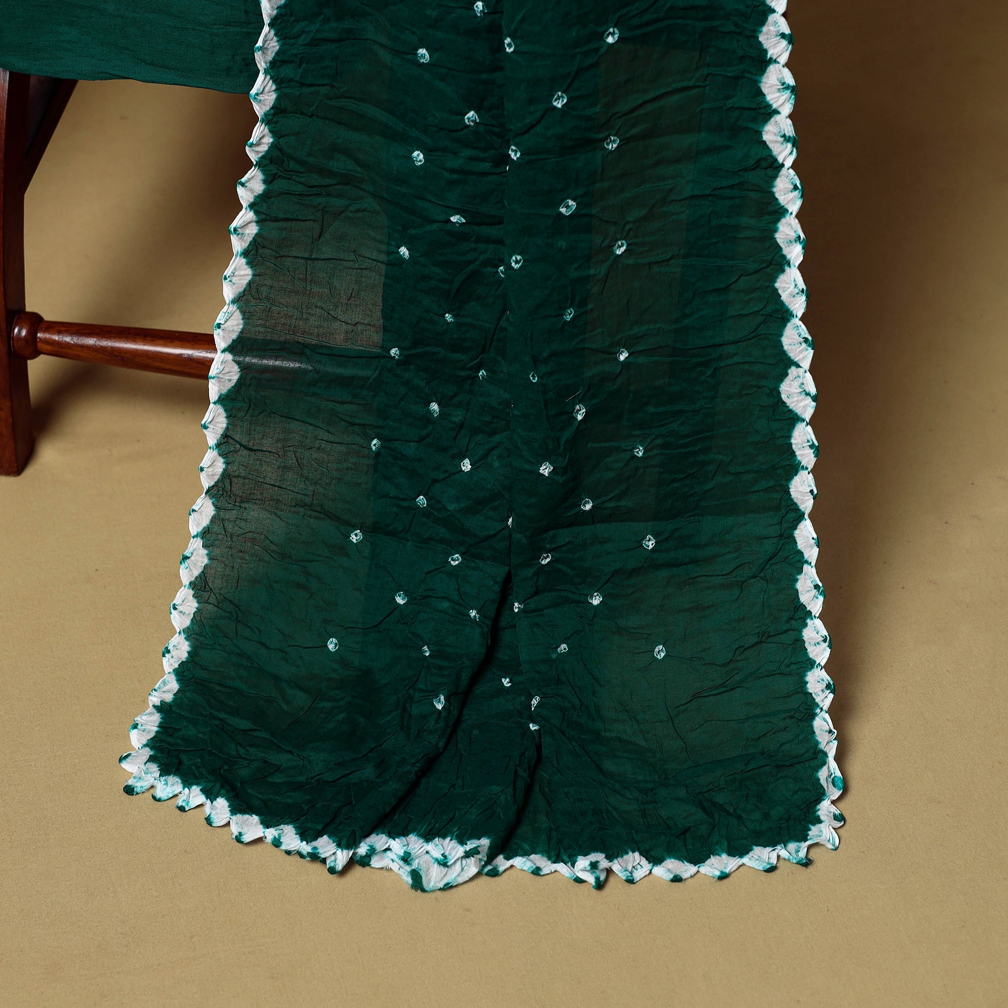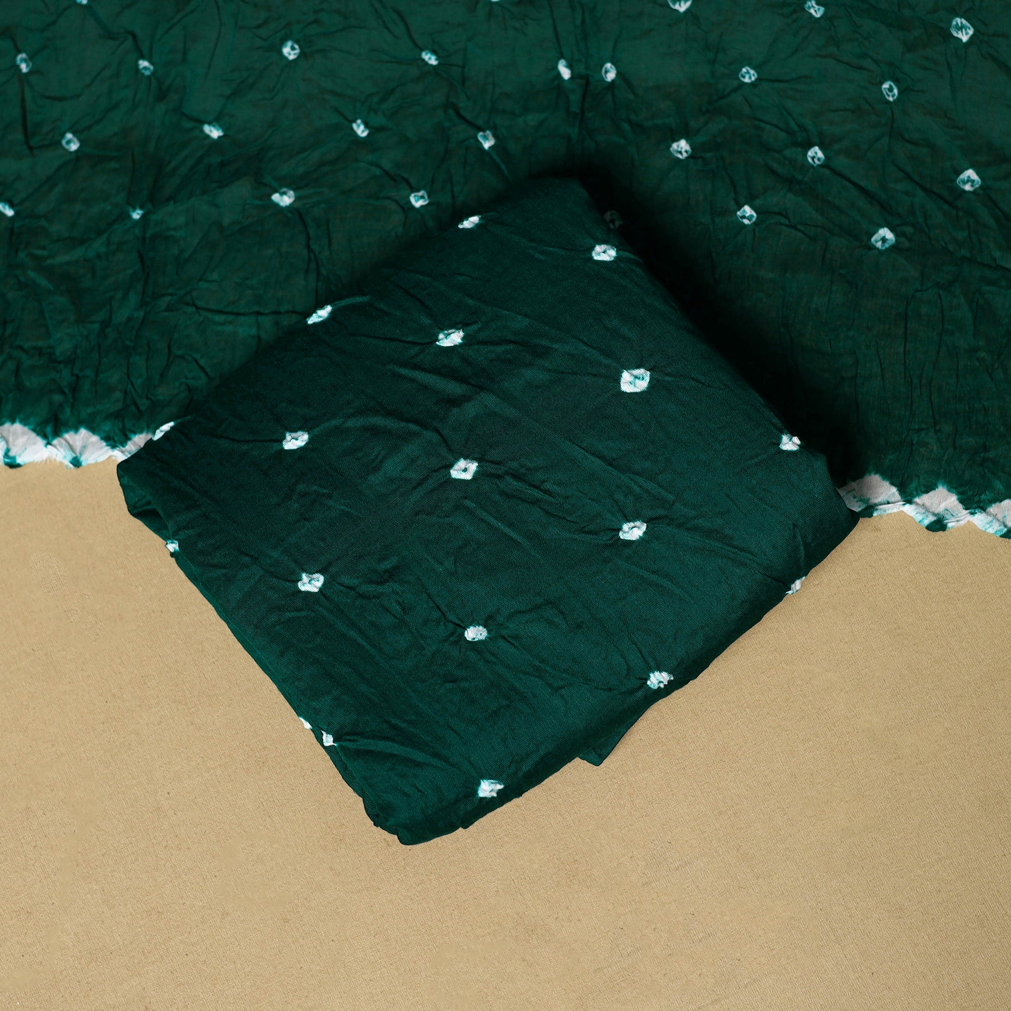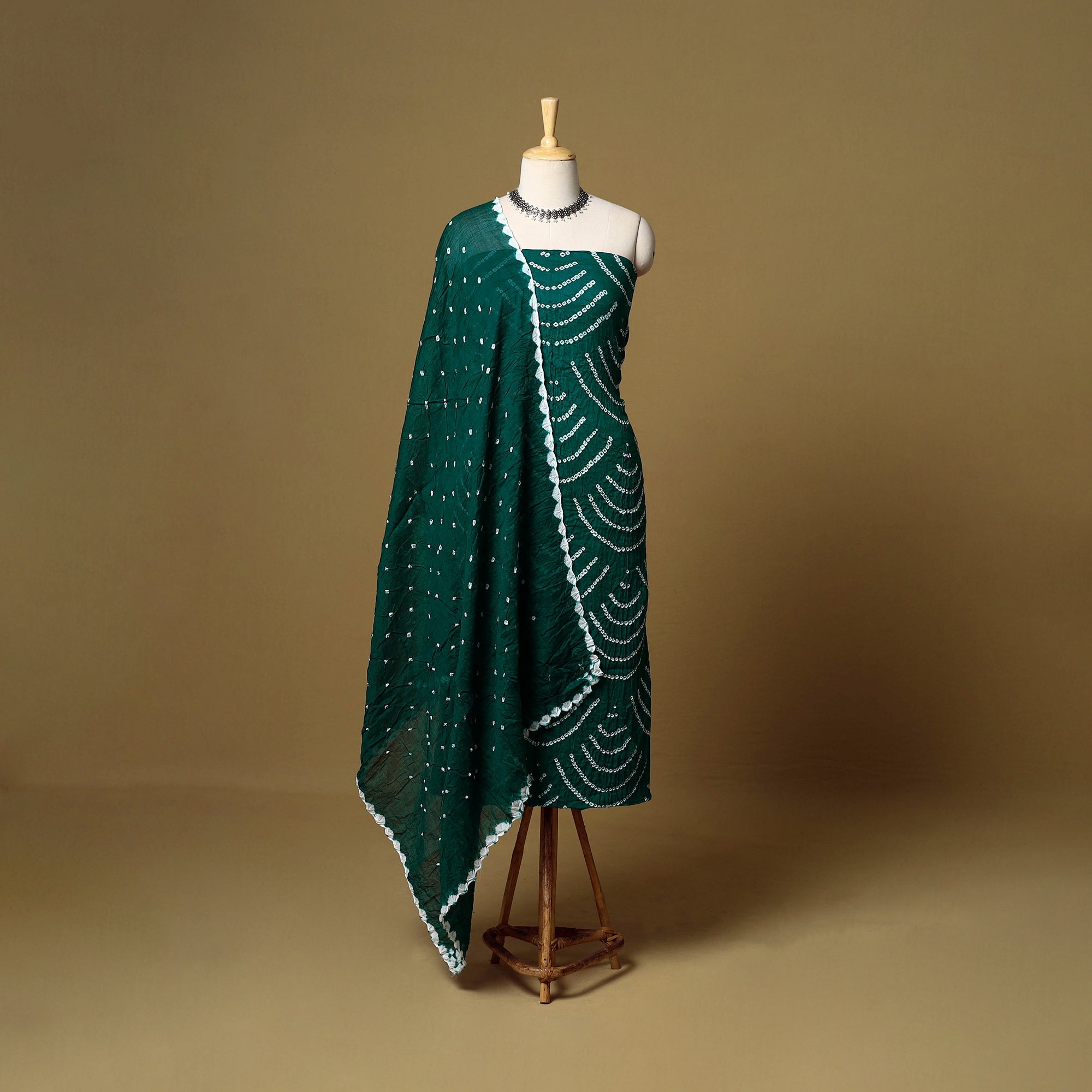 Green 3pc satin cotton bandhani dress material is crafted by artisan Shabana Khatri from Kutch. Made using the traditional tie & dye technique, each fabric piece shows beautiful bandhani patterns. The set includes fabric for a kurta, bottom and dupatta, giving you the freedom to design your own outfit. Ideal for festive occasions or everyday wear, it adds a vibrant and traditional touch to your wardrobe.