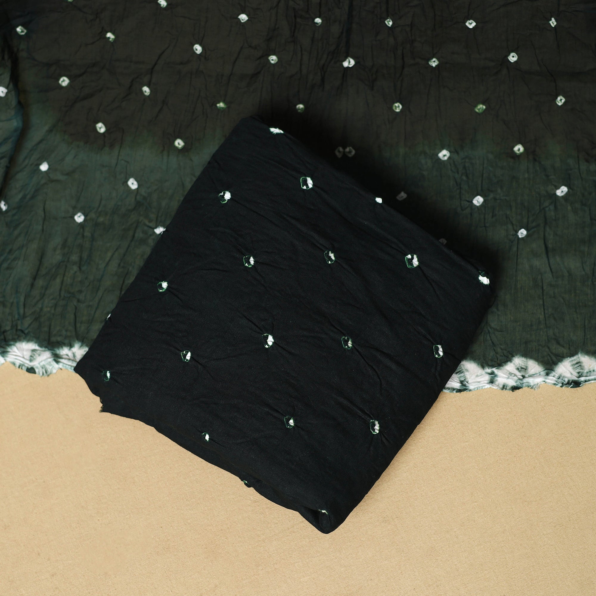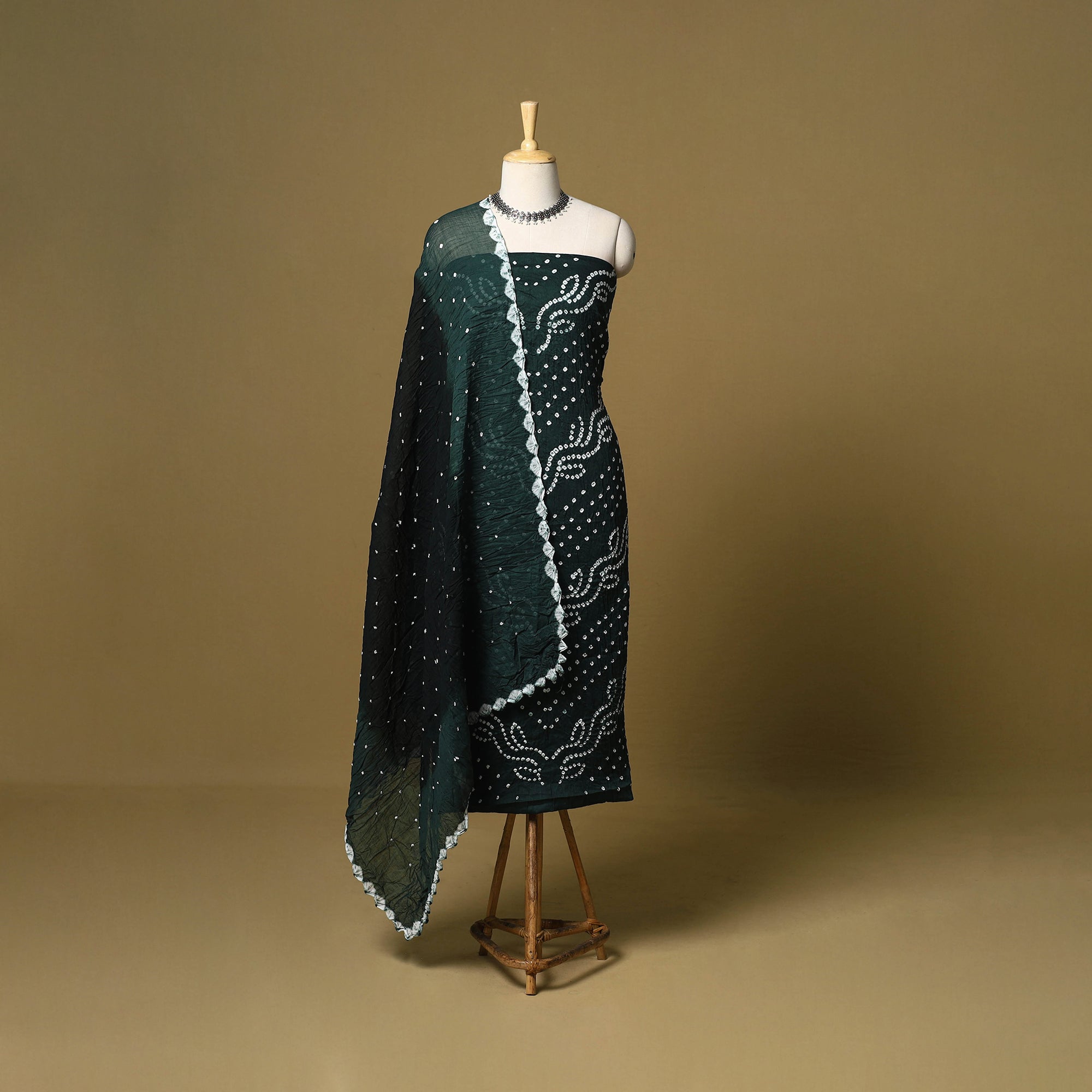Green 3pc satin cotton bandhani dress material is crafted by artisan Shabana Khatri from Kutch. Made using the traditional tie & dye technique, each fabric piece shows beautiful bandhani patterns. The set includes fabric for a kurta, bottom and dupatta, giving you the freedom to design your own outfit. Ideal for festive occasions or everyday wear, it adds a vibrant and traditional touch to your wardrobe.
