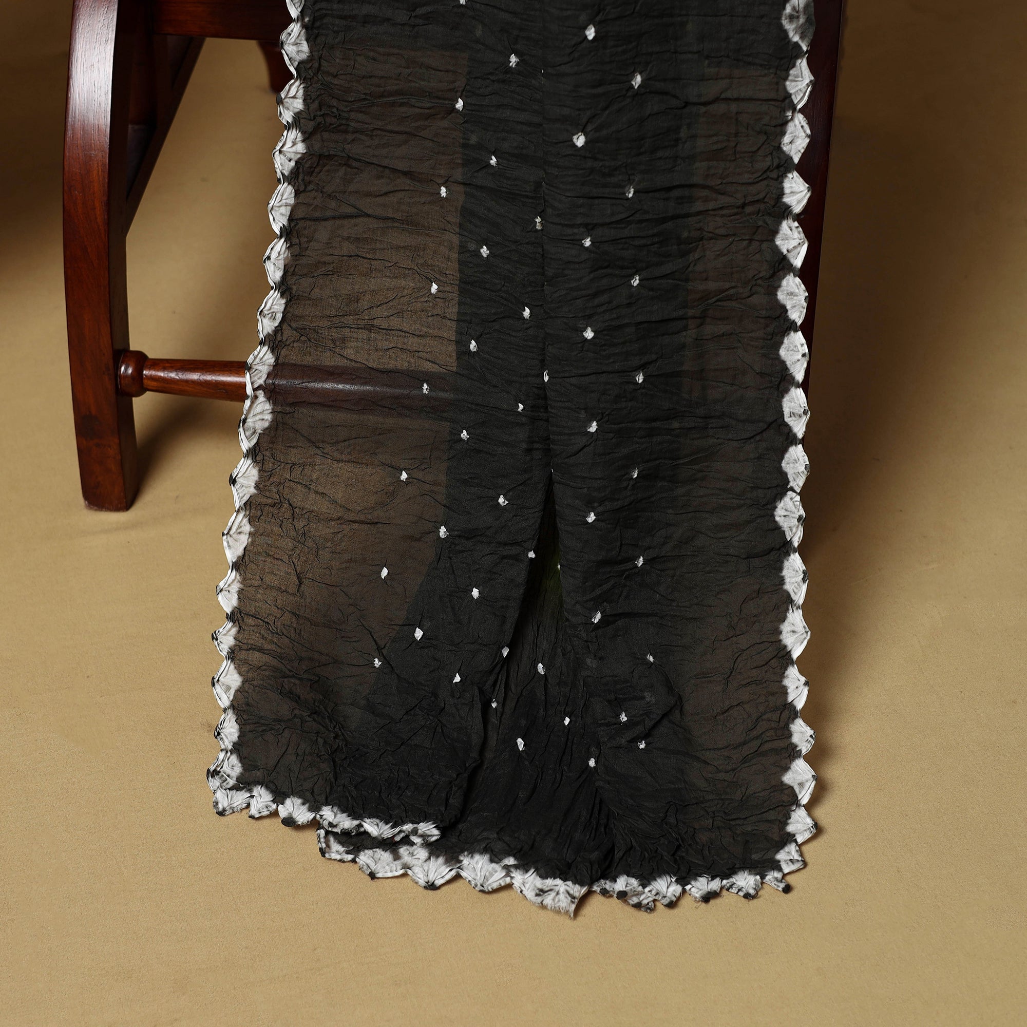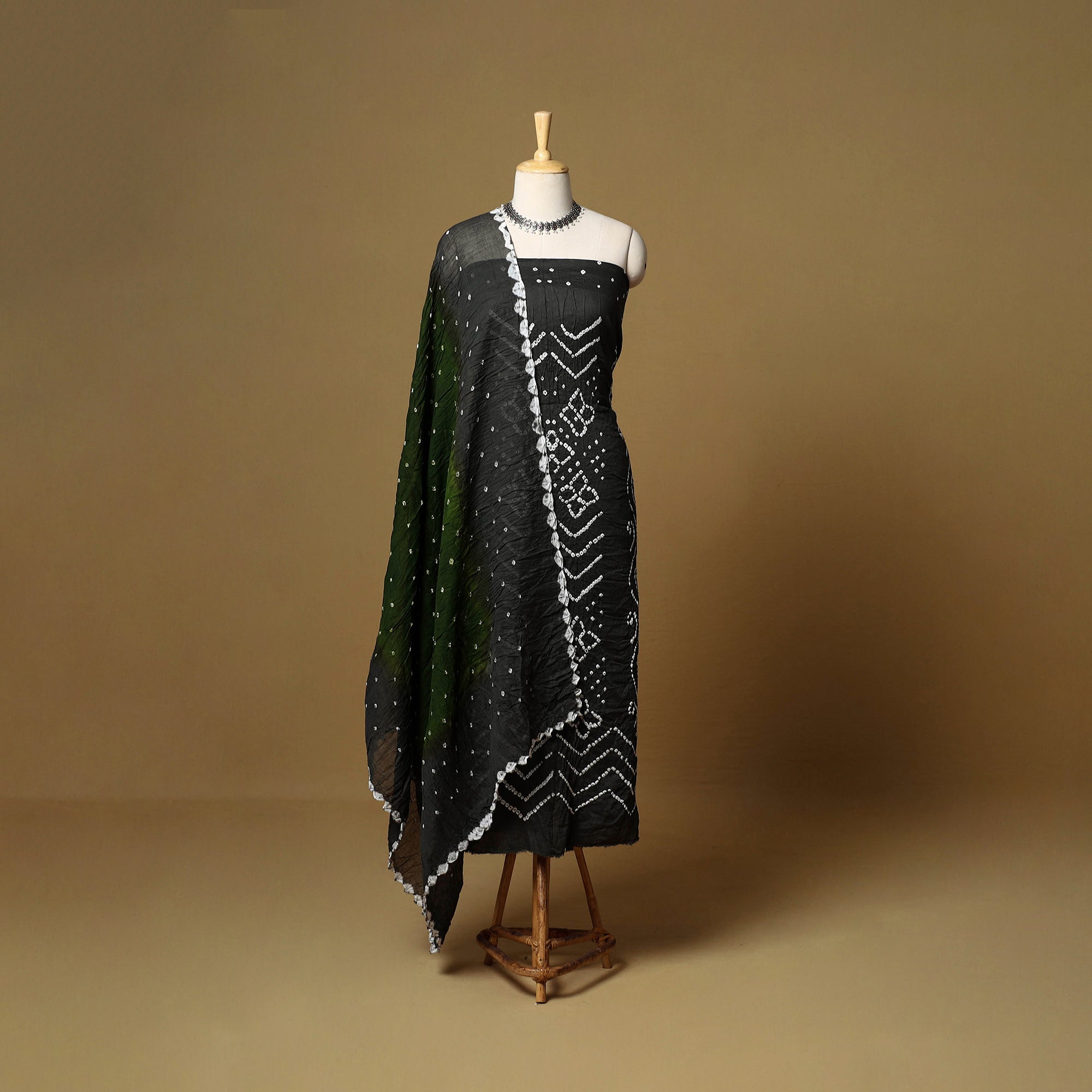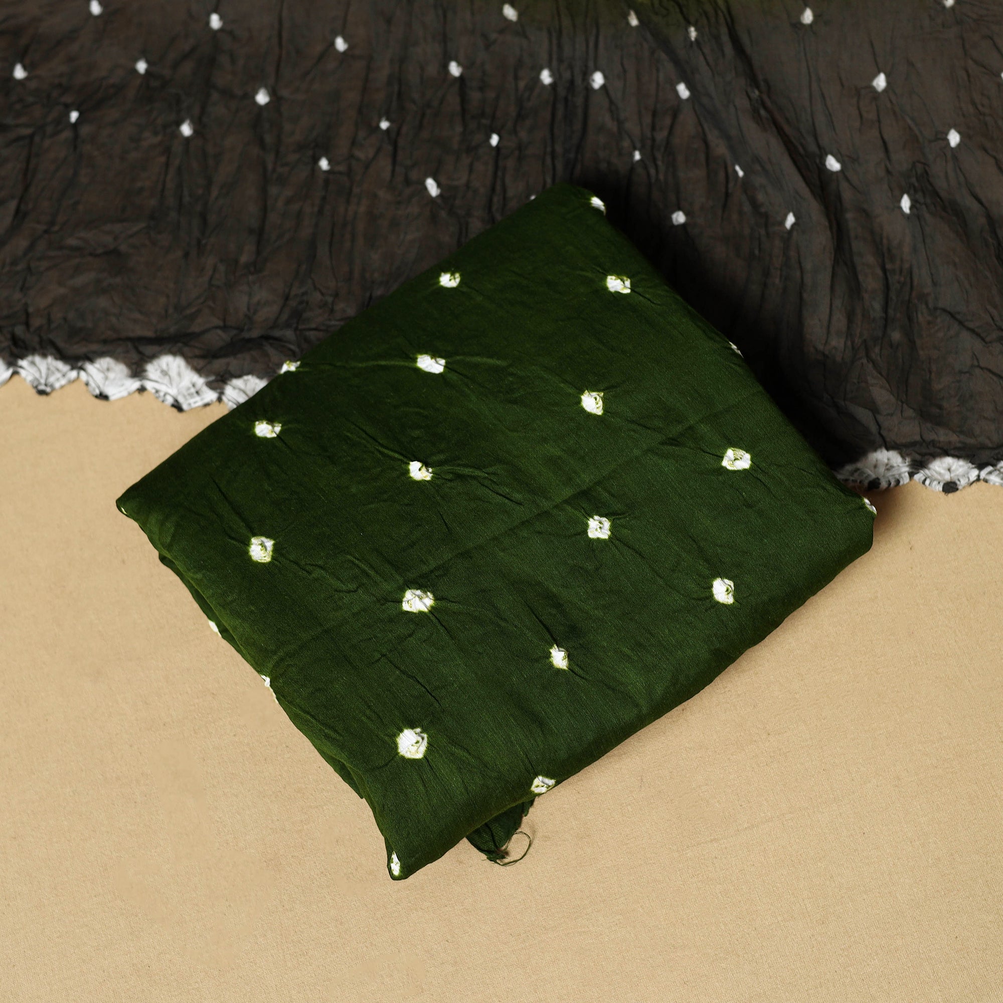 Black 3pc satin cotton bandhani dress material is crafted by artisan Shabana Khatri from Kutch. Made using the traditional tie & dye technique, each fabric piece shows beautiful bandhani patterns. The set includes fabric for a kurta, bottom and dupatta, giving you the freedom to design your own outfit. Ideal for festive occasions or everyday wear, it adds a vibrant and traditional touch to your wardrobe.