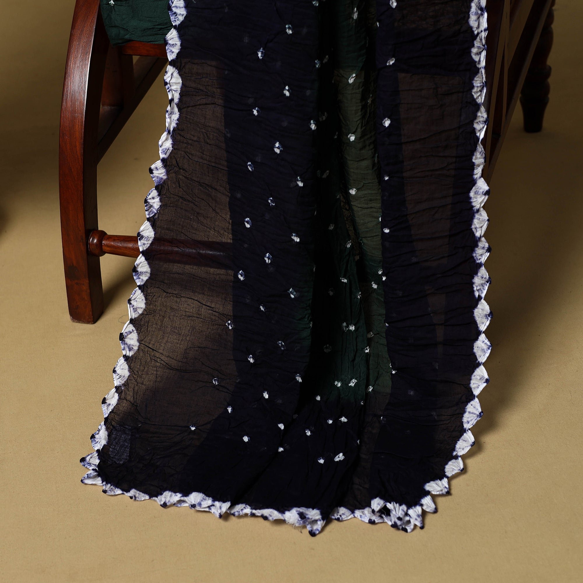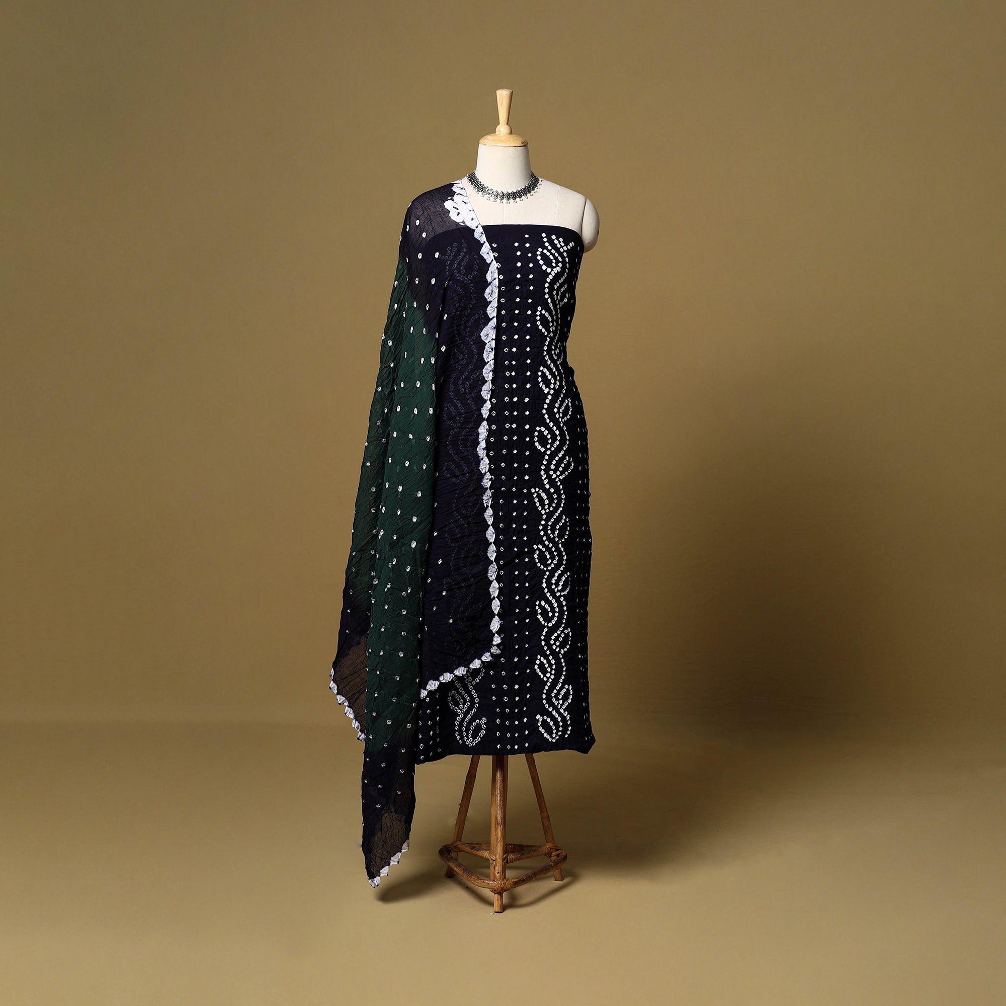 Blue 3pc satin cotton bandhani dress material is crafted by artisan Shabana Khatri from Kutch. Made using the traditional tie & dye technique, each fabric piece shows beautiful bandhani patterns. The set includes fabric for a kurta, bottom and dupatta, giving you the freedom to design your own outfit. Ideal for festive occasions or everyday wear, it adds a vibrant and traditional touch to your wardrobe.
