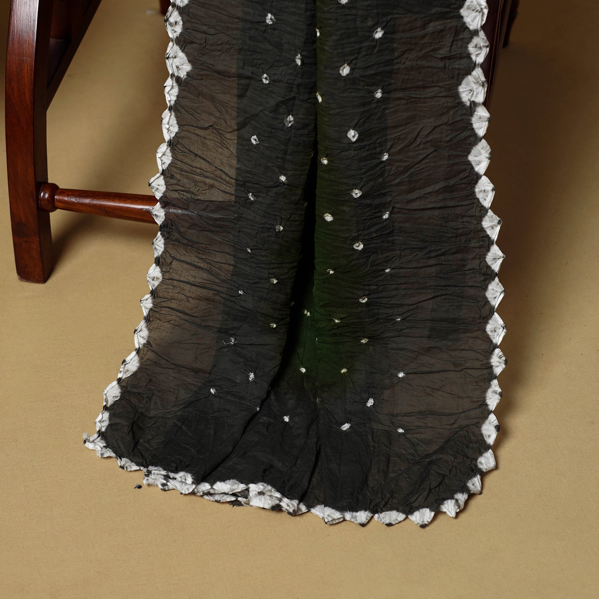 Black 3pc satin cotton bandhani dress material is crafted by artisan Shabana Khatri from Kutch. Made using the traditional tie & dye technique, each fabric piece shows beautiful bandhani patterns. The set includes fabric for a kurta, bottom and dupatta, giving you the freedom to design your own outfit. Ideal for festive occasions or everyday wear, it adds a vibrant and traditional touch to your wardrobe.
