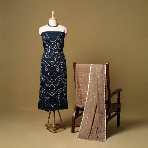 Blue 3pc satin cotton bandhani dress material is crafted by artisan Shabana Khatri from Kutch. Made using the traditional tie & dye technique, each fabric piece shows beautiful bandhani patterns. The set includes fabric for a kurta, bottom and dupatta, giving you the freedom to design your own outfit. Ideal for festive occasions or everyday wear, it adds a vibrant and traditional touch to your wardrobe.