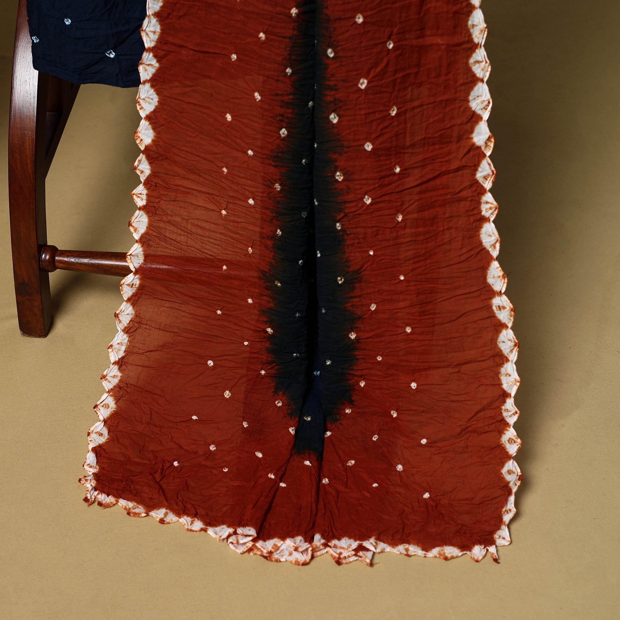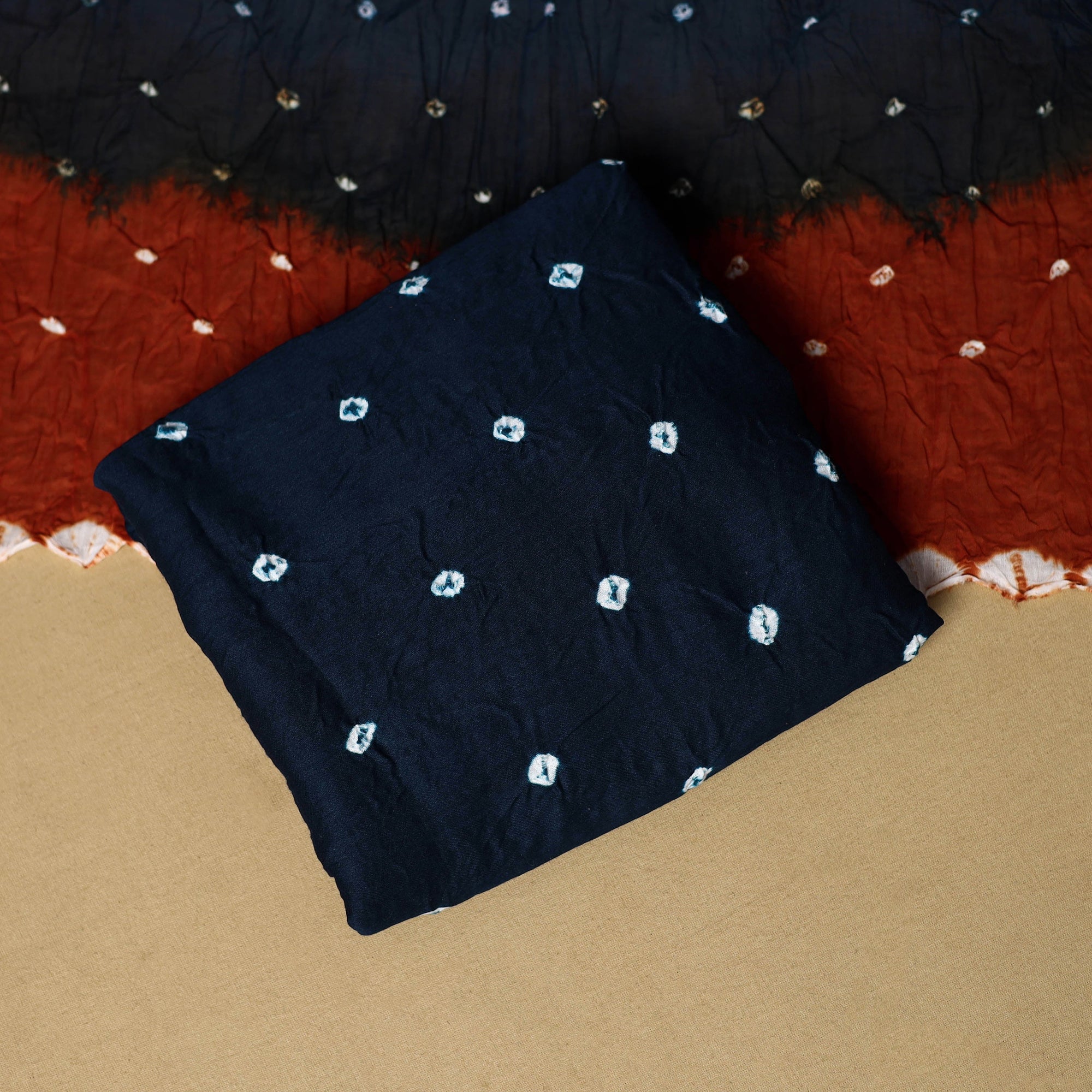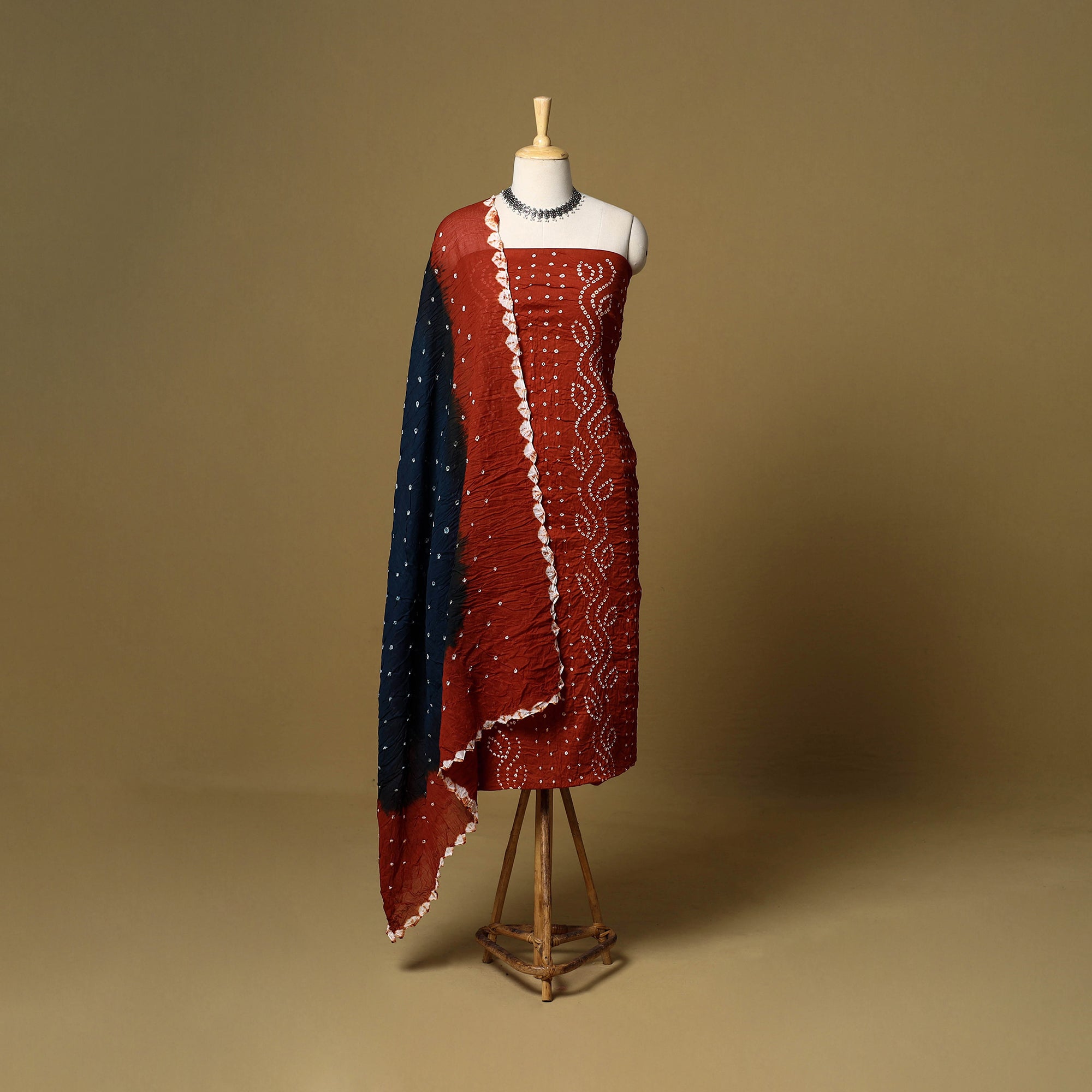 Red 3pc satin cotton bandhani dress material is crafted by artisan Shabana Khatri from Kutch. Made using the traditional tie & dye technique, each fabric piece shows beautiful bandhani patterns. The set includes fabric for a kurta, bottom and dupatta, giving you the freedom to design your own outfit. Ideal for festive occasions or everyday wear, it adds a vibrant and traditional touch to your wardrobe.