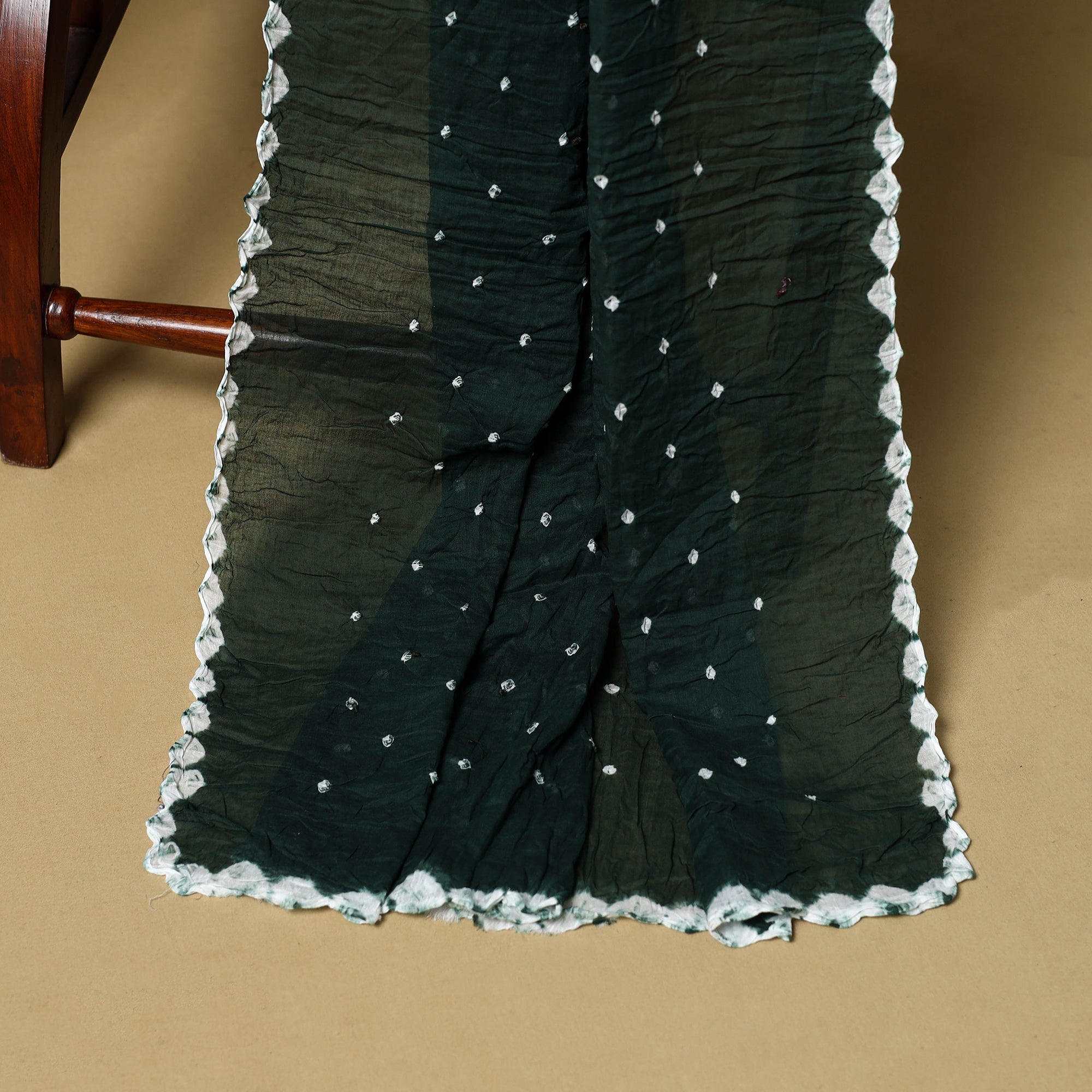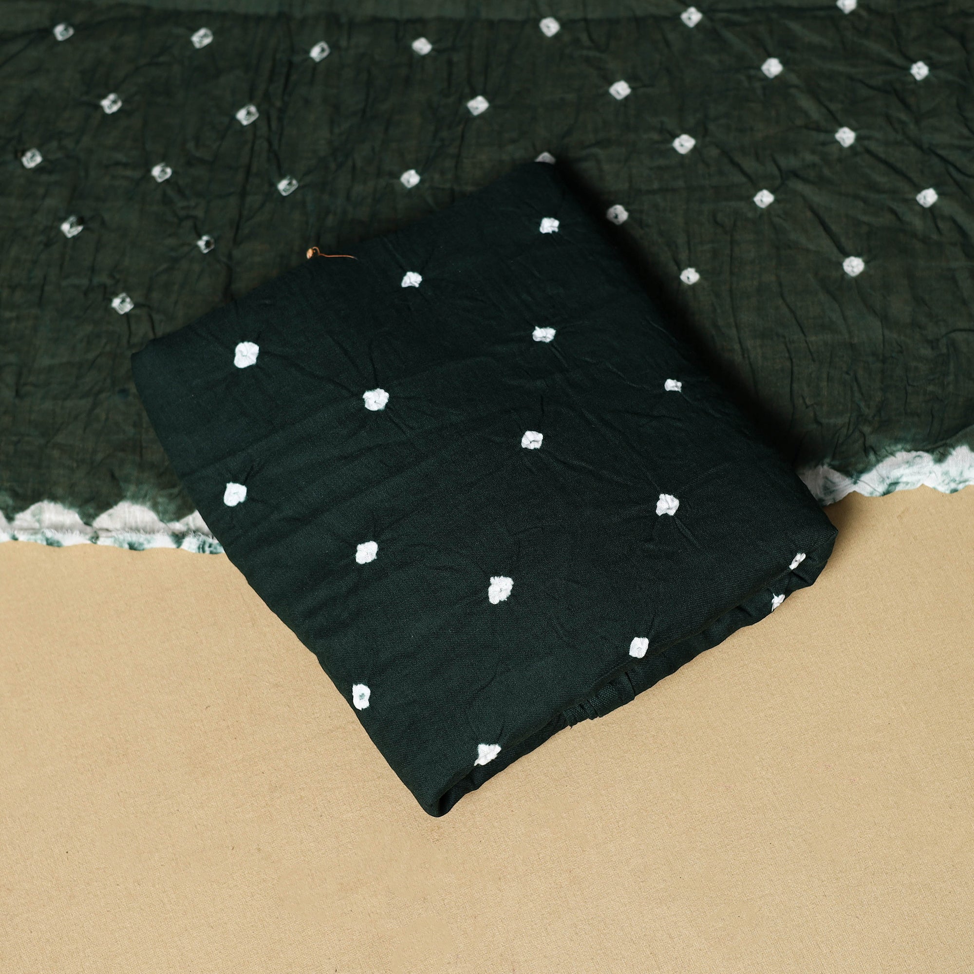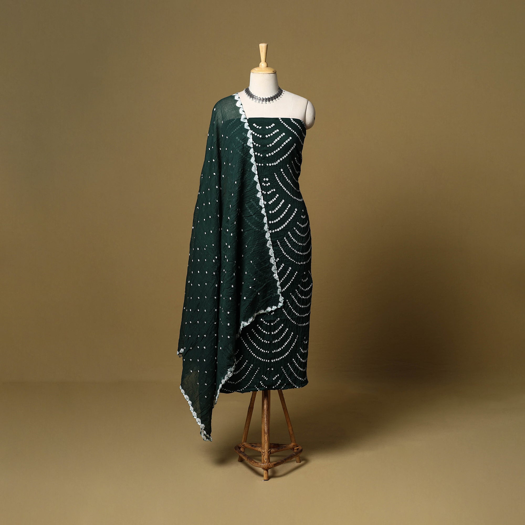 Green 3pc satin cotton bandhani dress material is crafted by artisan Shabana Khatri from Kutch. Made using the traditional tie & dye technique, each fabric piece shows beautiful bandhani patterns. The set includes fabric for a kurta, bottom and dupatta, giving you the freedom to design your own outfit. Ideal for festive occasions or everyday wear, it adds a vibrant and traditional touch to your wardrobe.