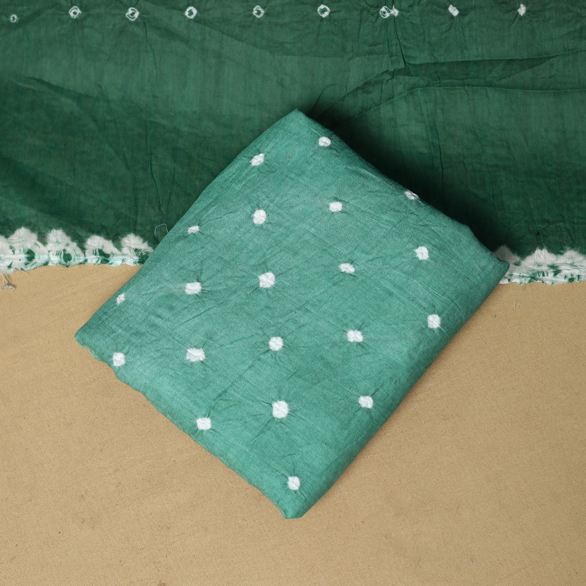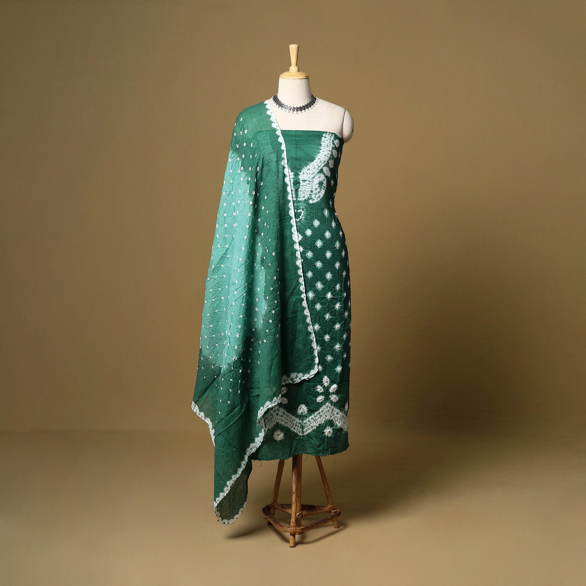 Green 3pc satin cotton bandhani dress material is crafted by artisan Shabana Khatri from Kutch. Made using the traditional tie & dye technique, each fabric piece shows beautiful bandhani patterns. The set includes fabric for a kurta, bottom and dupatta, giving you the freedom to design your own outfit. Ideal for festive occasions or everyday wear, it adds a vibrant and traditional touch to your wardrobe.