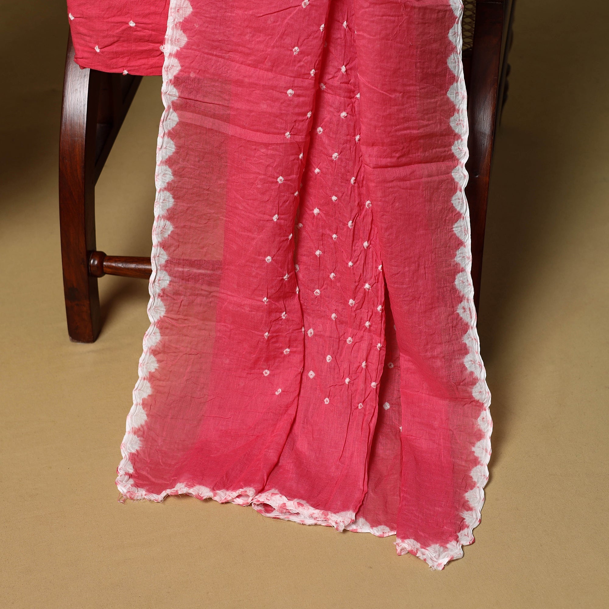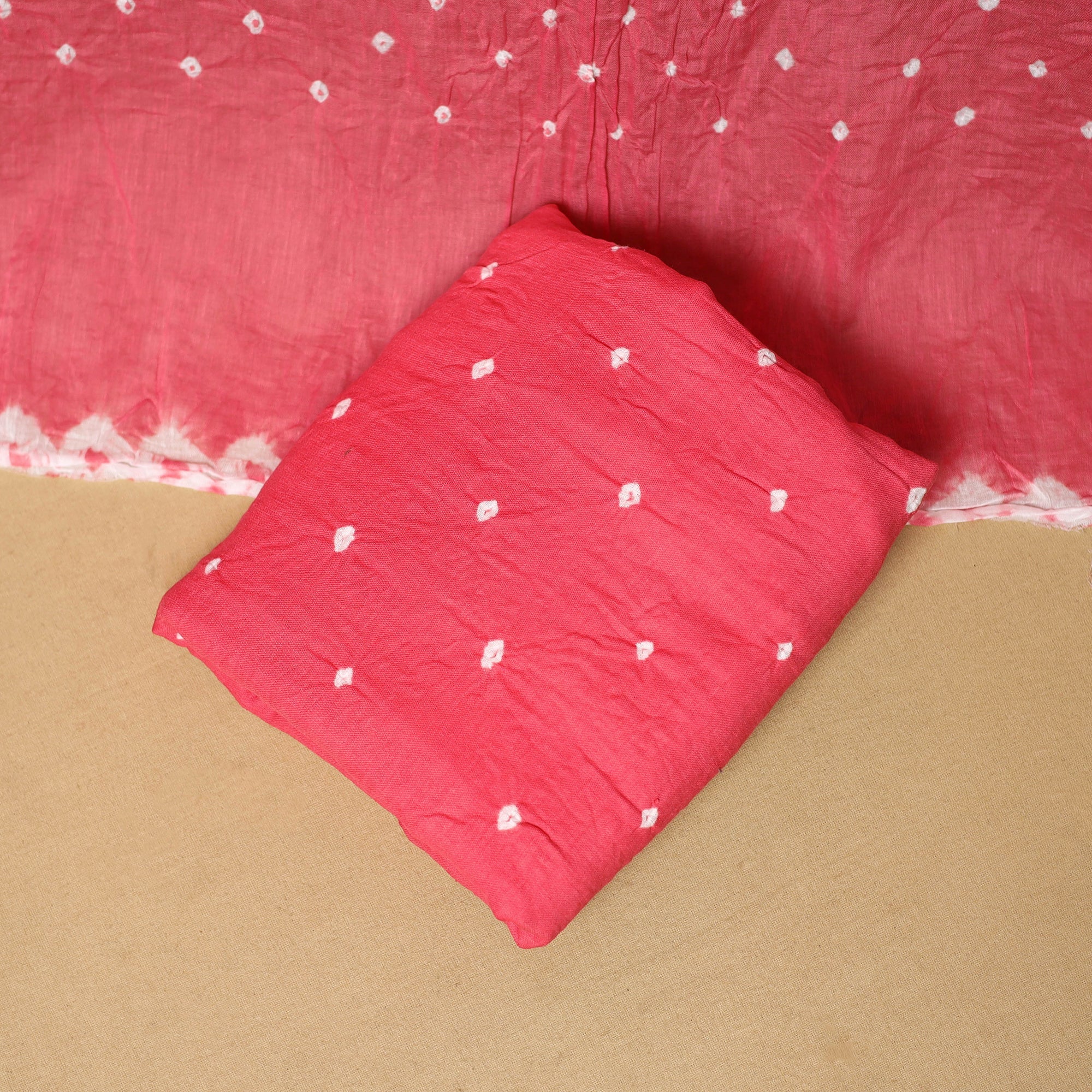 Pink 3pc satin cotton bandhani dress material is crafted by artisan Shabana Khatri from Kutch. Made using the traditional tie & dye technique, each fabric piece shows beautiful bandhani patterns. The set includes fabric for a kurta, bottom and dupatta, giving you the freedom to design your own outfit. Ideal for festive occasions or everyday wear, it adds a vibrant and traditional touch to your wardrobe.