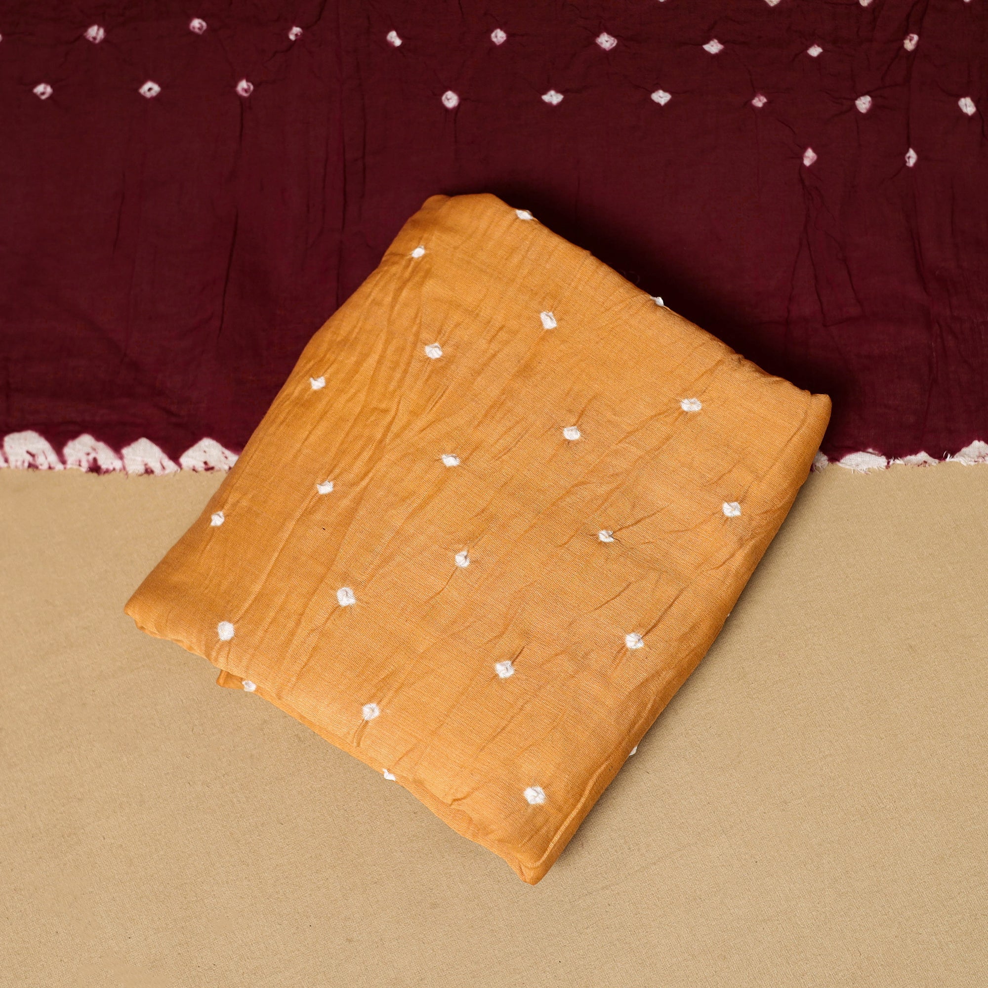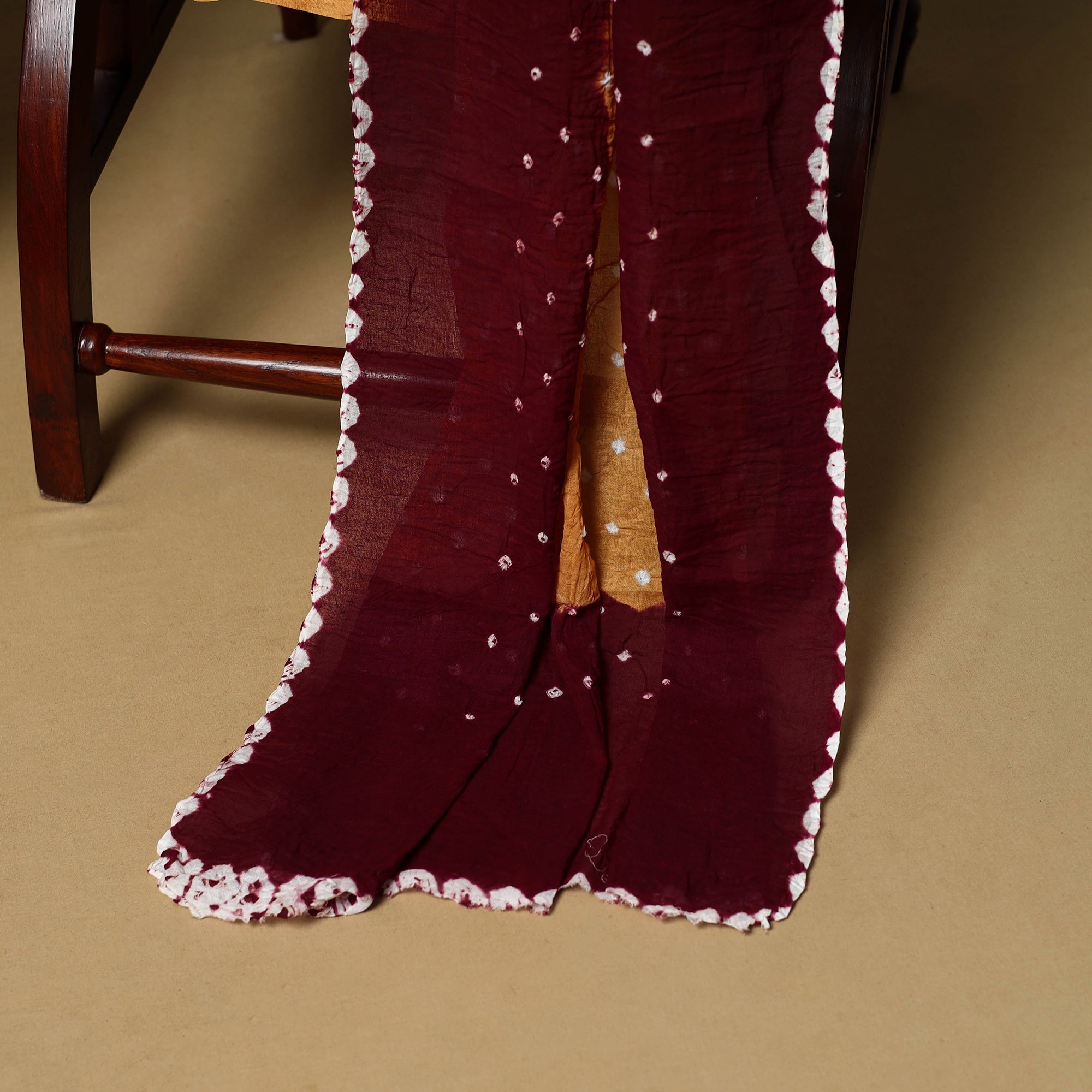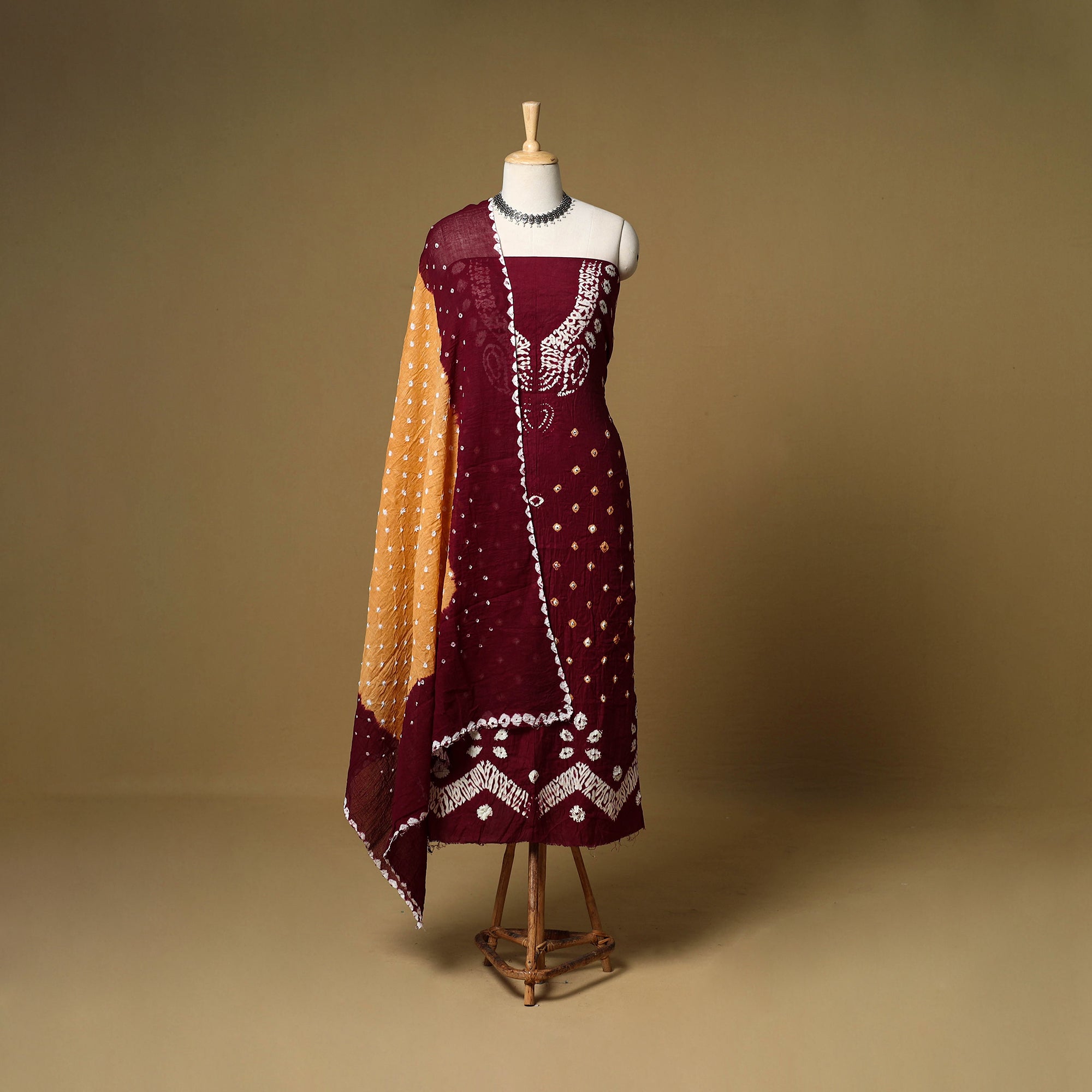Maroon 3pc satin cotton bandhani dress material is crafted by artisan Shabana Khatri from Kutch. Made using the traditional tie & dye technique, each fabric piece shows beautiful bandhani patterns. The set includes fabric for a kurta, bottom and dupatta, giving you the freedom to design your own outfit. Ideal for festive occasions or everyday wear, it adds a vibrant and traditional touch to your wardrobe.
