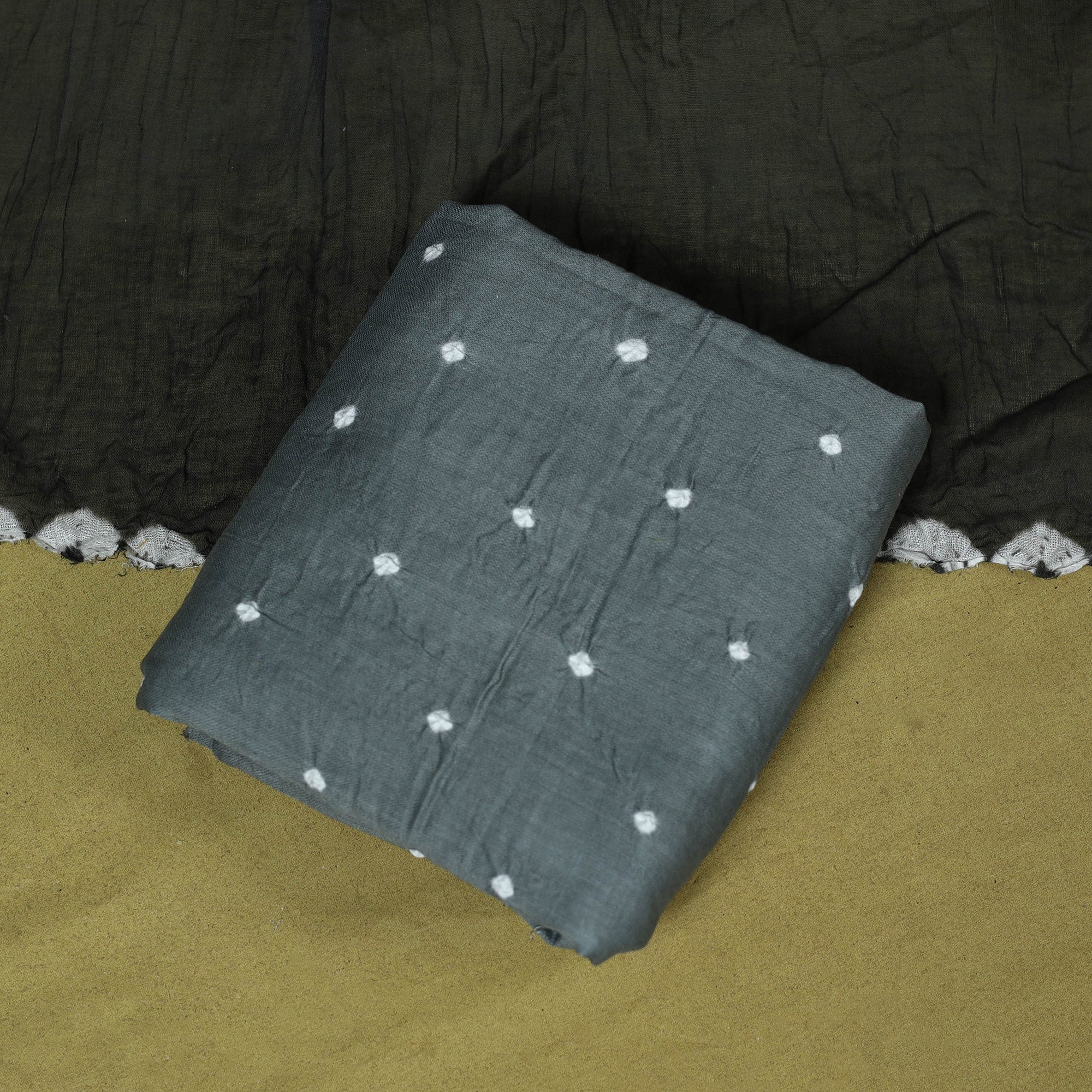 3pc satin cotton bandhani dress material is crafted by artisan Shabana Khatri from Kutch. Made using the traditional tie & dye technique, each fabric piece shows beautiful bandhani patterns. The set includes fabric for a kurta, bottom and dupatta, giving you the freedom to design your own outfit. Ideal for festive occasions or everyday wear, it adds a vibrant and traditional touch to your wardrobe.
