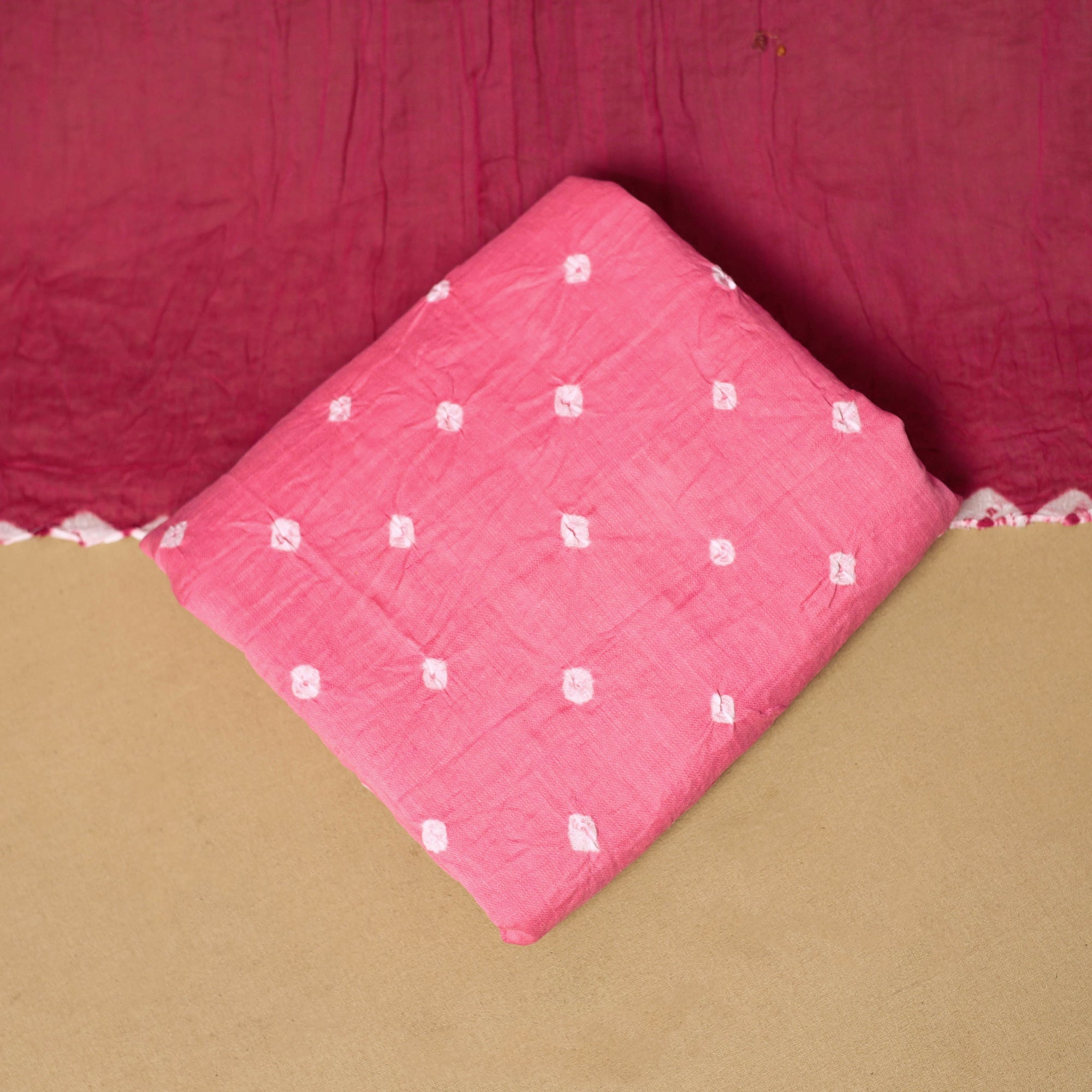 Pink 3pc satin cotton bandhani dress material is crafted by artisan Shabana Khatri from Kutch. Made using the traditional tie & dye technique, each fabric piece shows beautiful bandhani patterns. The set includes fabric for a kurta, bottom and dupatta, giving you the freedom to design your own outfit. Ideal for festive occasions or everyday wear, it adds a vibrant and traditional touch to your wardrobe.