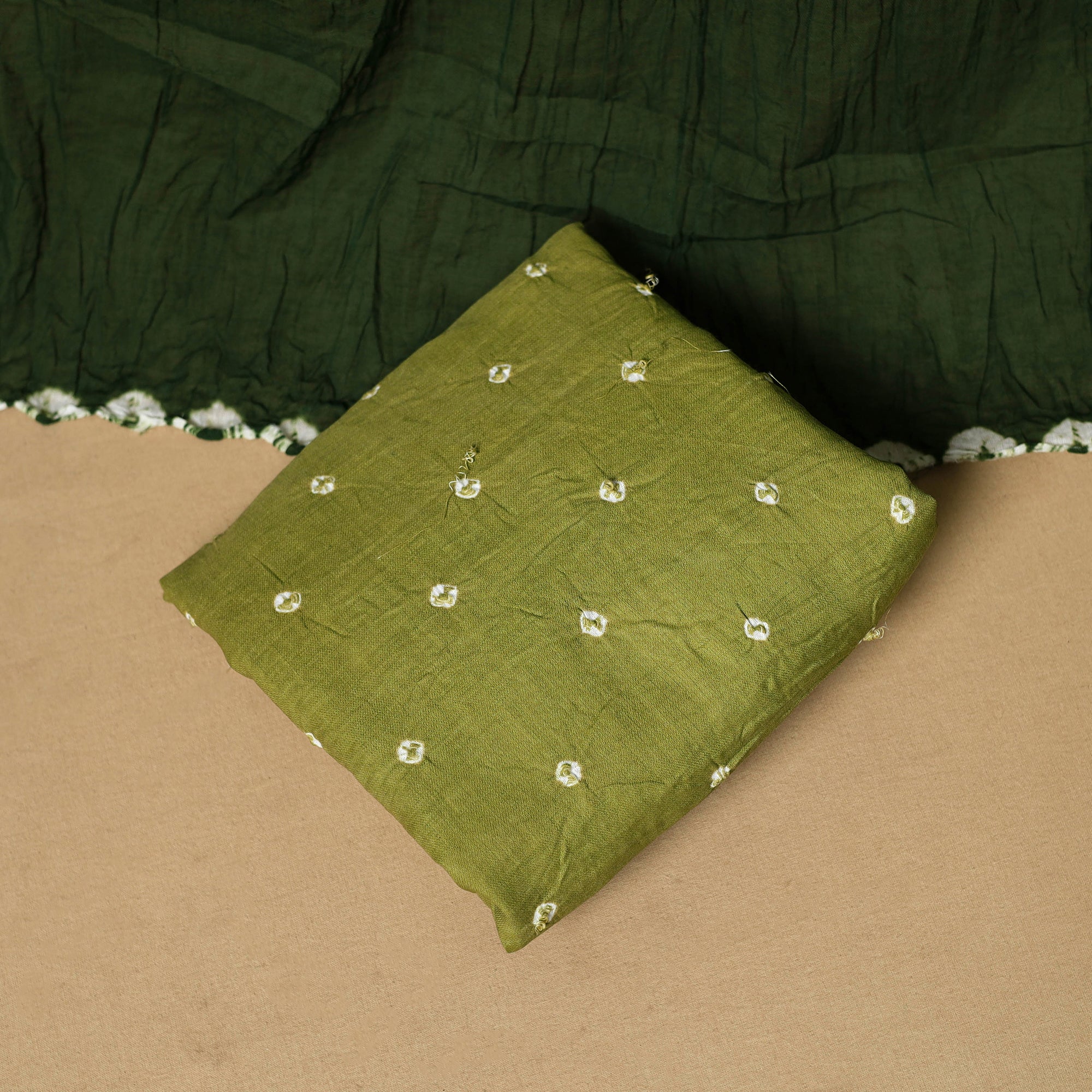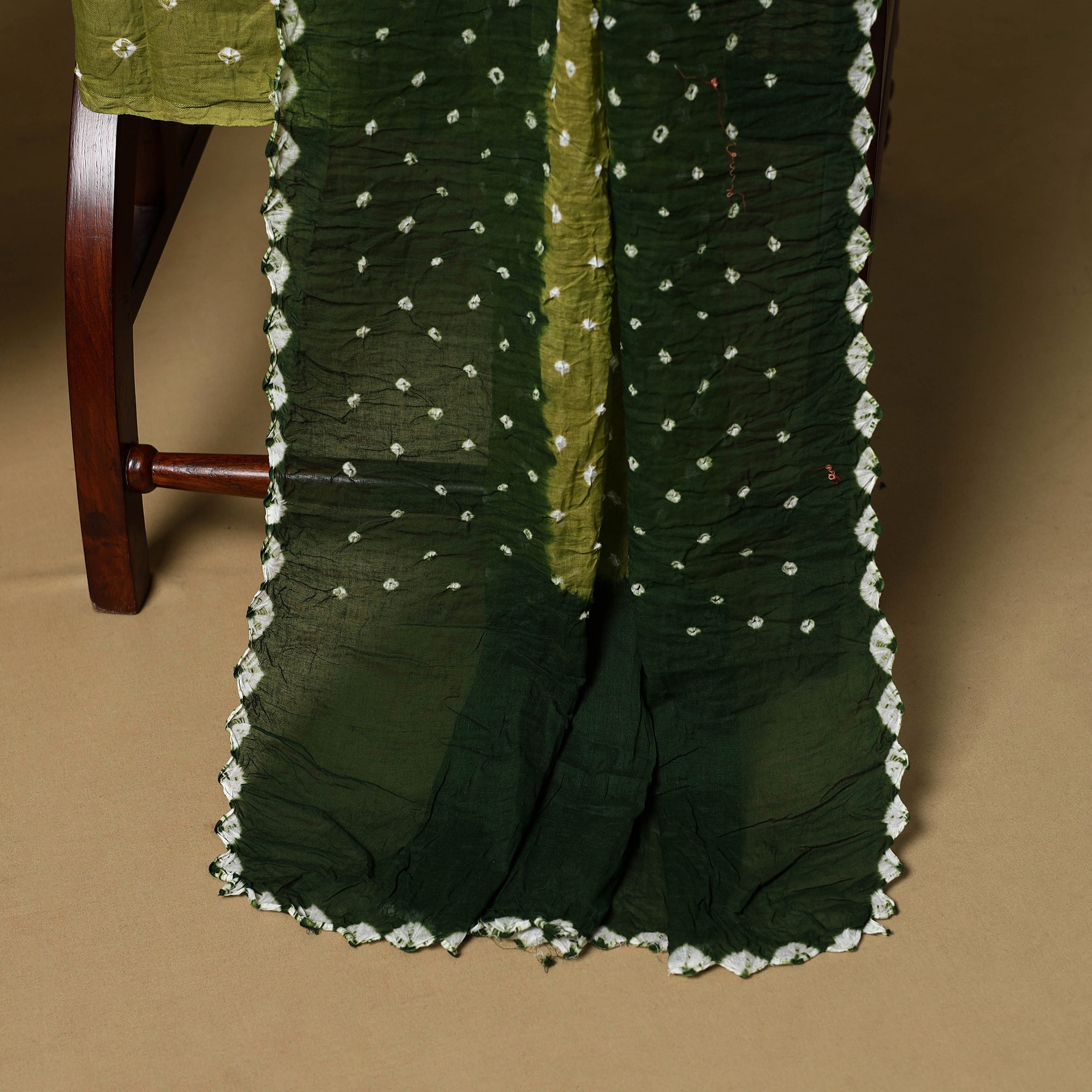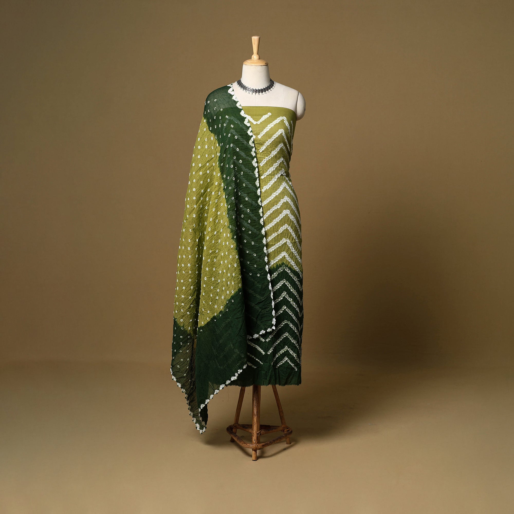 Green 3pc satin cotton bandhani dress material is crafted by artisan Shabana Khatri from Kutch. Made using the traditional tie & dye technique, each fabric piece shows beautiful bandhani patterns. The set includes fabric for a kurta, bottom and dupatta, giving you the freedom to design your own outfit. Ideal for festive occasions or everyday wear, it adds a vibrant and traditional touch to your wardrobe.