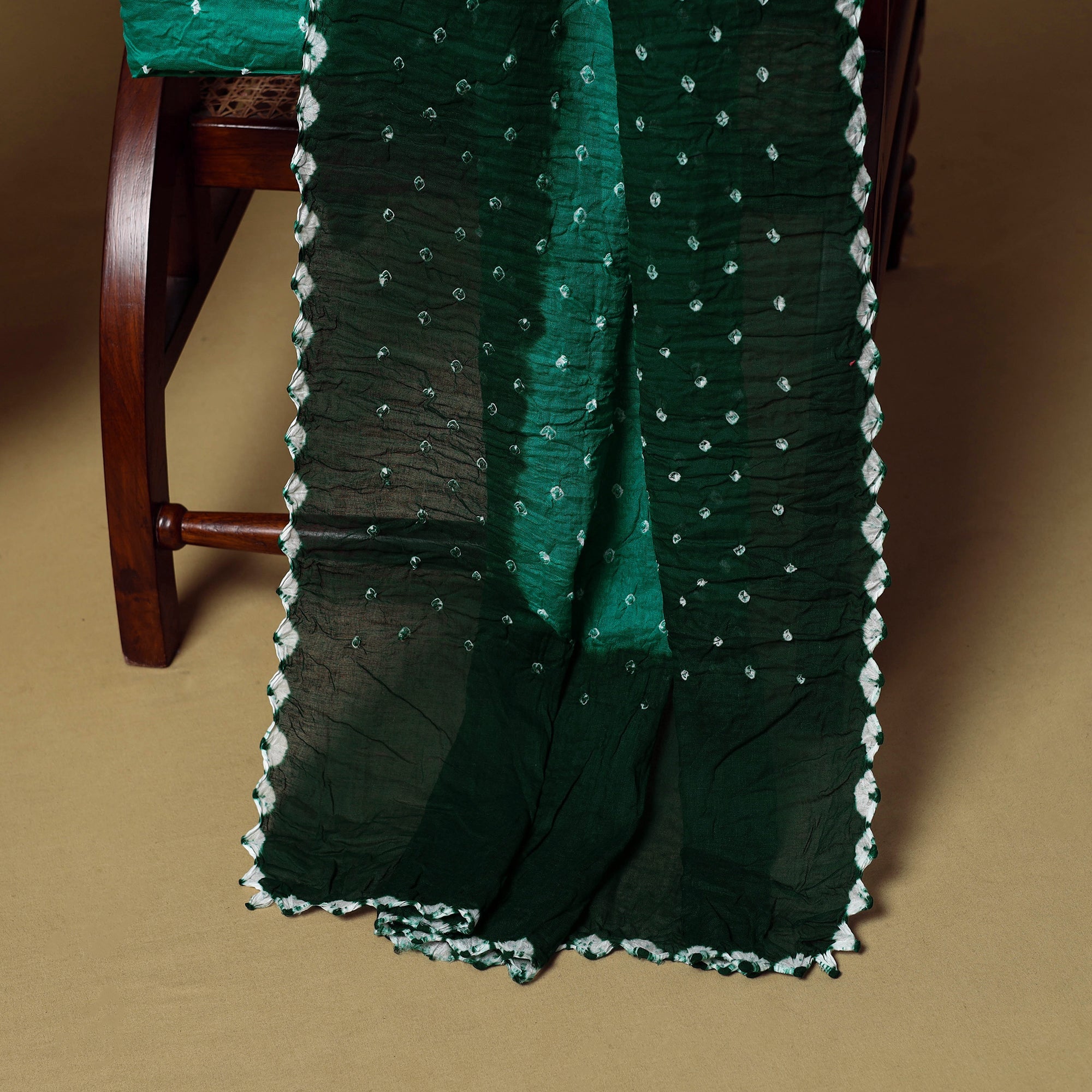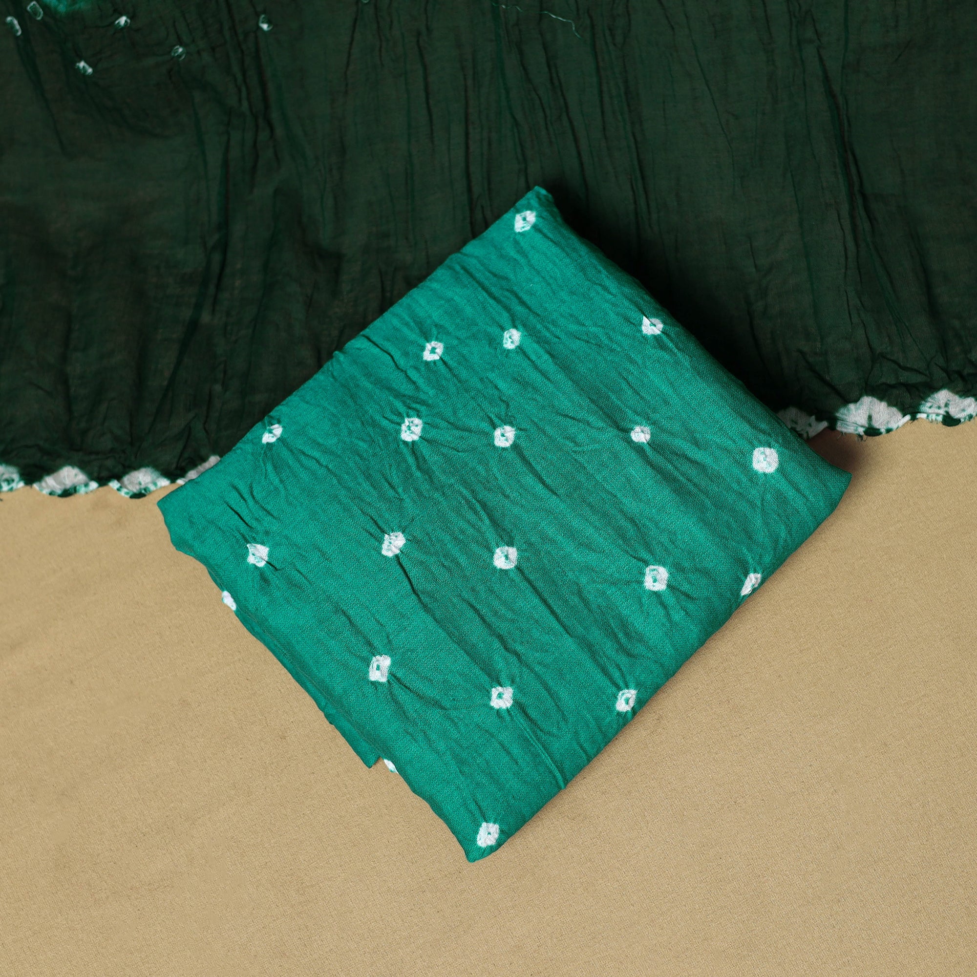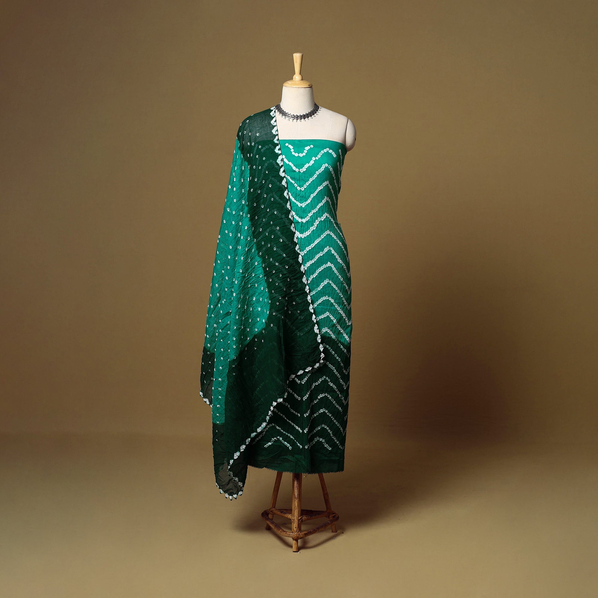 Green 3pc satin cotton bandhani dress material is crafted by artisan Shabana Khatri from Kutch. Made using the traditional tie & dye technique, each fabric piece shows beautiful bandhani patterns. The set includes fabric for a kurta, bottom and dupatta, giving you the freedom to design your own outfit. Ideal for festive occasions or everyday wear, it adds a vibrant and traditional touch to your wardrobe.