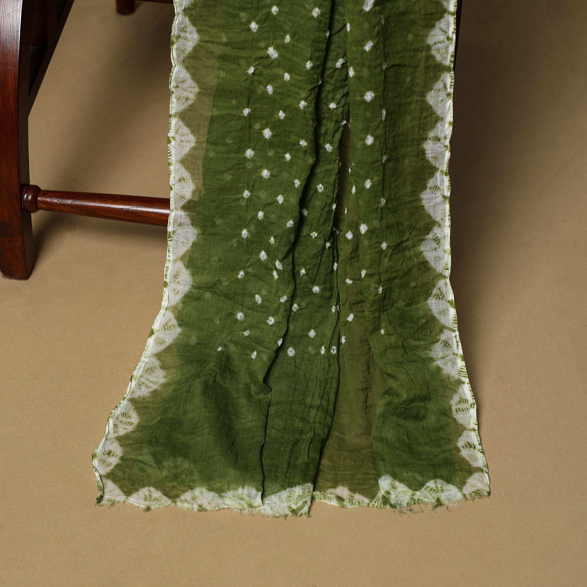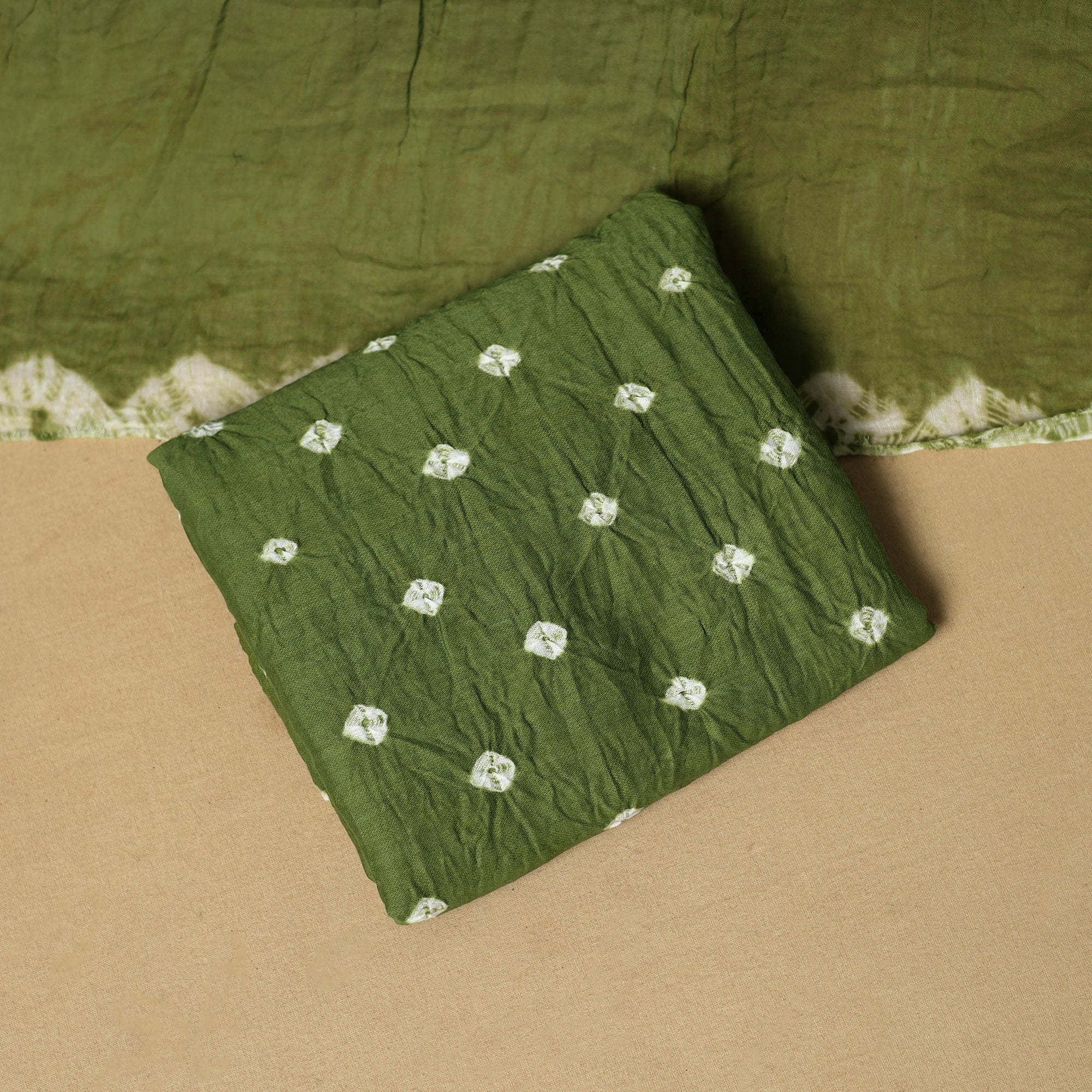 Green 3pc satin cotton bandhani dress material is crafted by artisan Shabana Khatri from Kutch. Made using the traditional tie & dye technique, each fabric piece shows beautiful bandhani patterns. The set includes fabric for a kurta, bottom and dupatta, giving you the freedom to design your own outfit. Ideal for festive occasions or everyday wear, it adds a vibrant and traditional touch to your wardrobe.