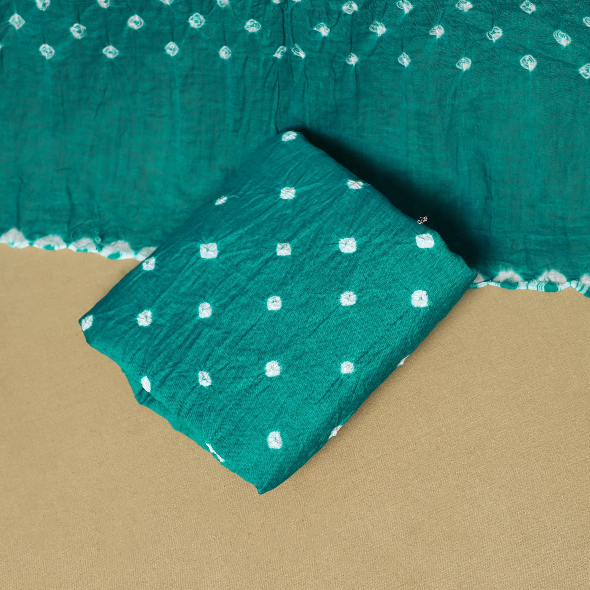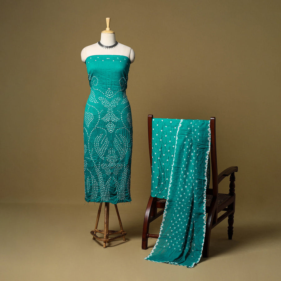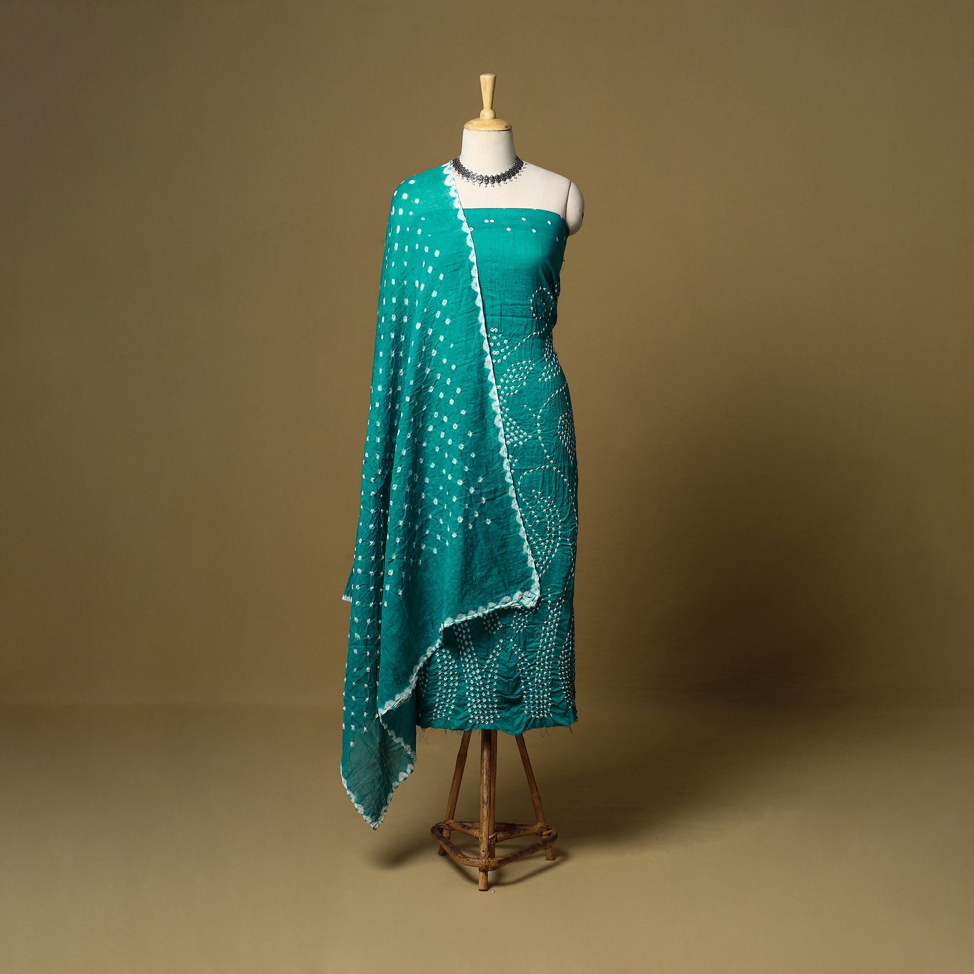 Green 3pc satin cotton bandhani dress material is crafted by artisan Shabana Khatri from Kutch. Made using the traditional tie & dye technique, each fabric piece shows beautiful bandhani patterns. The set includes fabric for a kurta, bottom and dupatta, giving you the freedom to design your own outfit. Ideal for festive occasions or everyday wear, it adds a vibrant and traditional touch to your wardrobe.