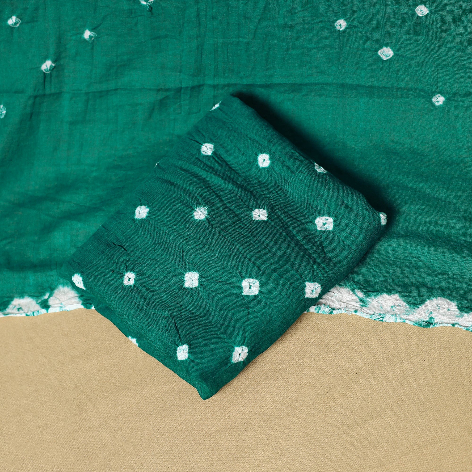 Green 3pc satin cotton bandhani dress material is crafted by artisan Shabana Khatri from Kutch. Made using the traditional tie & dye technique, each fabric piece shows beautiful bandhani patterns. The set includes fabric for a kurta, bottom and dupatta, giving you the freedom to design your own outfit. Ideal for festive occasions or everyday wear, it adds a vibrant and traditional touch to your wardrobe.