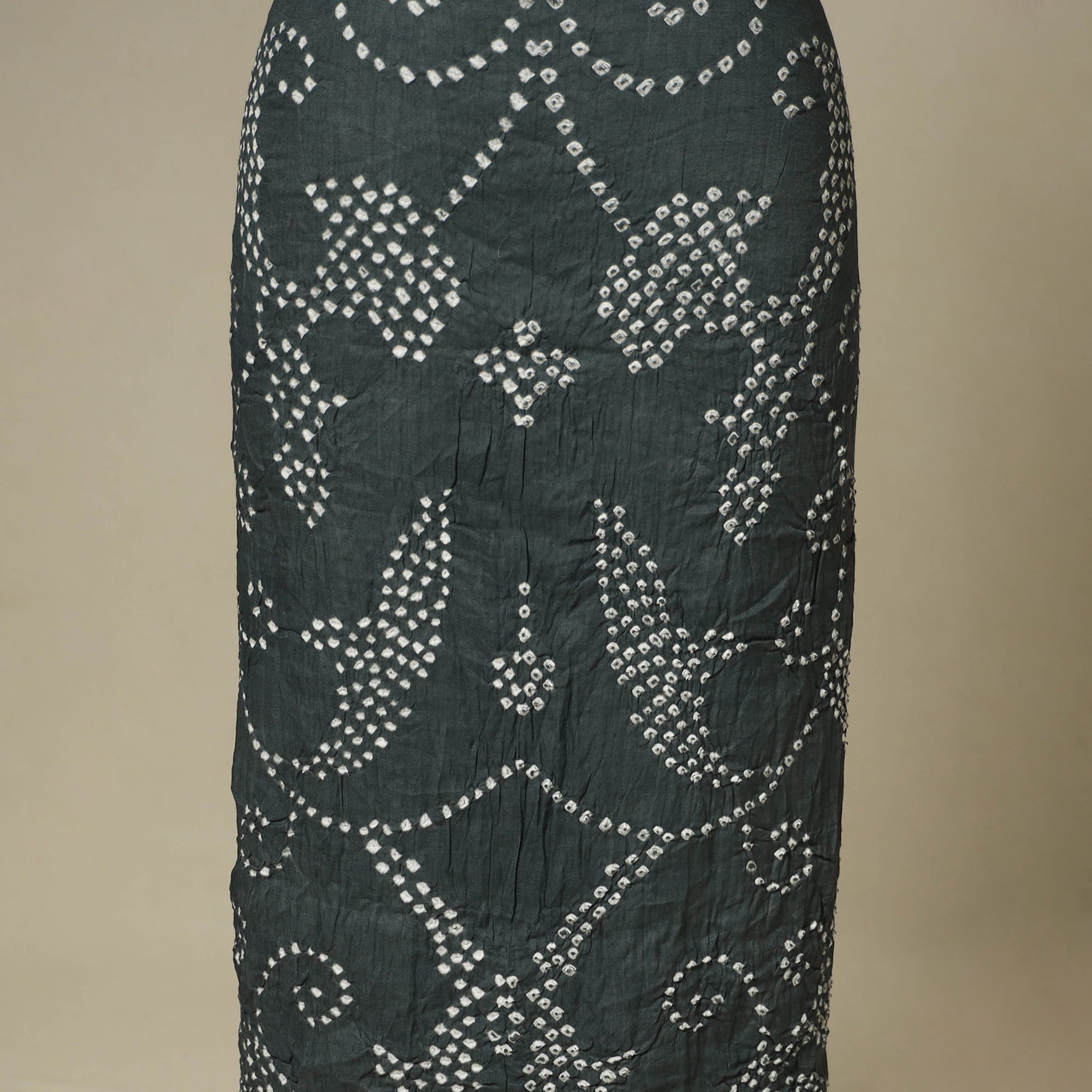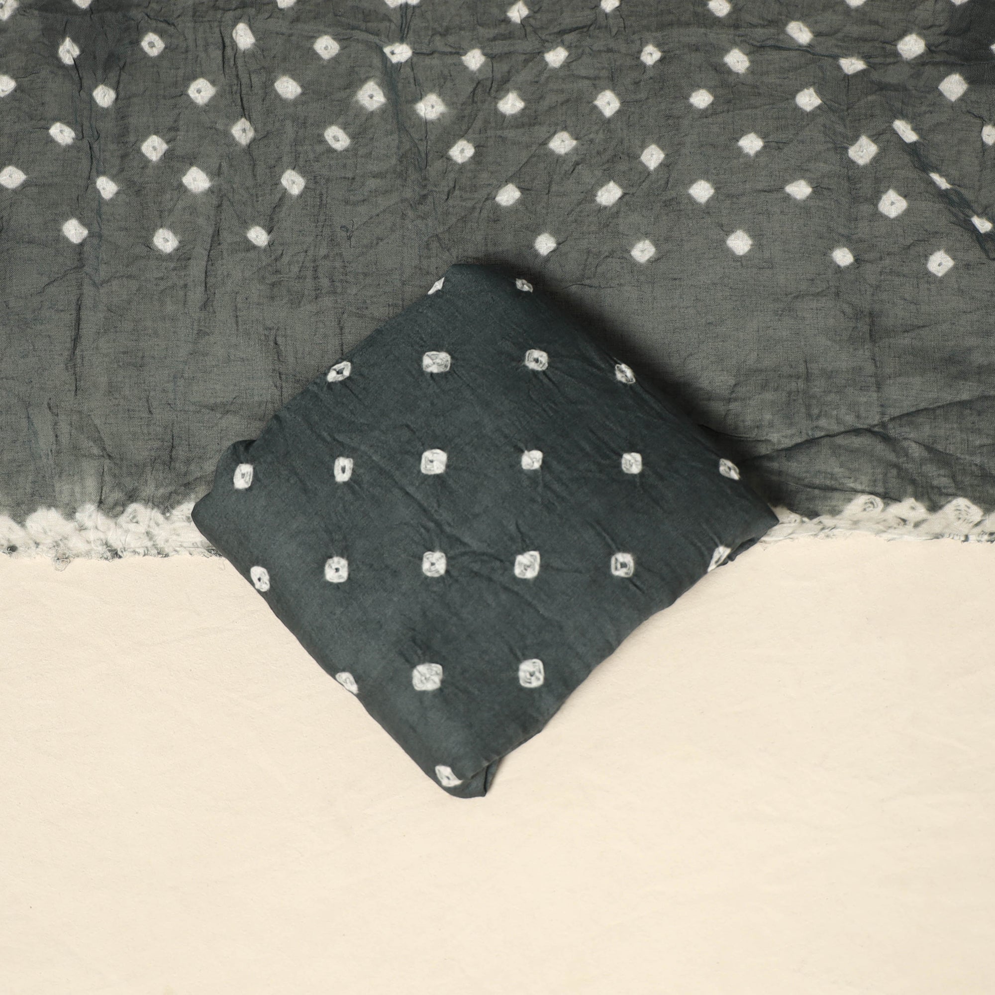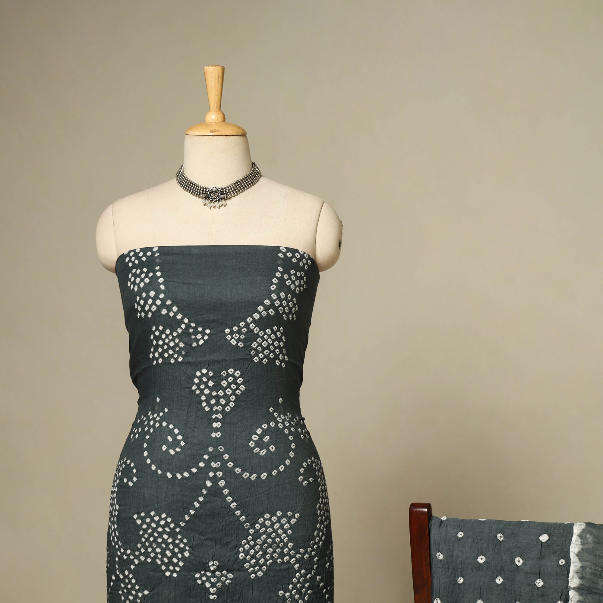 Add a touch of charm to your wardrobe with this grey 3pc satin cotton bandhani dress material by artisan Shabana Khatri from Kutch. Crafted using traditional tie-and-dye techniques, each section of the fabric is meticulously tied and dyed to form stunning, detailed patterns. The set includes fabric for a kurta, matching bottom, and dupatta, deal for festive wear, everyday comfort, or designing a style that’s uniquely yours.