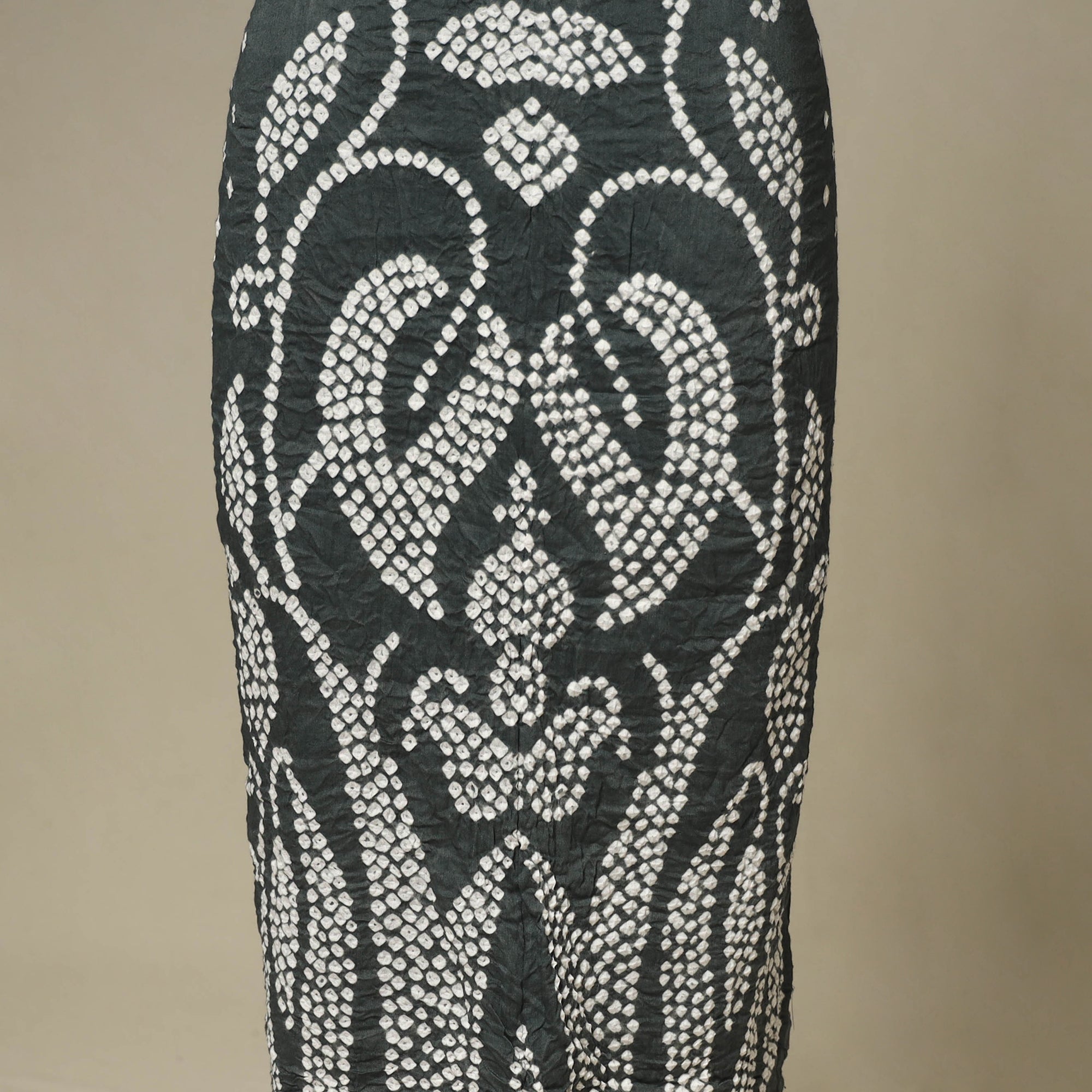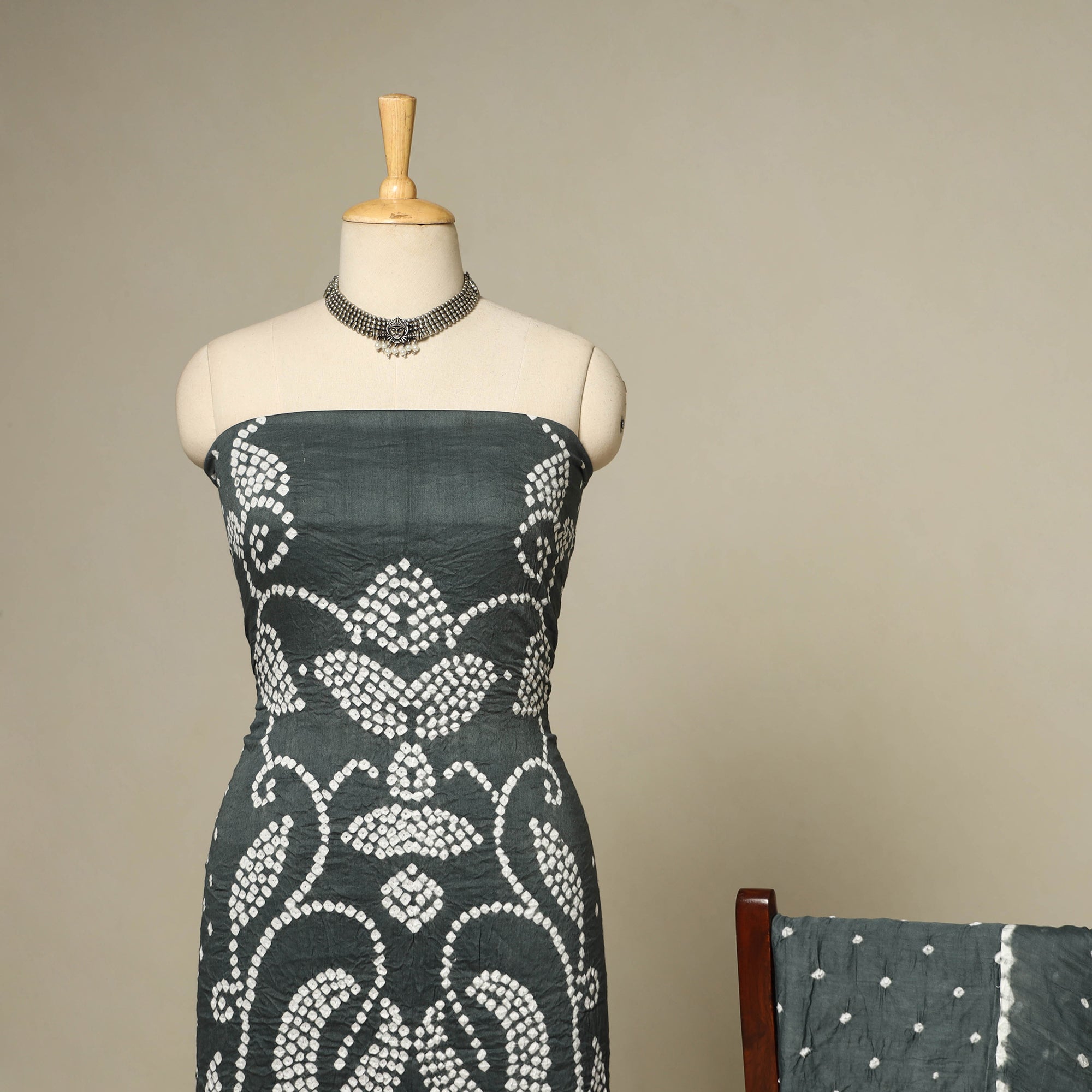 Add a touch of charm to your wardrobe with this grey 3pc satin cotton bandhani dress material by artisan Shabana Khatri from Kutch. Crafted using traditional tie-and-dye techniques, each section of the fabric is meticulously tied and dyed to form stunning, detailed patterns. The set includes fabric for a kurta, matching bottom, and dupatta, deal for festive wear, everyday comfort, or designing a style that’s uniquely yours.