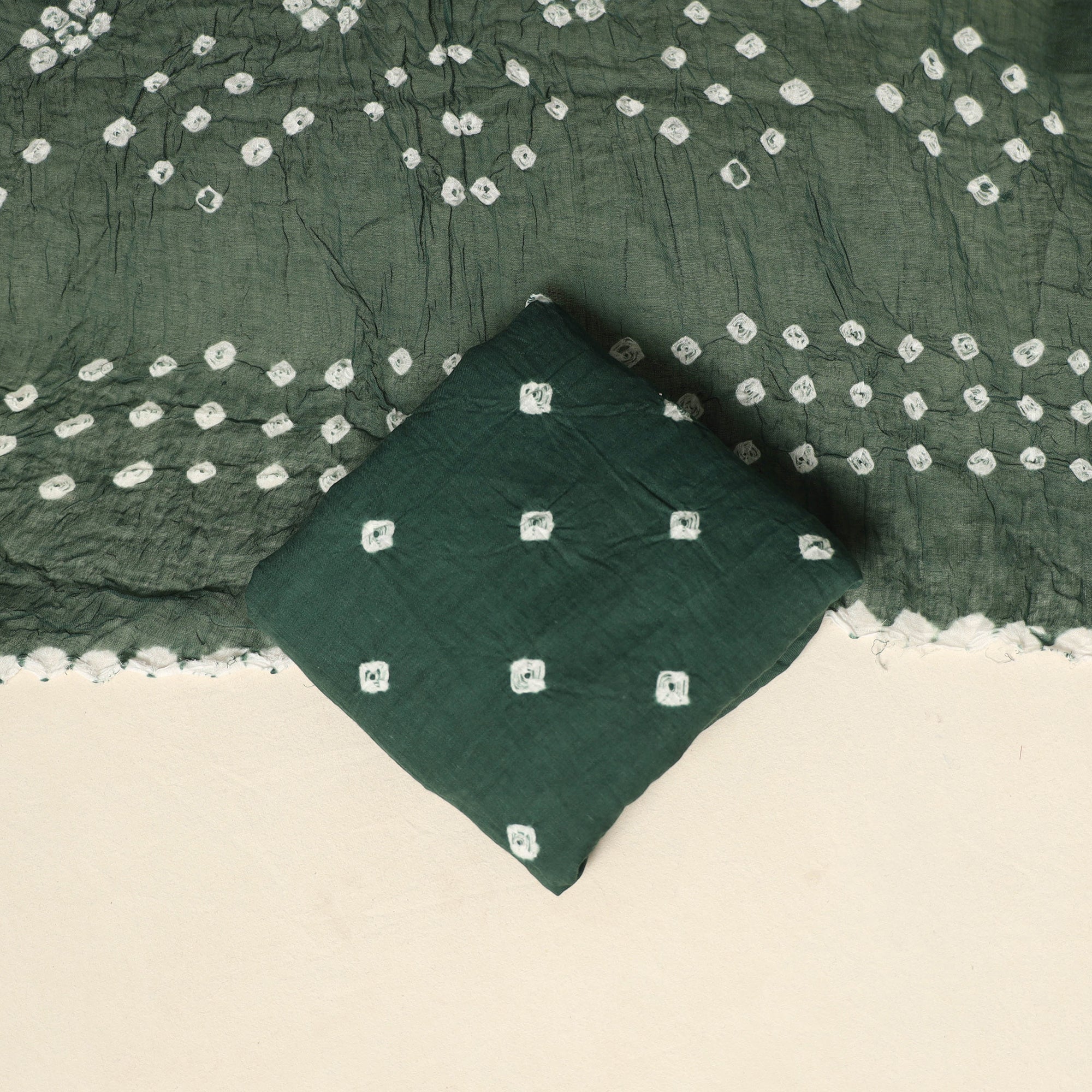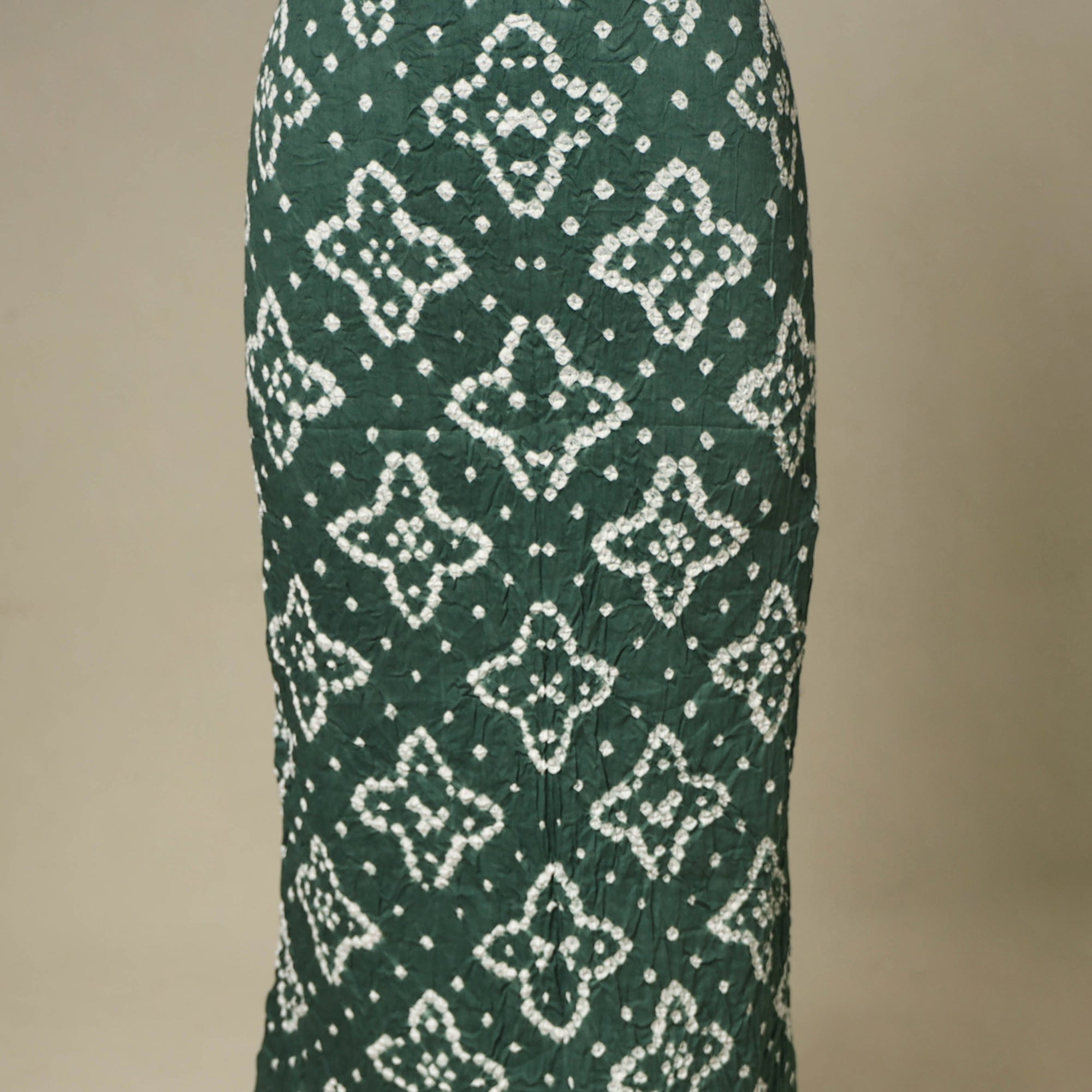 Add a touch of charm to your wardrobe with this green 3pc satin cotton bandhani dress material by artisan Shabana Khatri from Kutch. Crafted using traditional tie-and-dye techniques, each section of the fabric is meticulously tied and dyed to form stunning, detailed patterns. The set includes fabric for a kurta, matching bottom, and dupatta, deal for festive wear, everyday comfort, or designing a style that’s uniquely yours.