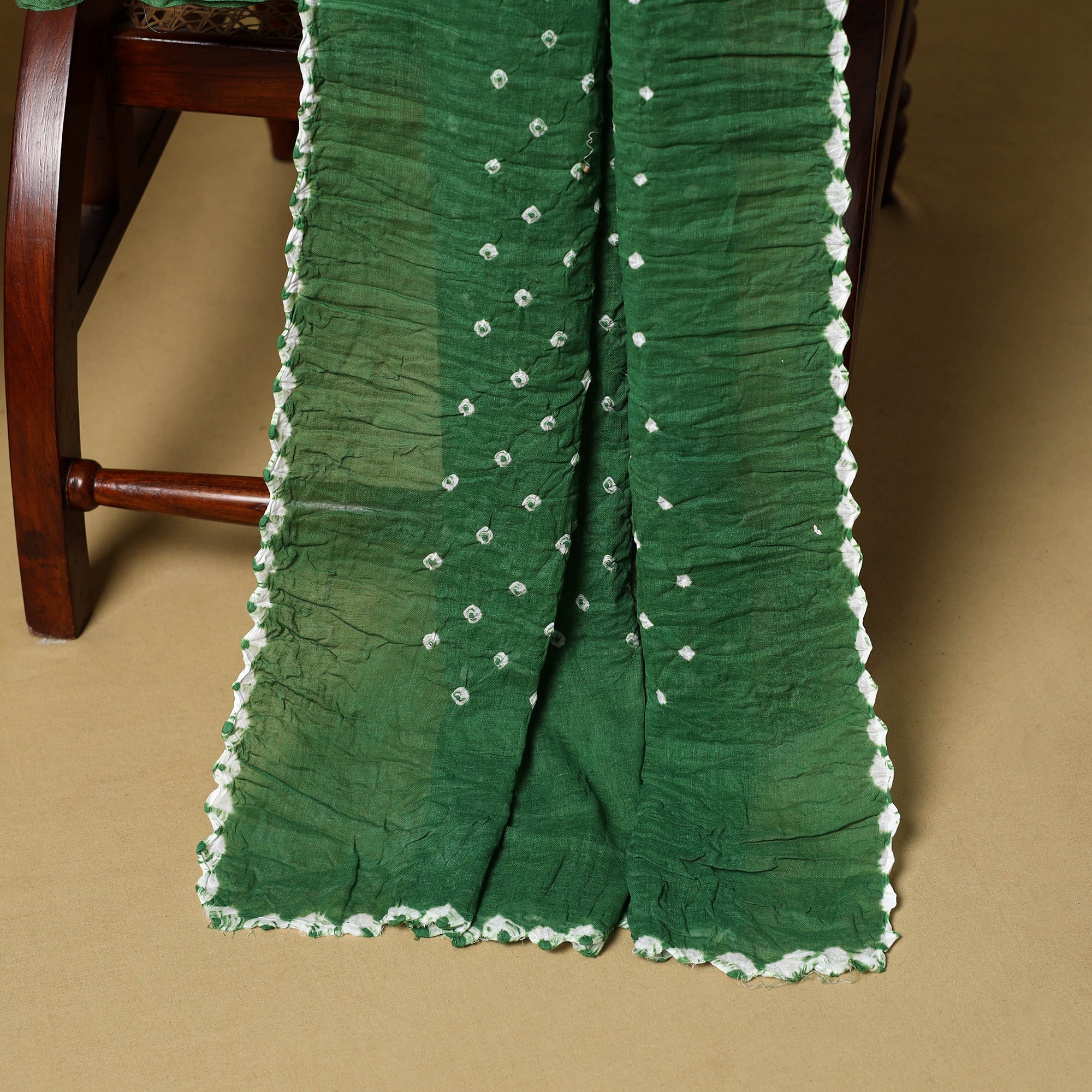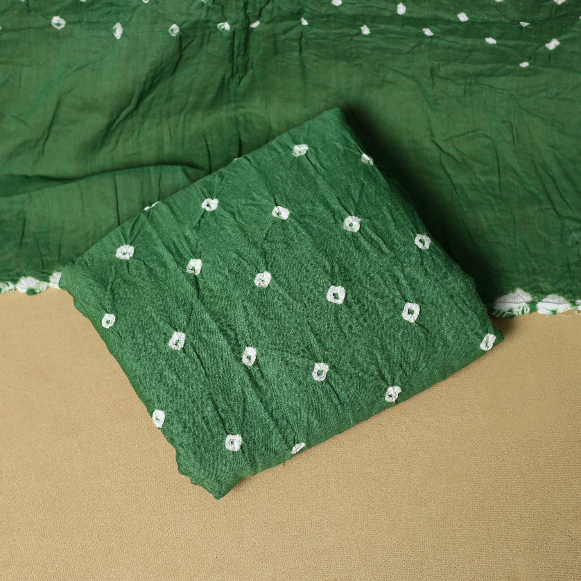 Green 3pc satin cotton bandhani dress material is crafted by artisan Shabana Khatri from Kutch. Made using the traditional tie & dye technique, each fabric piece shows beautiful bandhani patterns. The set includes fabric for a kurta, bottom and dupatta, giving you the freedom to design your own outfit. Ideal for festive occasions or everyday wear, it adds a vibrant and traditional touch to your wardrobe.