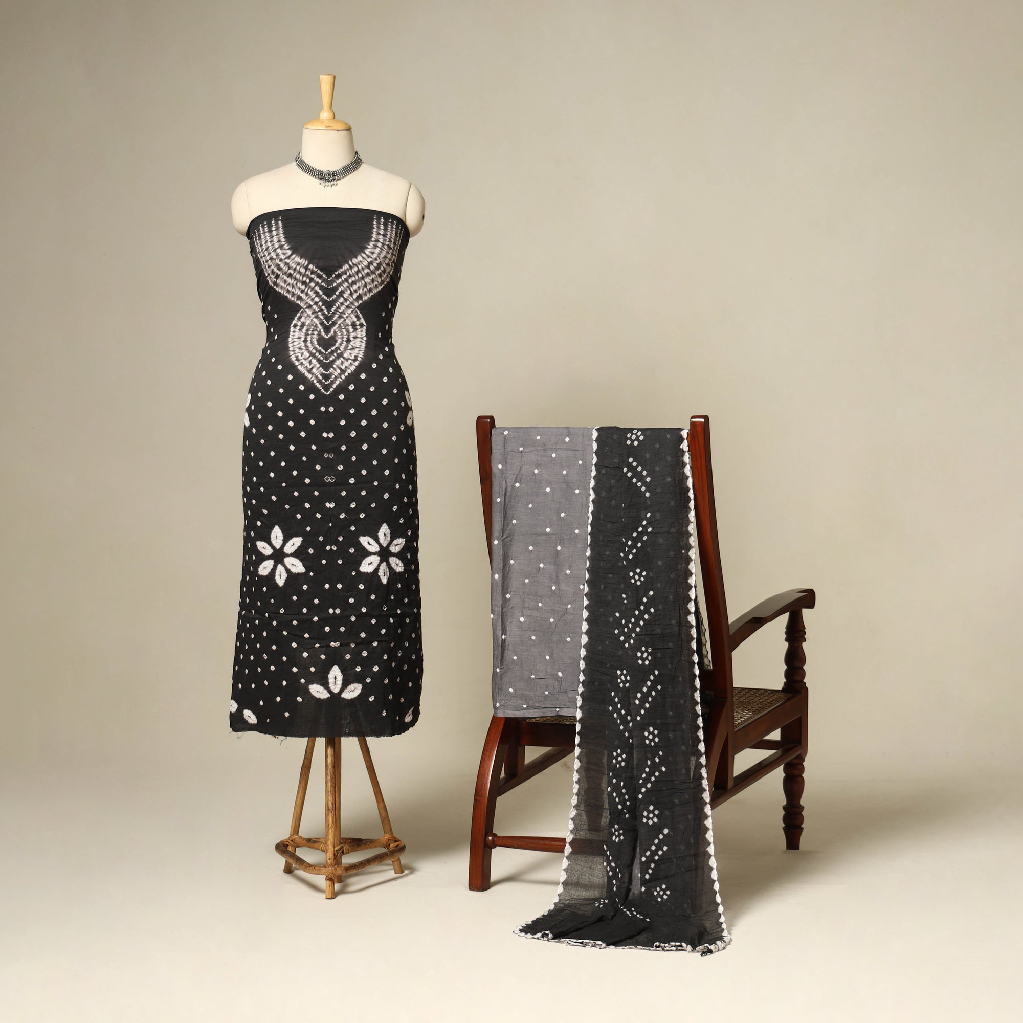 Add a touch of charm to your wardrobe with this black 3pc satin cotton bandhani dress material by artisan Shabana Khatri from Kutch. Crafted using traditional tie-and-dye techniques, each section of the fabric is meticulously tied and dyed to form stunning, detailed patterns. The set includes fabric for a kurta, matching bottom, and dupatta, deal for festive wear, everyday comfort, or designing a style that’s uniquely yours.