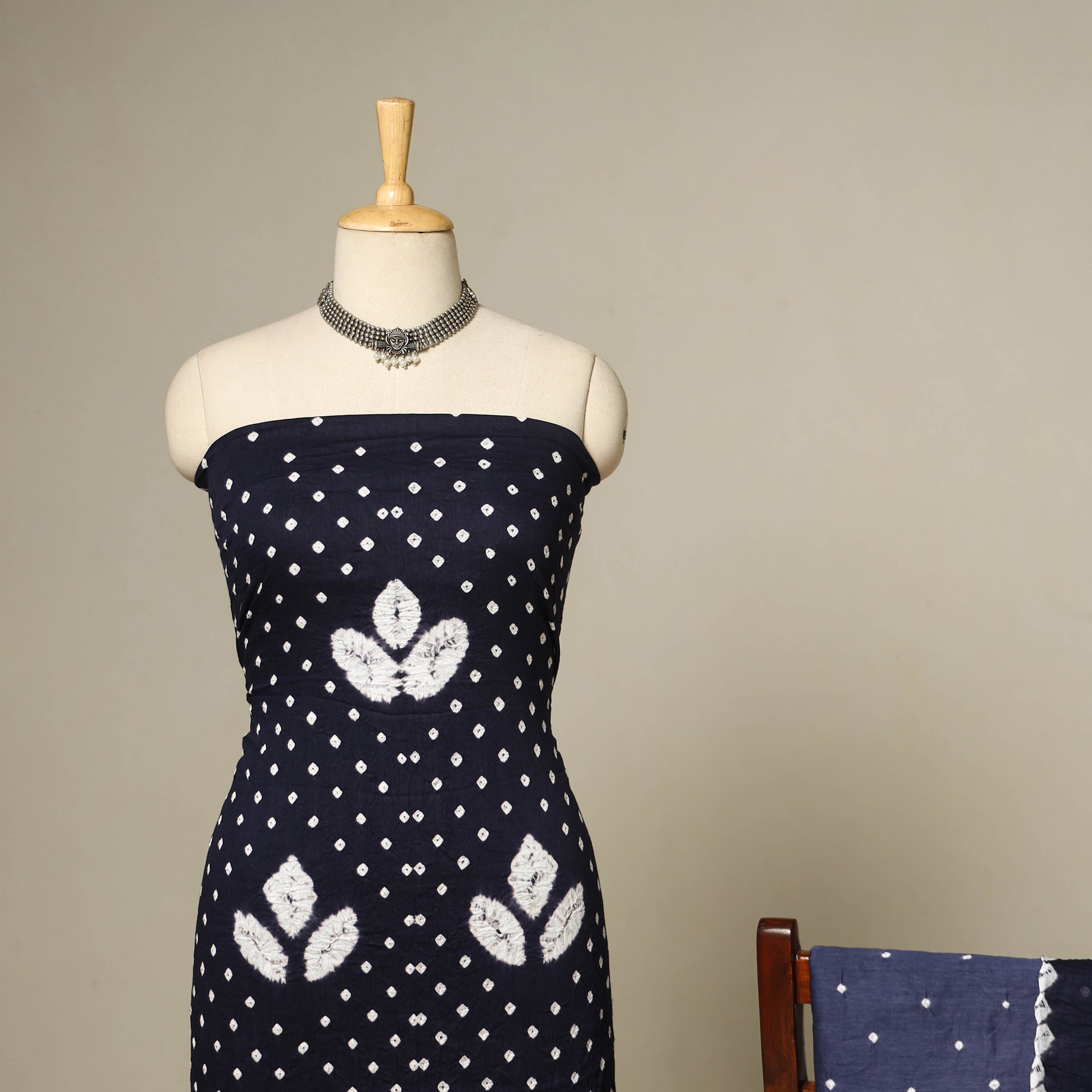 Add a touch of charm to your wardrobe with this blue 3pc satin cotton bandhani dress material by artisan Shabana Khatri from Kutch. Crafted using traditional tie-and-dye techniques, each section of the fabric is meticulously tied and dyed to form stunning, detailed patterns. The set includes fabric for a kurta, matching bottom, and dupatta, deal for festive wear, everyday comfort, or designing a style that’s uniquely yours.