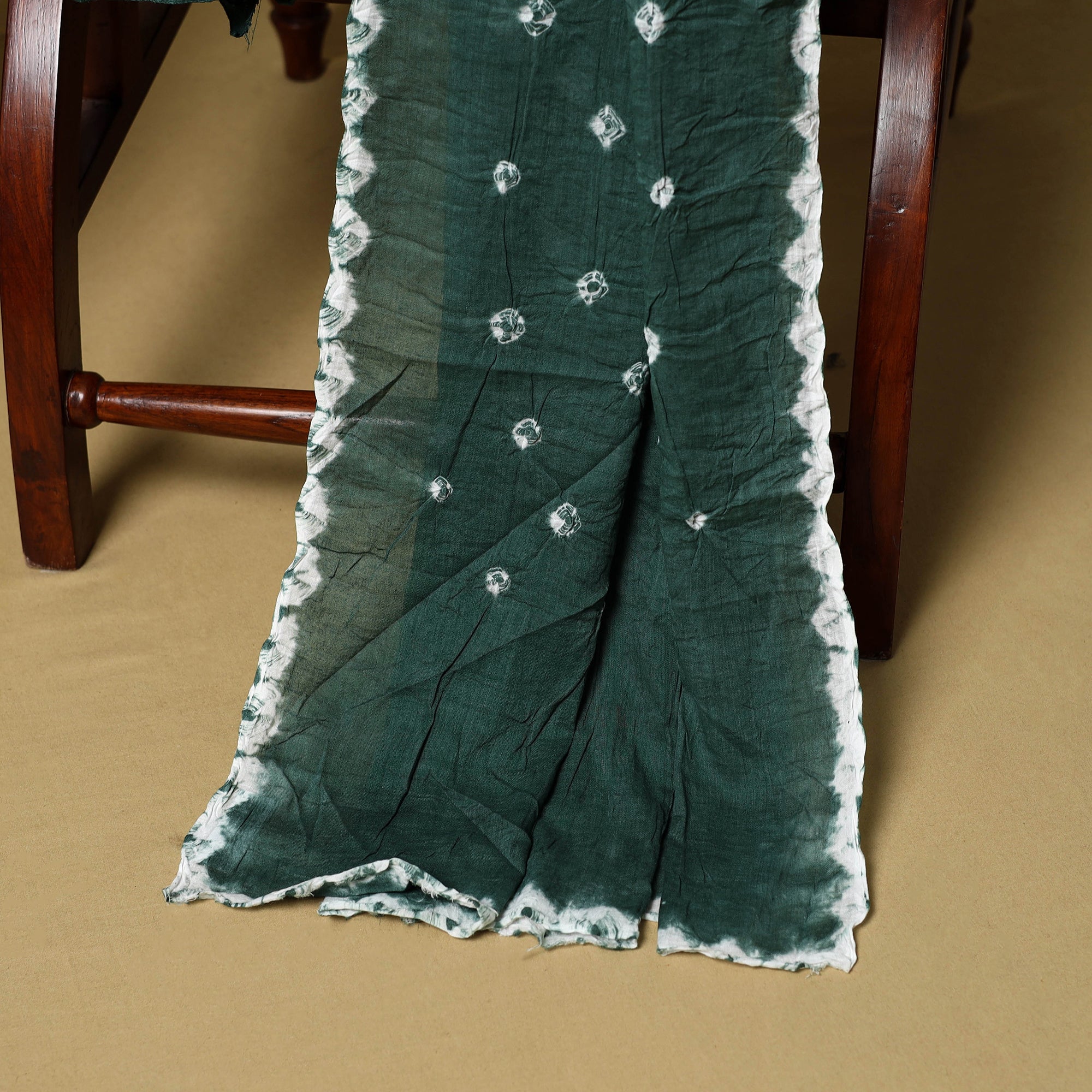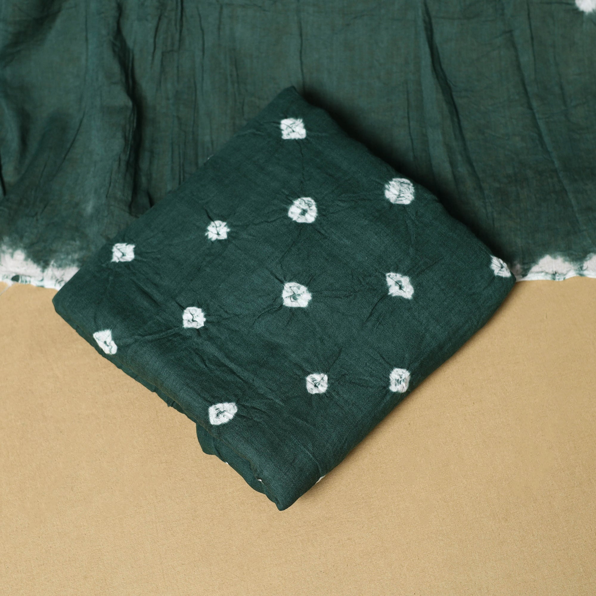Green 3pc satin cotton bandhani dress material is crafted by artisan Shabana Khatri from Kutch. Made using the traditional tie & dye technique, each fabric piece shows beautiful bandhani patterns. The set includes fabric for a kurta, bottom and dupatta, giving you the freedom to design your own outfit. Ideal for festive occasions or everyday wear, it adds a vibrant and traditional touch to your wardrobe.