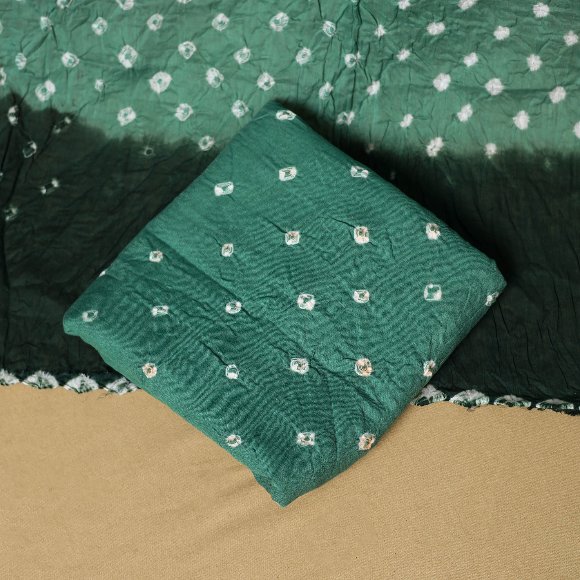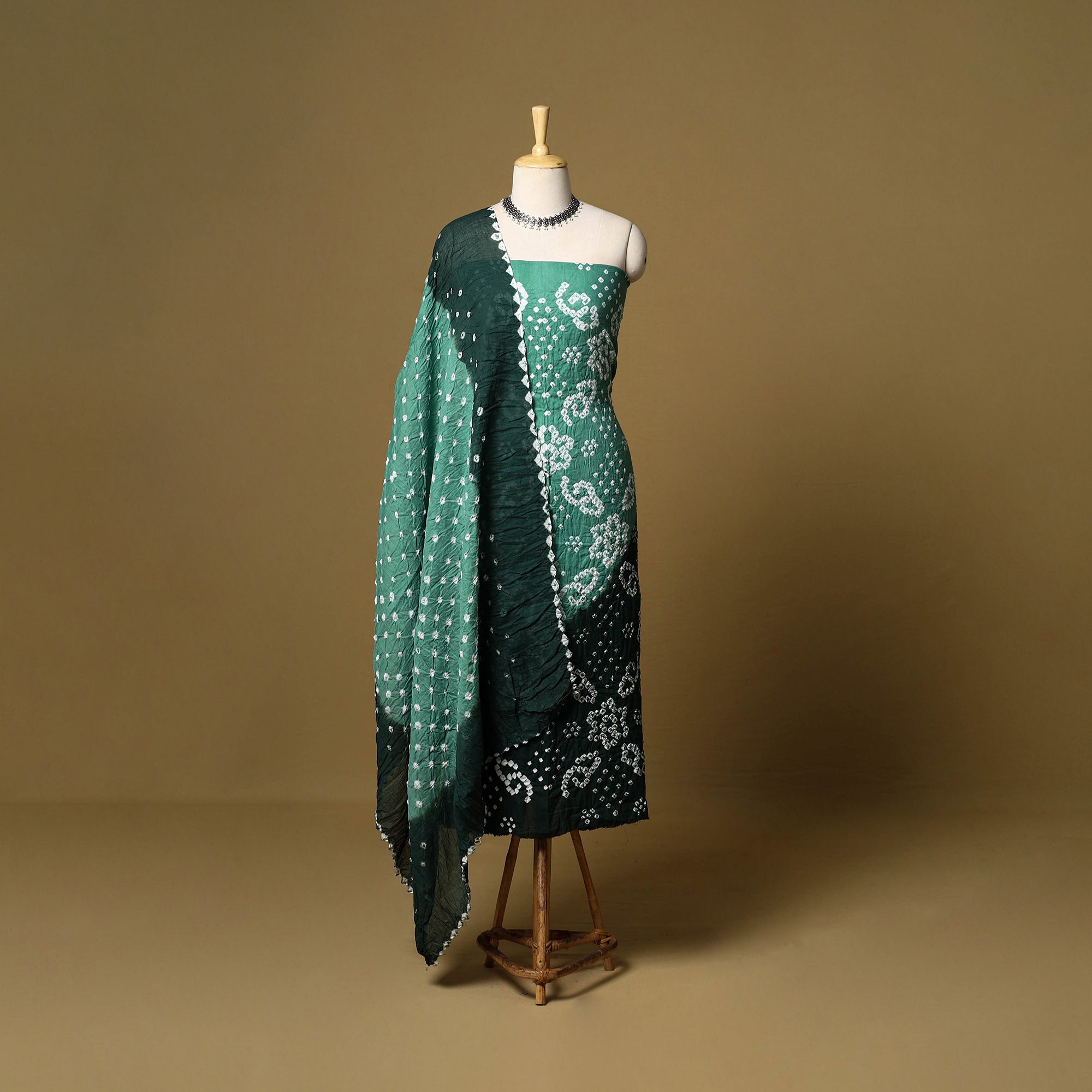 Green 3pc satin cotton bandhani dress material is crafted by artisan Shabana Khatri from Kutch. Made using the traditional tie & dye technique, each fabric piece shows beautiful bandhani patterns. The set includes fabric for a kurta, bottom and dupatta, giving you the freedom to design your own outfit. Ideal for festive occasions or everyday wear, it adds a vibrant and traditional touch to your wardrobe.