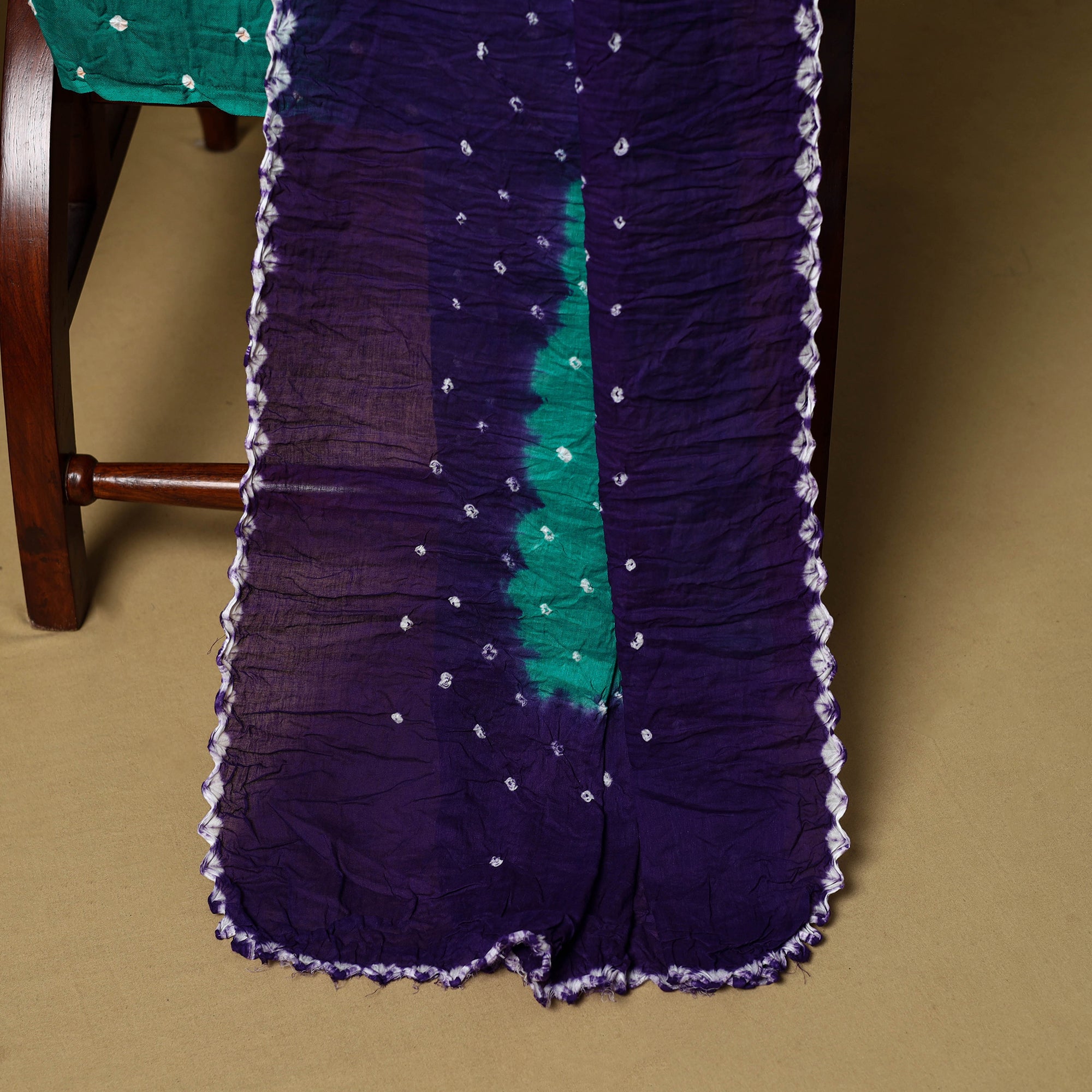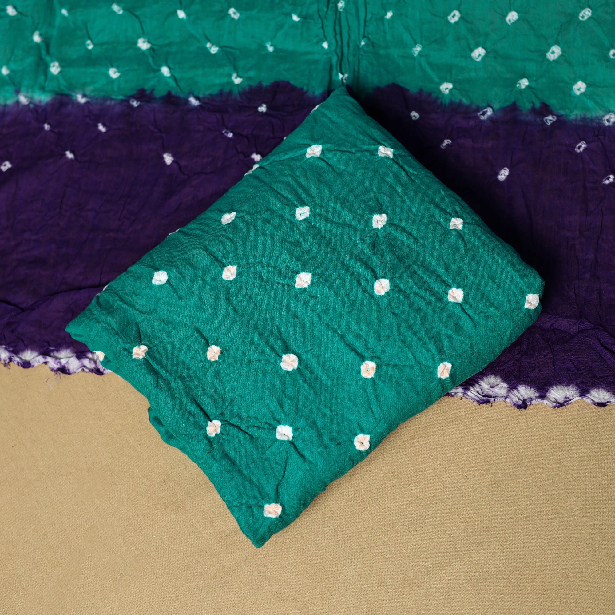 Purple 3pc satin cotton bandhani dress material is crafted by artisan Shabana Khatri from Kutch. Made using the traditional tie & dye technique, each fabric piece shows beautiful bandhani patterns. The set includes fabric for a kurta, bottom and dupatta, giving you the freedom to design your own outfit. Ideal for festive occasions or everyday wear, it adds a vibrant and traditional touch to your wardrobe.