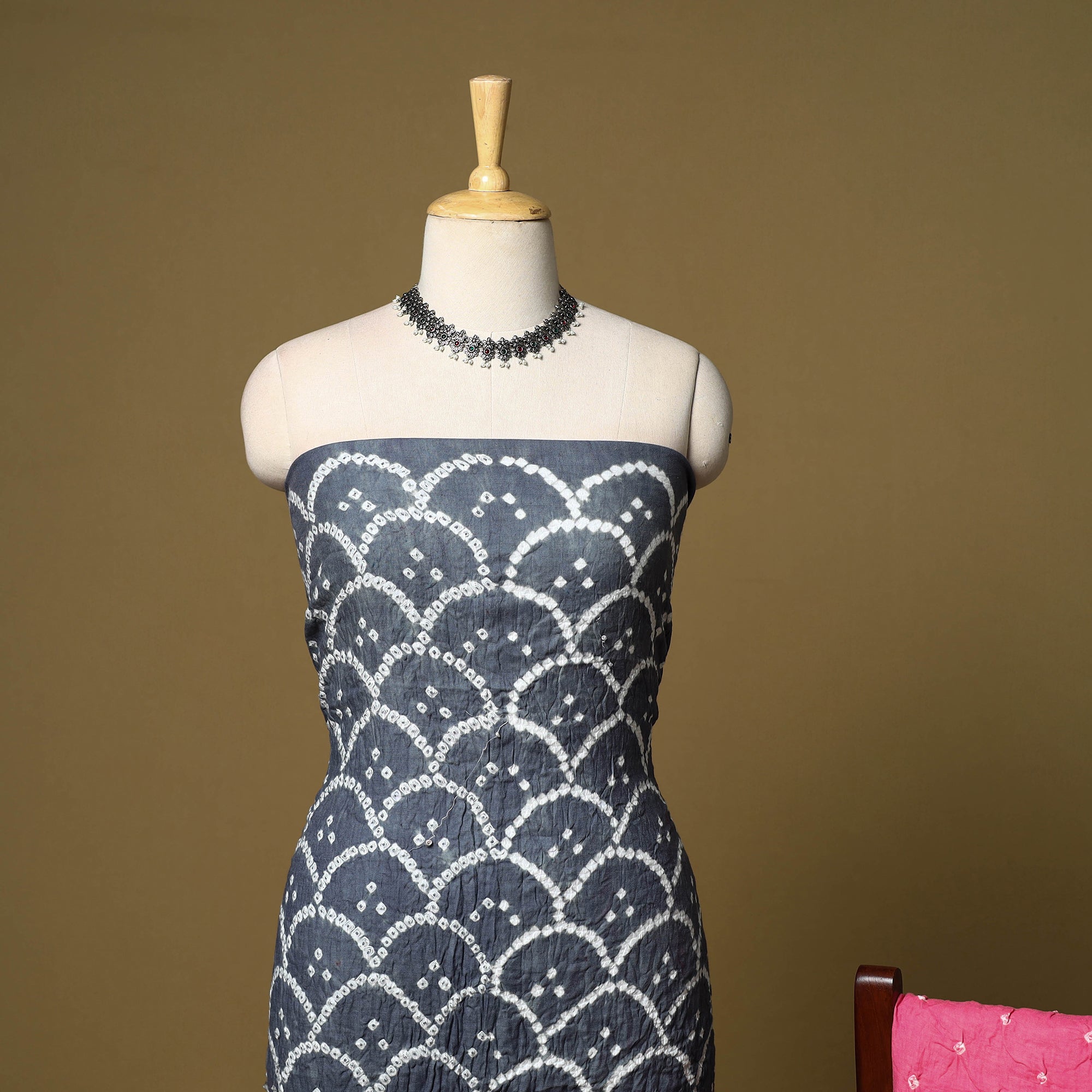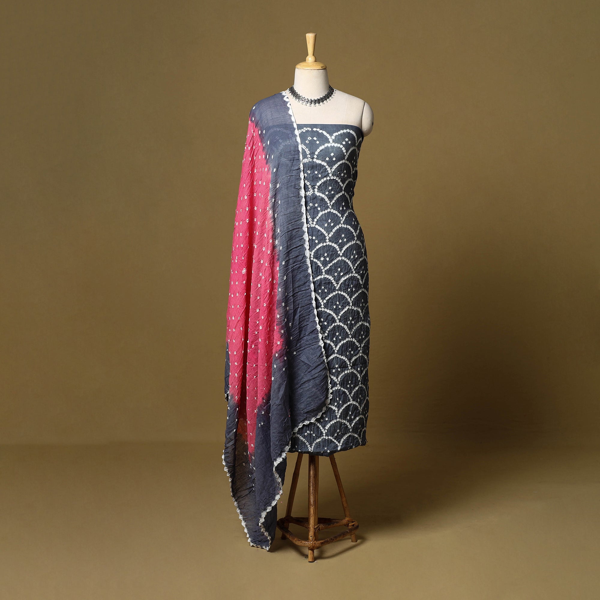 Grey 3pc satin cotton bandhani dress material is crafted by artisan Shabana Khatri from Kutch. Made using the traditional tie & dye technique, each fabric piece shows beautiful bandhani patterns. The set includes fabric for a kurta, bottom and dupatta, giving you the freedom to design your own outfit. Ideal for festive occasions or everyday wear, it adds a vibrant and traditional touch to your wardrobe.