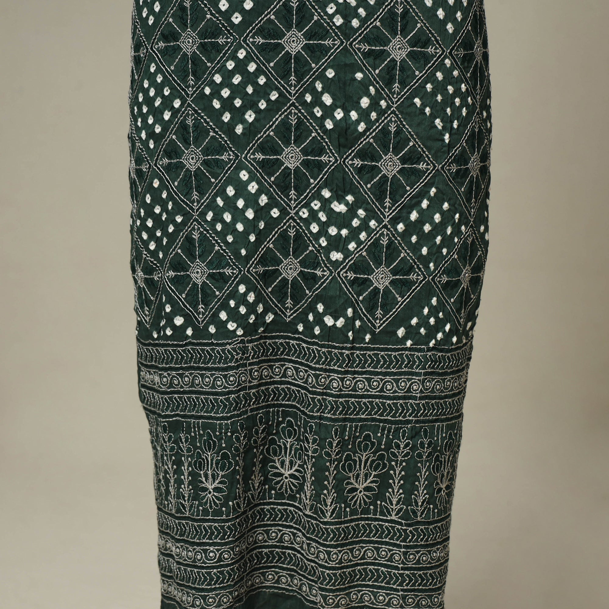 Add a touch of charm to your wardrobe with this green 3pc satin cotton bandhani dress material by artisan Shabana Khatri from Kutch. Crafted using traditional tie-dye techniques, each section of the fabric is carefully hand-tied and dyed to create beautiful, intricate patterns. The set includes fabric for a embroidered kurta, matching bottom, and dupatta. Perfect for festive occasions, everyday comfort, or creating a look that’s uniquely yours.