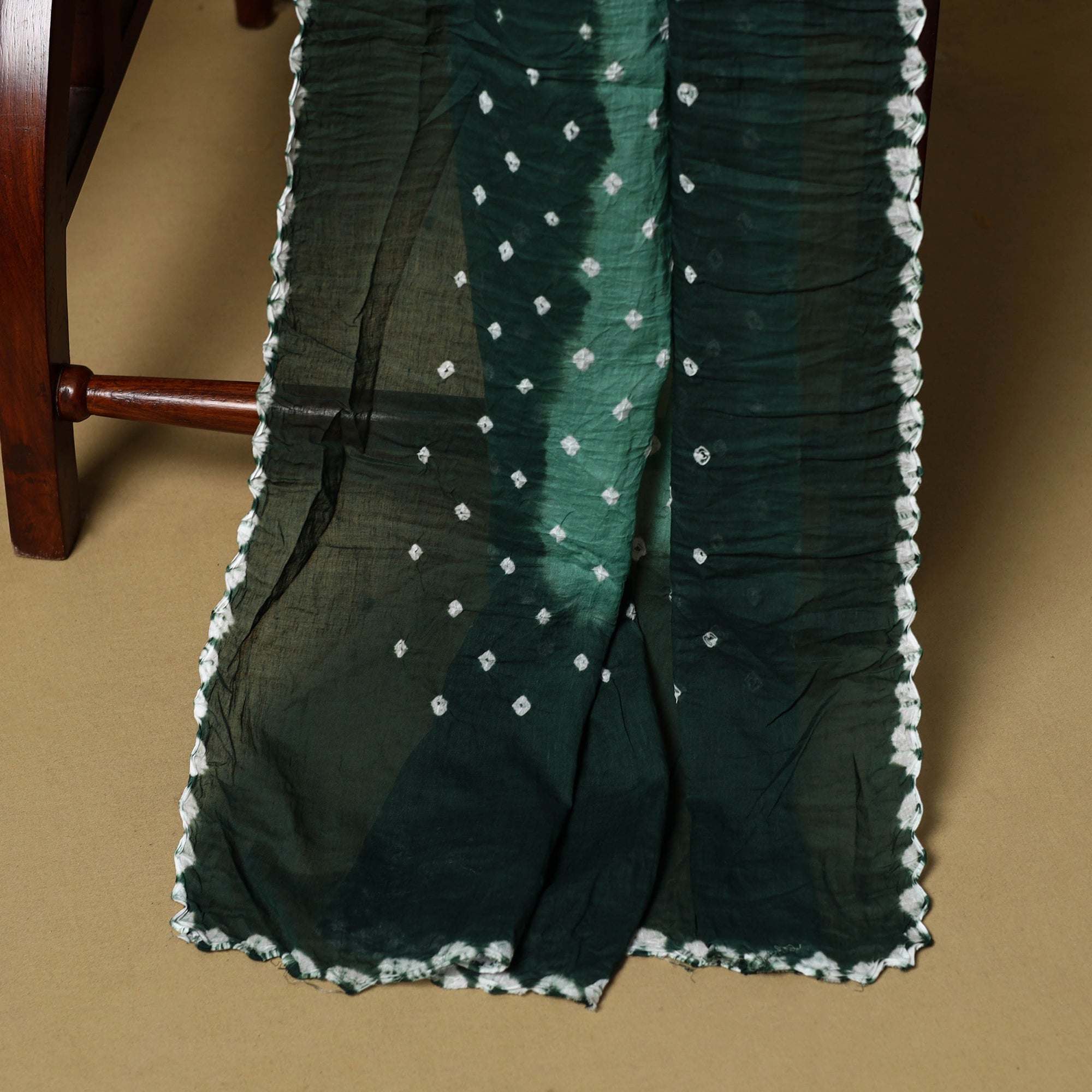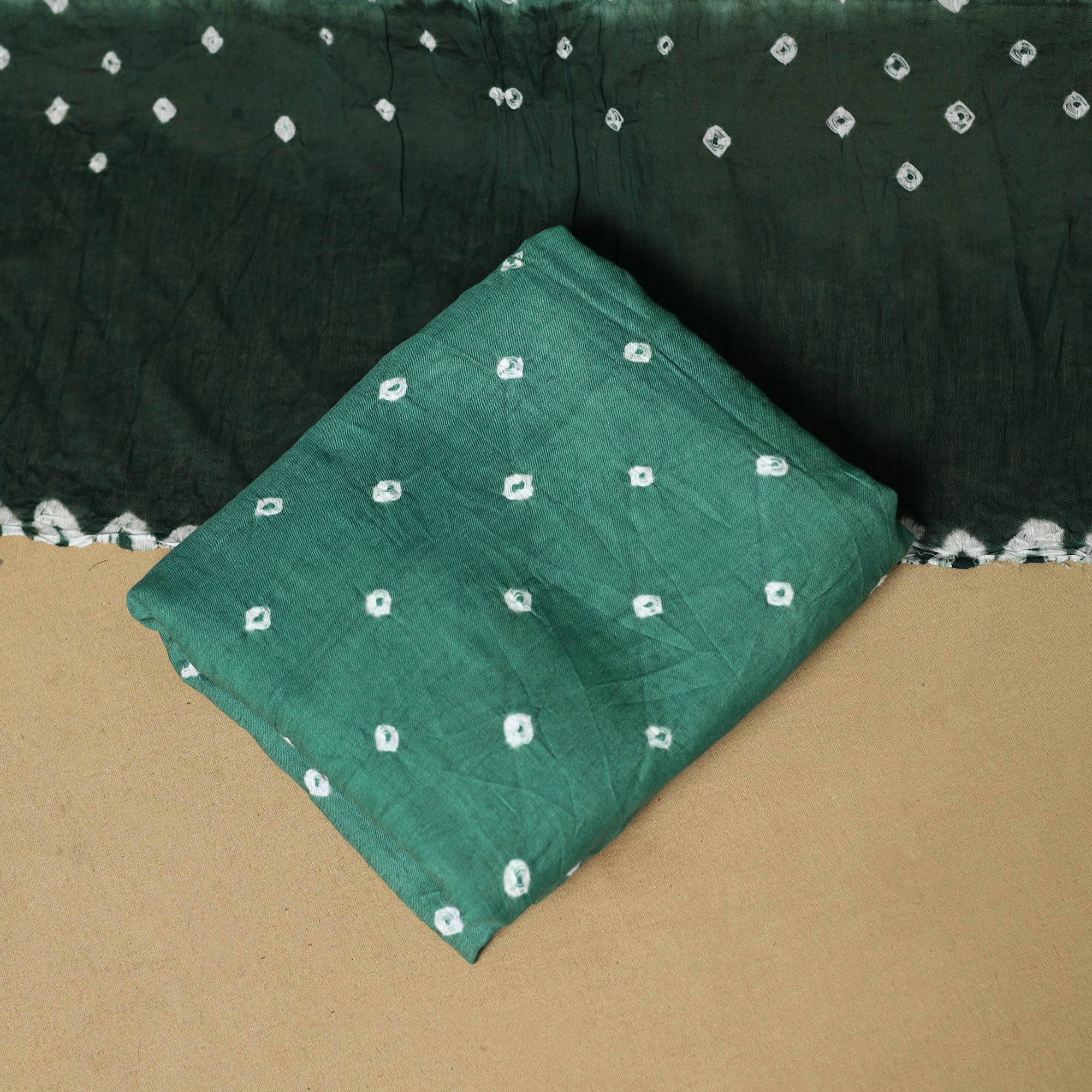 Green 3pc satin cotton bandhani dress material is crafted by artisan Shabana Khatri from Kutch. Made using the traditional tie & dye technique, each fabric piece shows beautiful bandhani patterns. The set includes fabric for a kurta, bottom and dupatta, giving you the freedom to design your own outfit. Ideal for festive occasions or everyday wear, it adds a vibrant and traditional touch to your wardrobe.