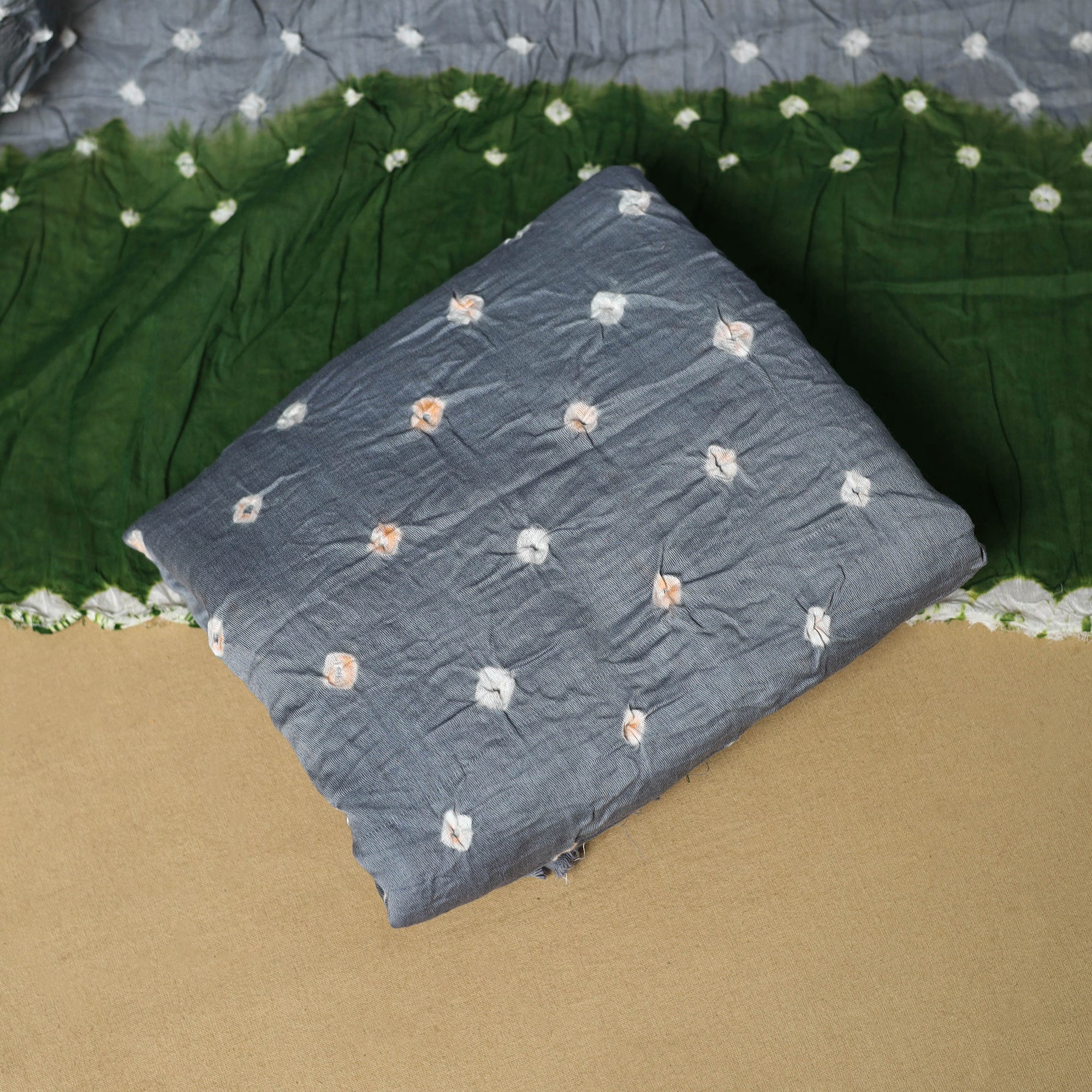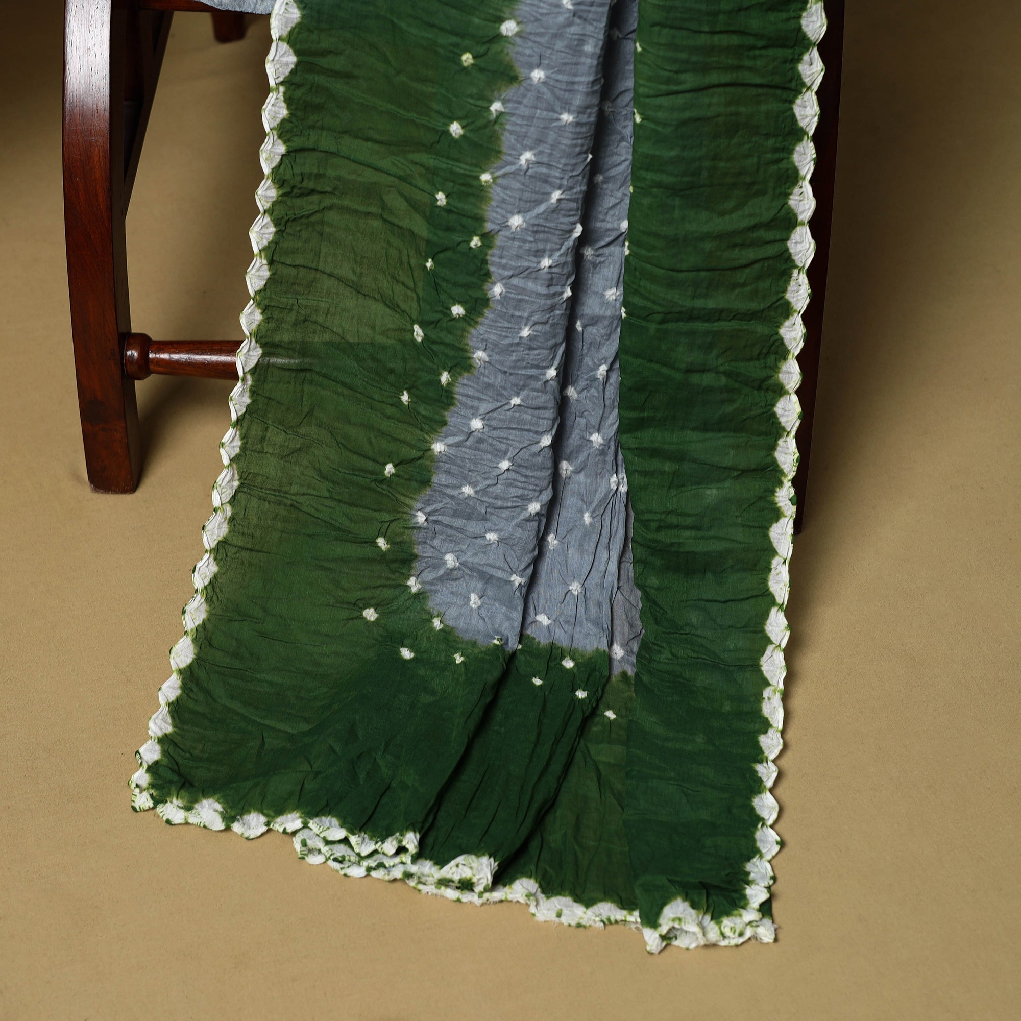 Green 3pc satin cotton bandhani dress material is crafted by artisan Shabana Khatri from Kutch. Made using the traditional tie & dye technique, each fabric piece shows beautiful bandhani patterns. The set includes fabric for a kurta, bottom and dupatta, giving you the freedom to design your own outfit. Ideal for festive occasions or everyday wear, it adds a vibrant and traditional touch to your wardrobe.