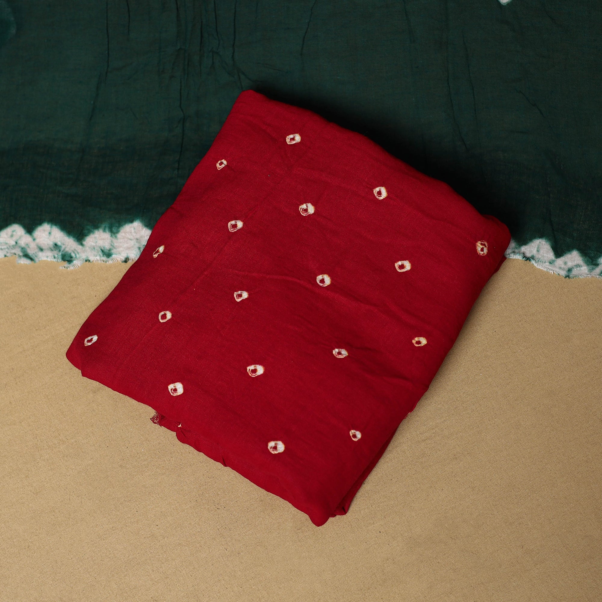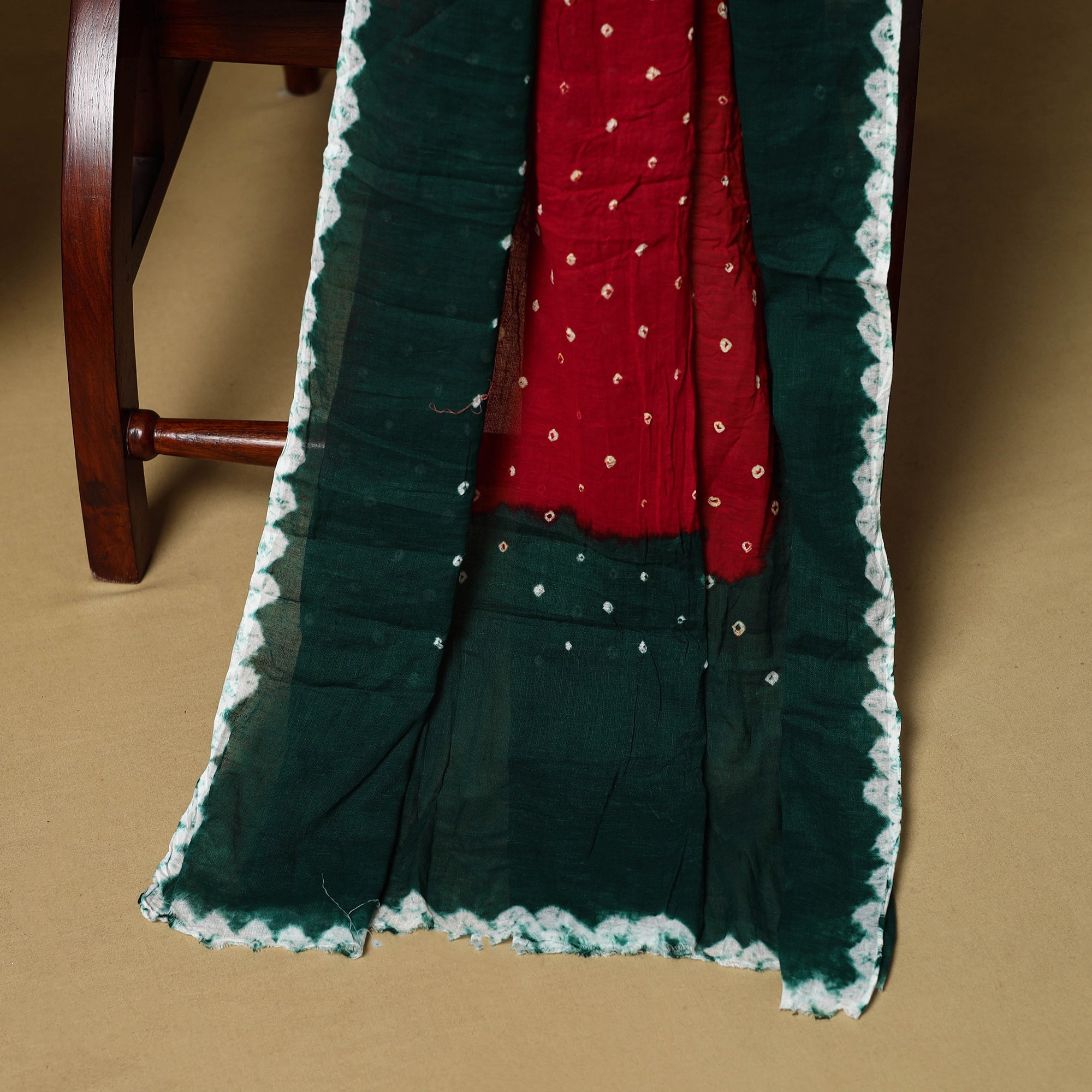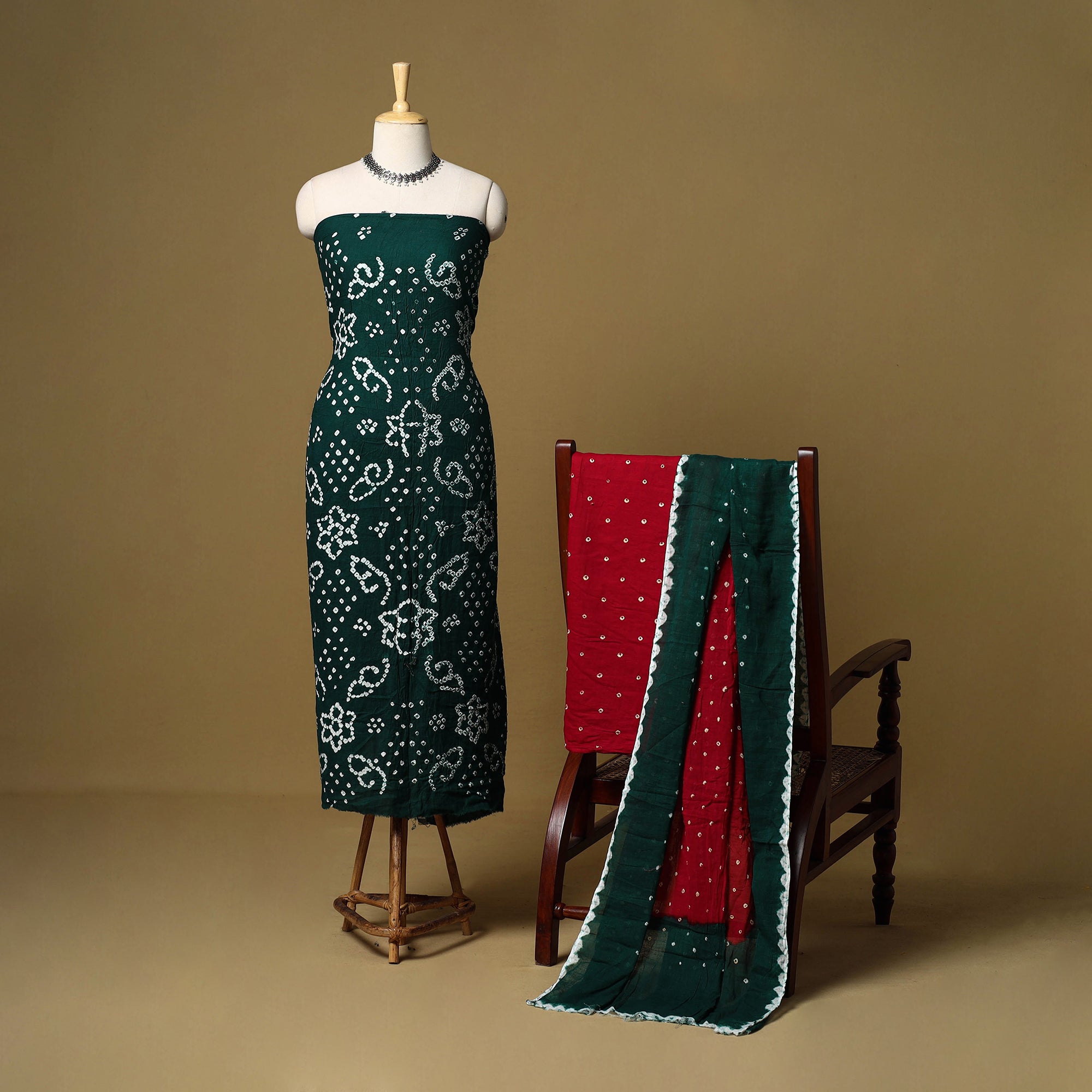 Green 3pc satin cotton bandhani dress material is crafted by artisan Shabana Khatri from Kutch. Made using the traditional tie & dye technique, each fabric piece shows beautiful bandhani patterns. The set includes fabric for a kurta, bottom and dupatta, giving you the freedom to design your own outfit. Ideal for festive occasions or everyday wear, it adds a vibrant and traditional touch to your wardrobe.
