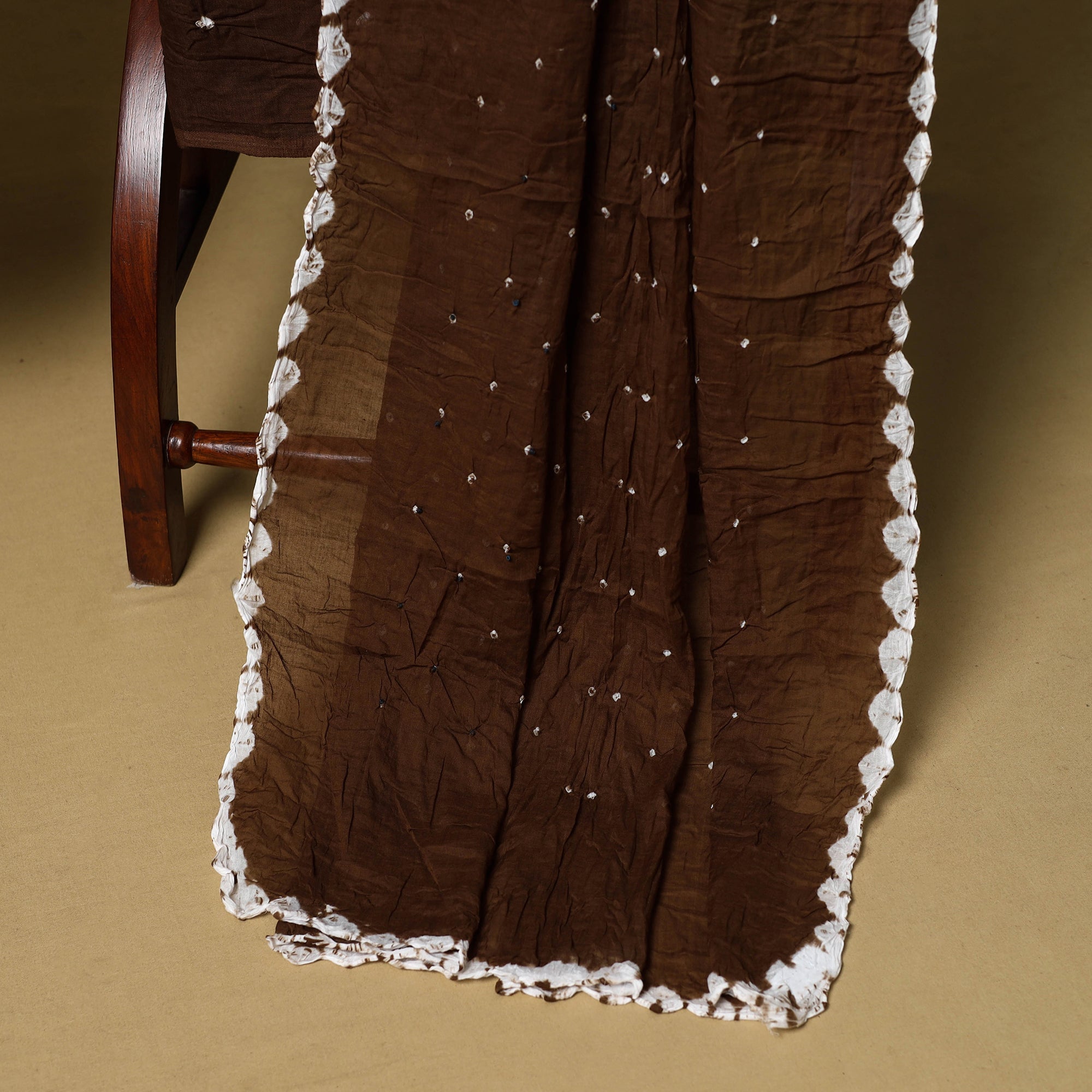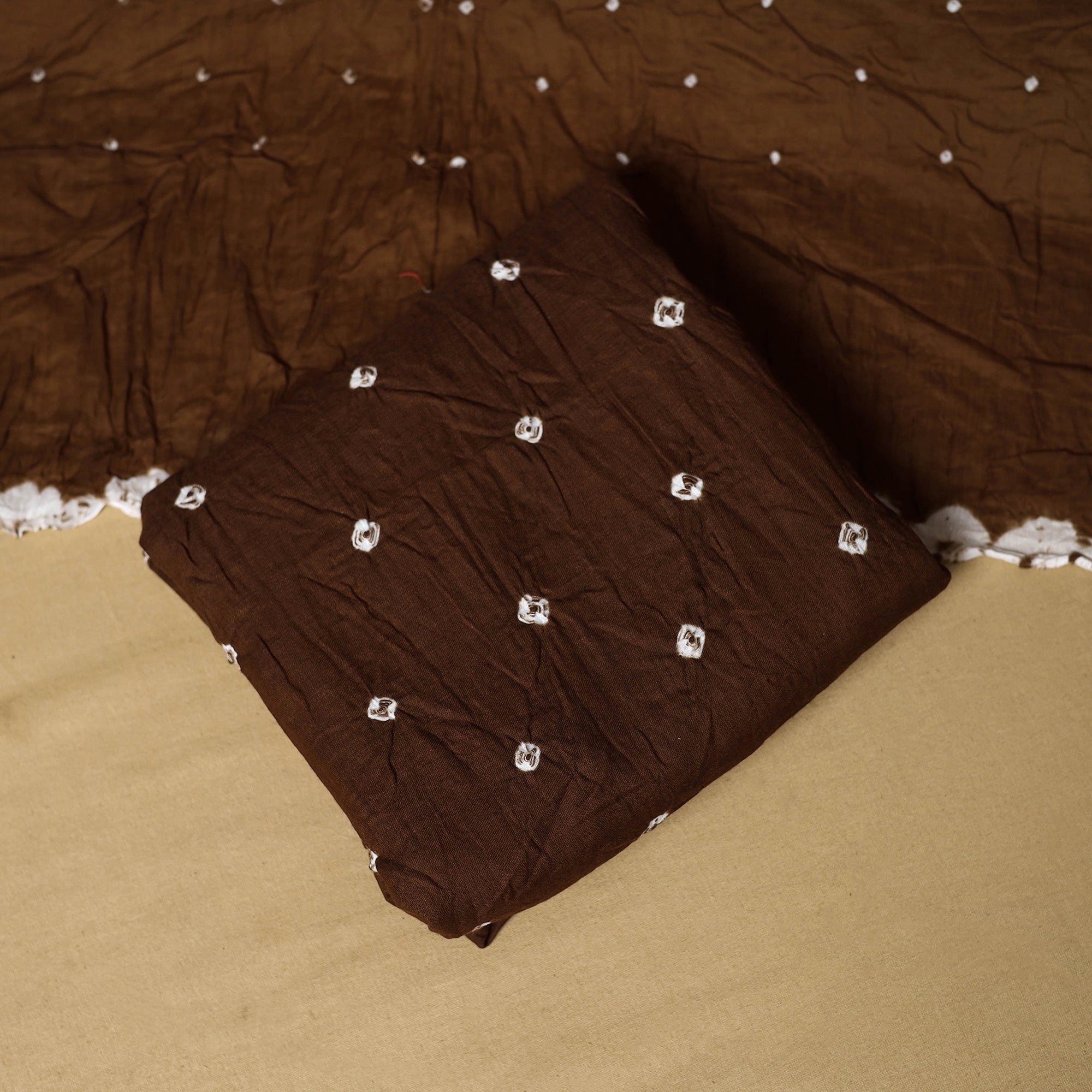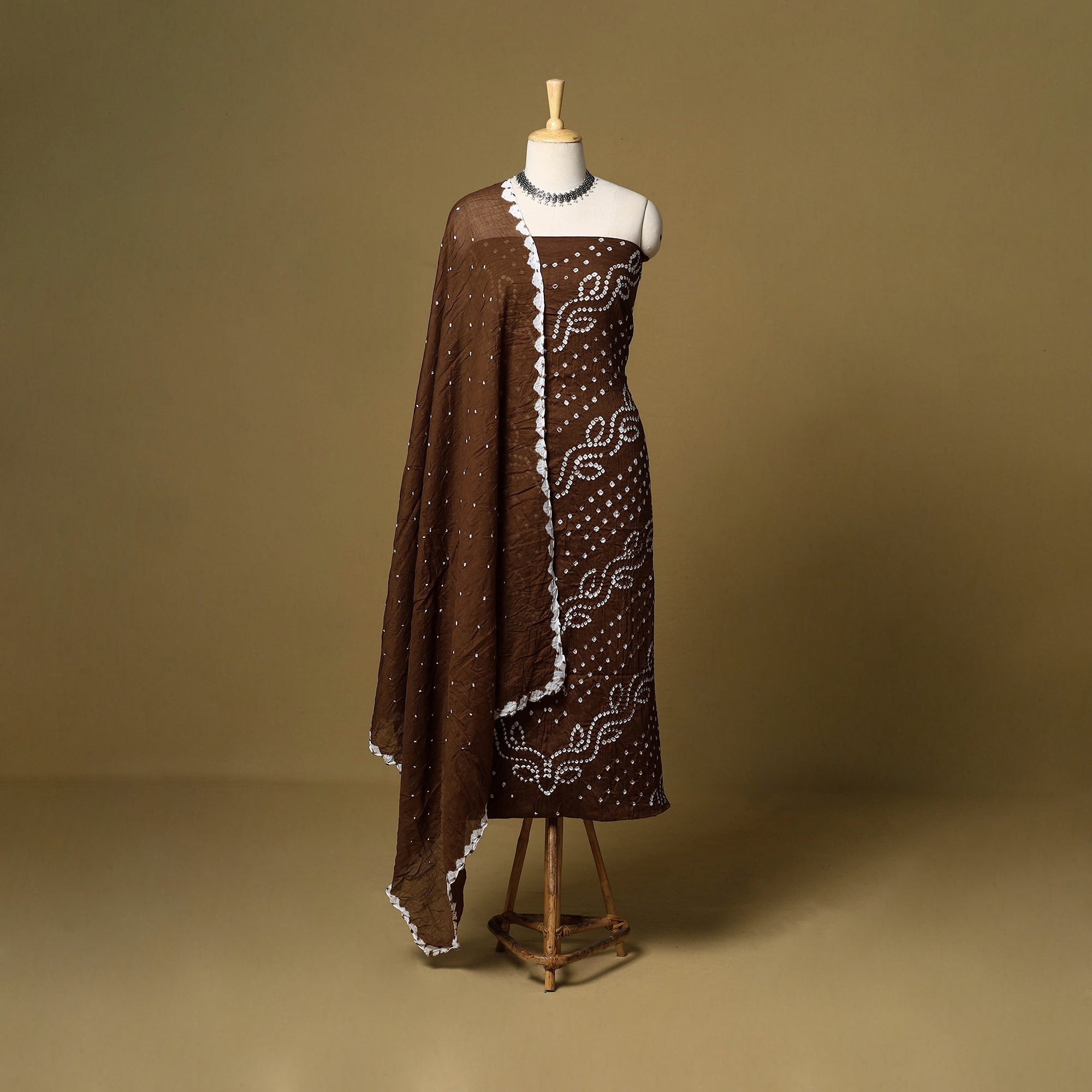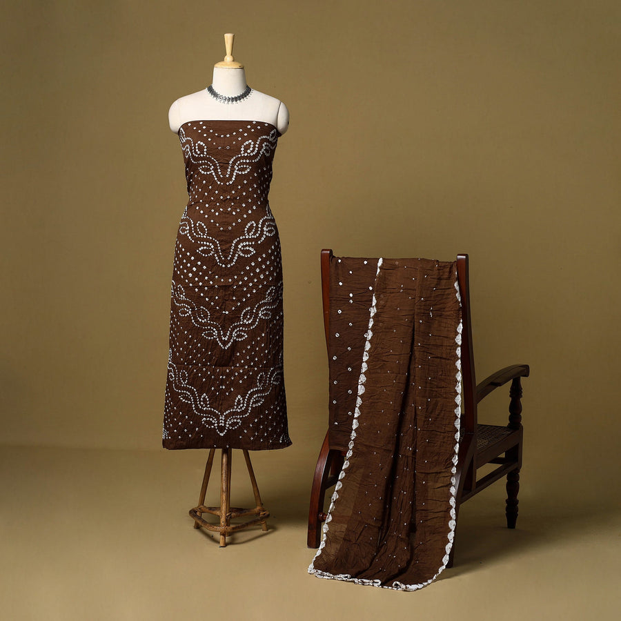 Brown 3pc satin cotton bandhani dress material is crafted by artisan Shabana Khatri from Kutch. Made using the traditional tie & dye technique, each fabric piece shows beautiful bandhani patterns. The set includes fabric for a kurta, bottom and dupatta, giving you the freedom to design your own outfit. Ideal for festive occasions or everyday wear, it adds a vibrant and traditional touch to your wardrobe.